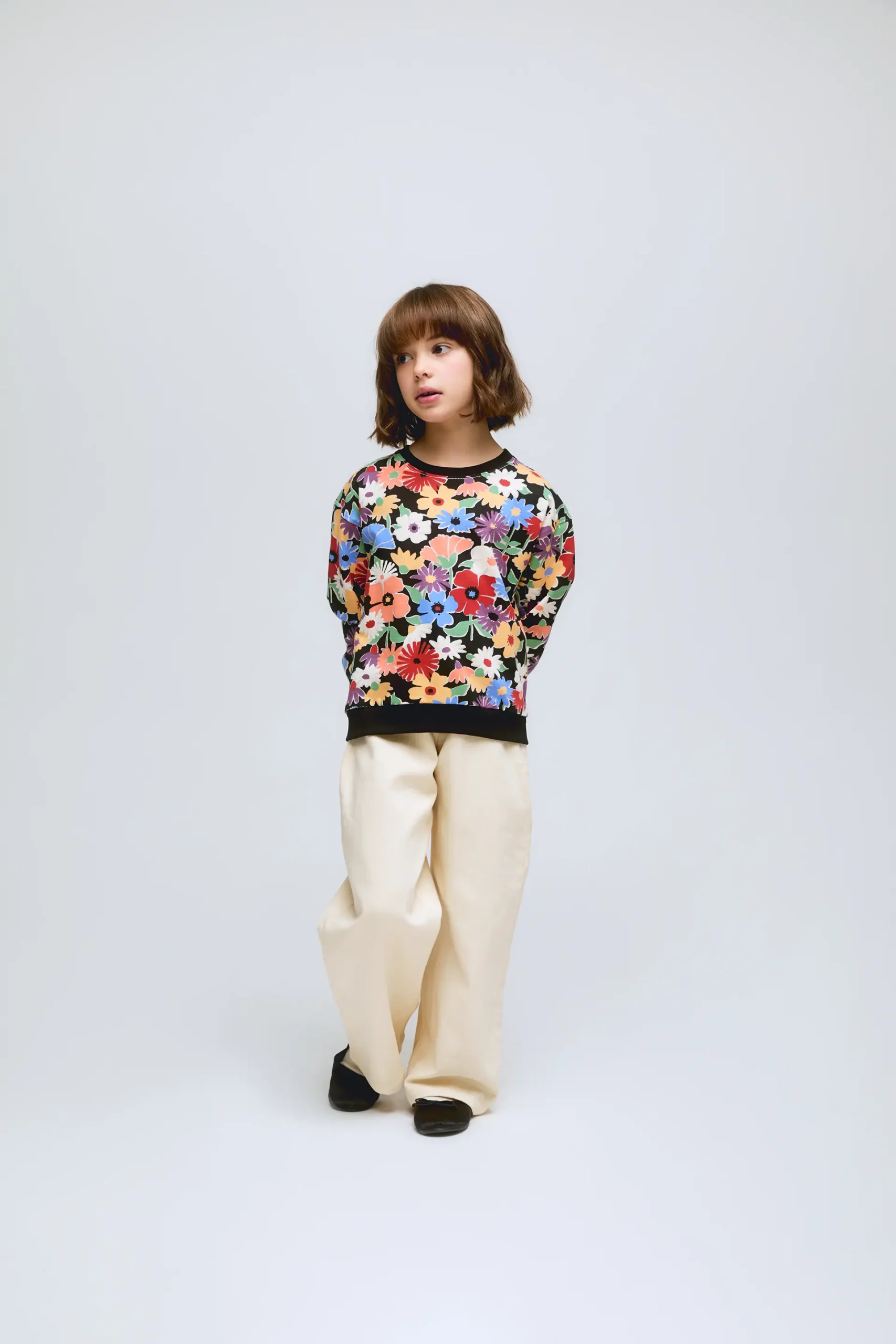 Sudadera de niña en algodón con estampado de flores multicolor con cuello redondo, puños y bajo en rib acanalado negro.