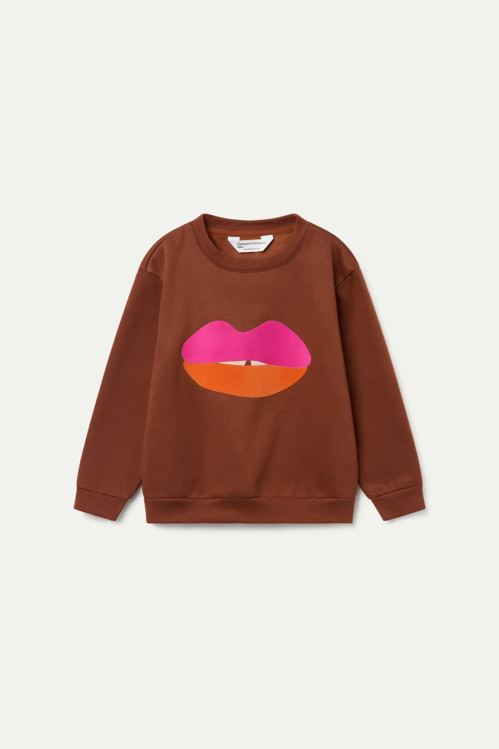 Sudadera de niña marrón con estampado de labios en fucsia y naranja.