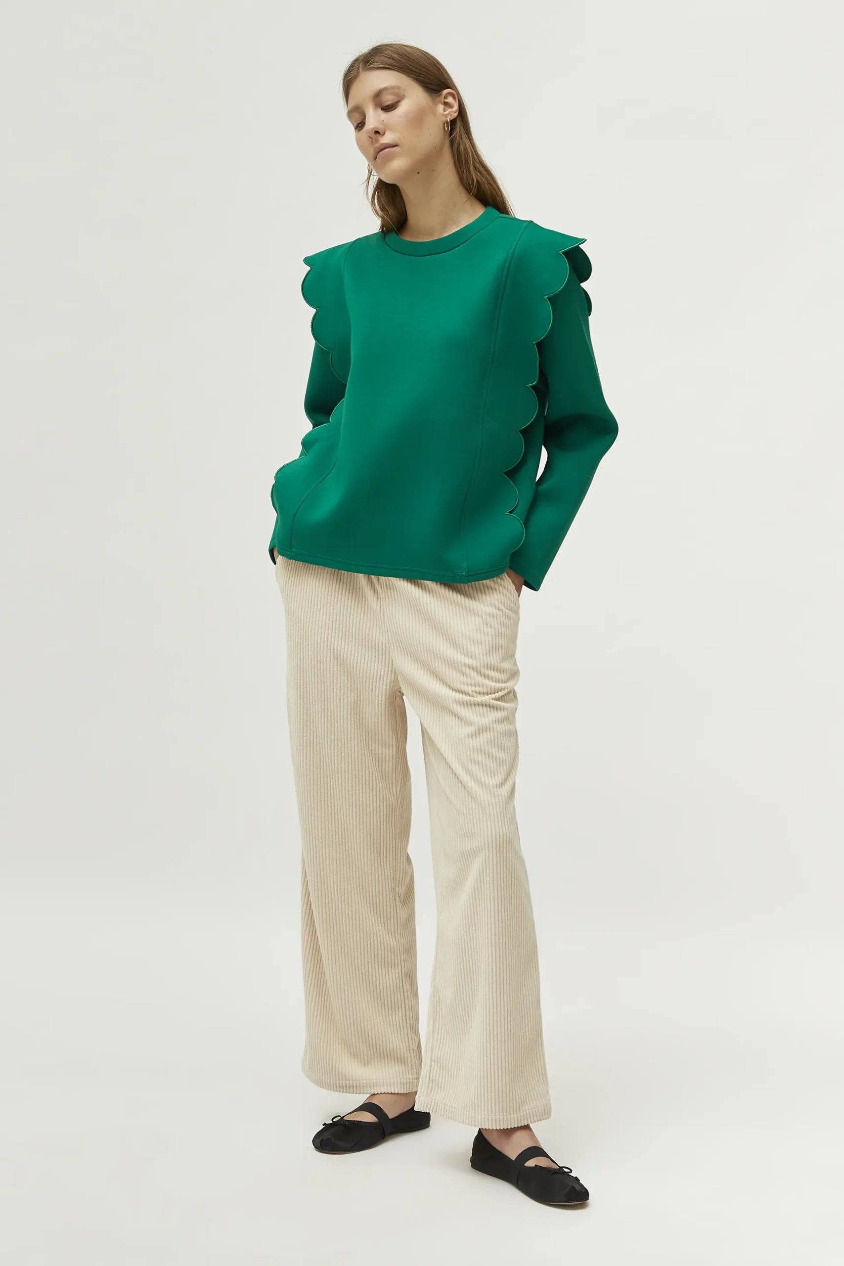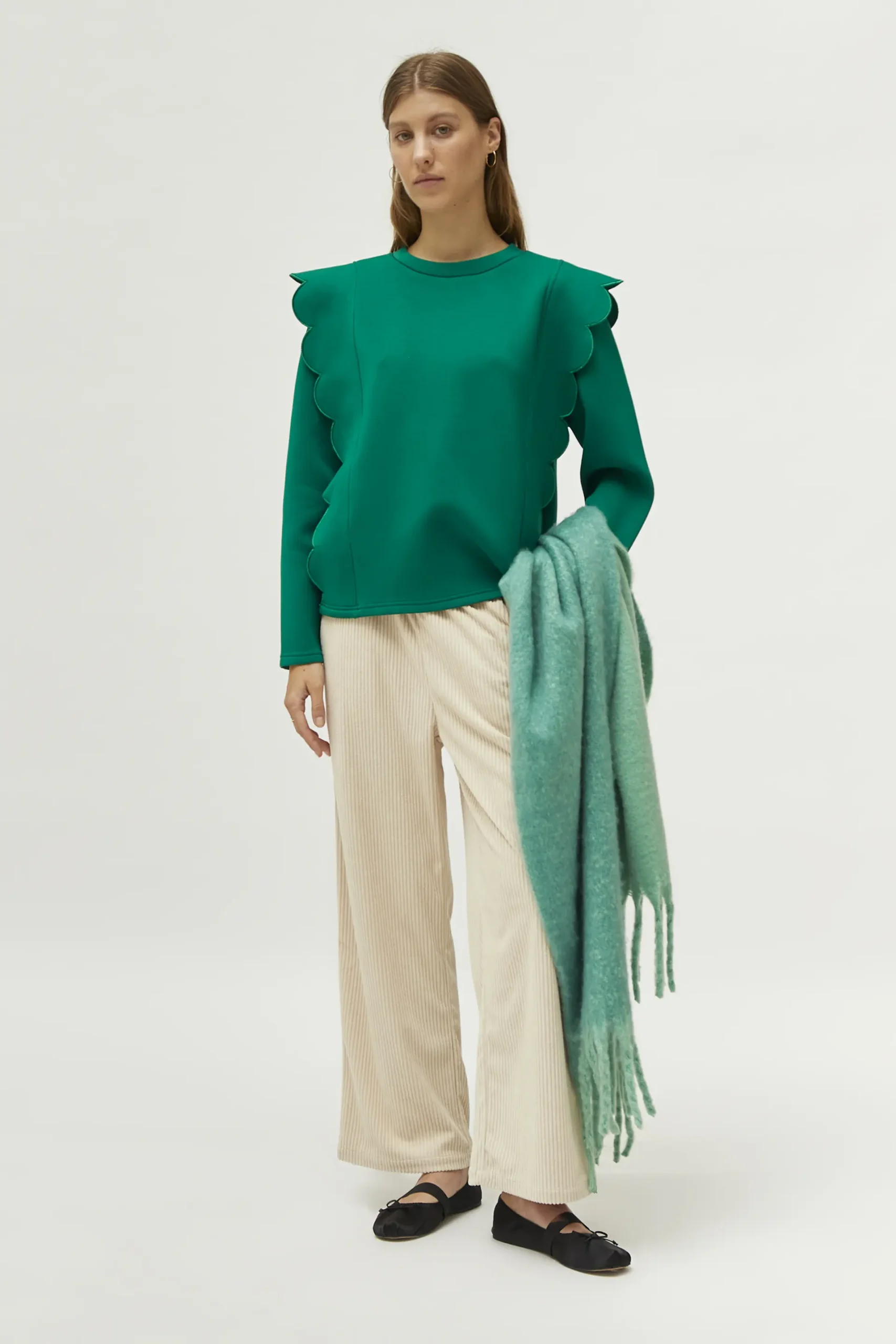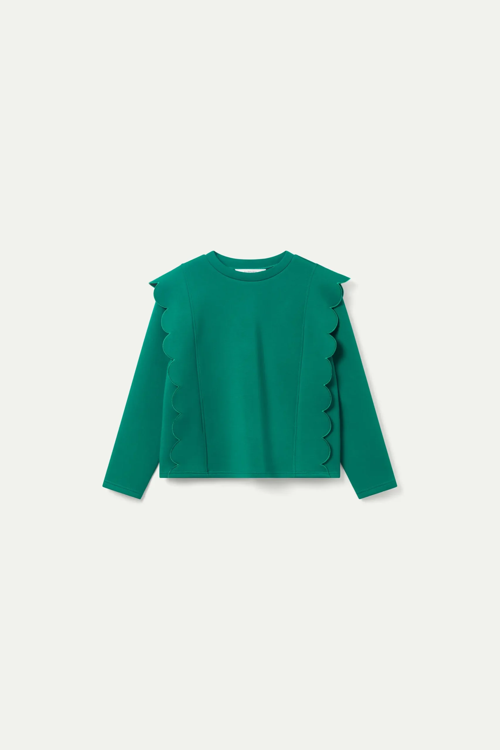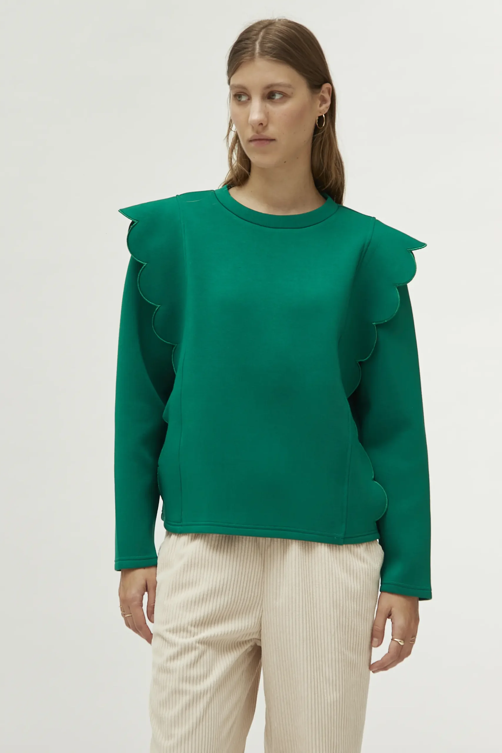 Sudadera de neopreno de color verde. Con cuello redondo y manga larga. Detalle de ondas en los laterales. La modelo mide 177 cm y lleva la talla S.