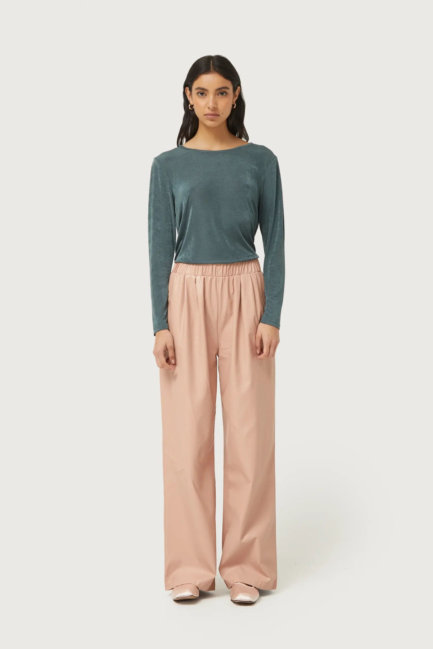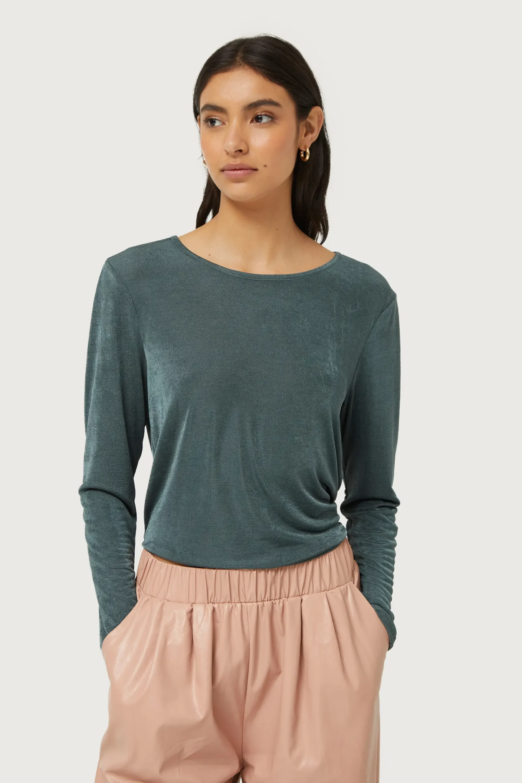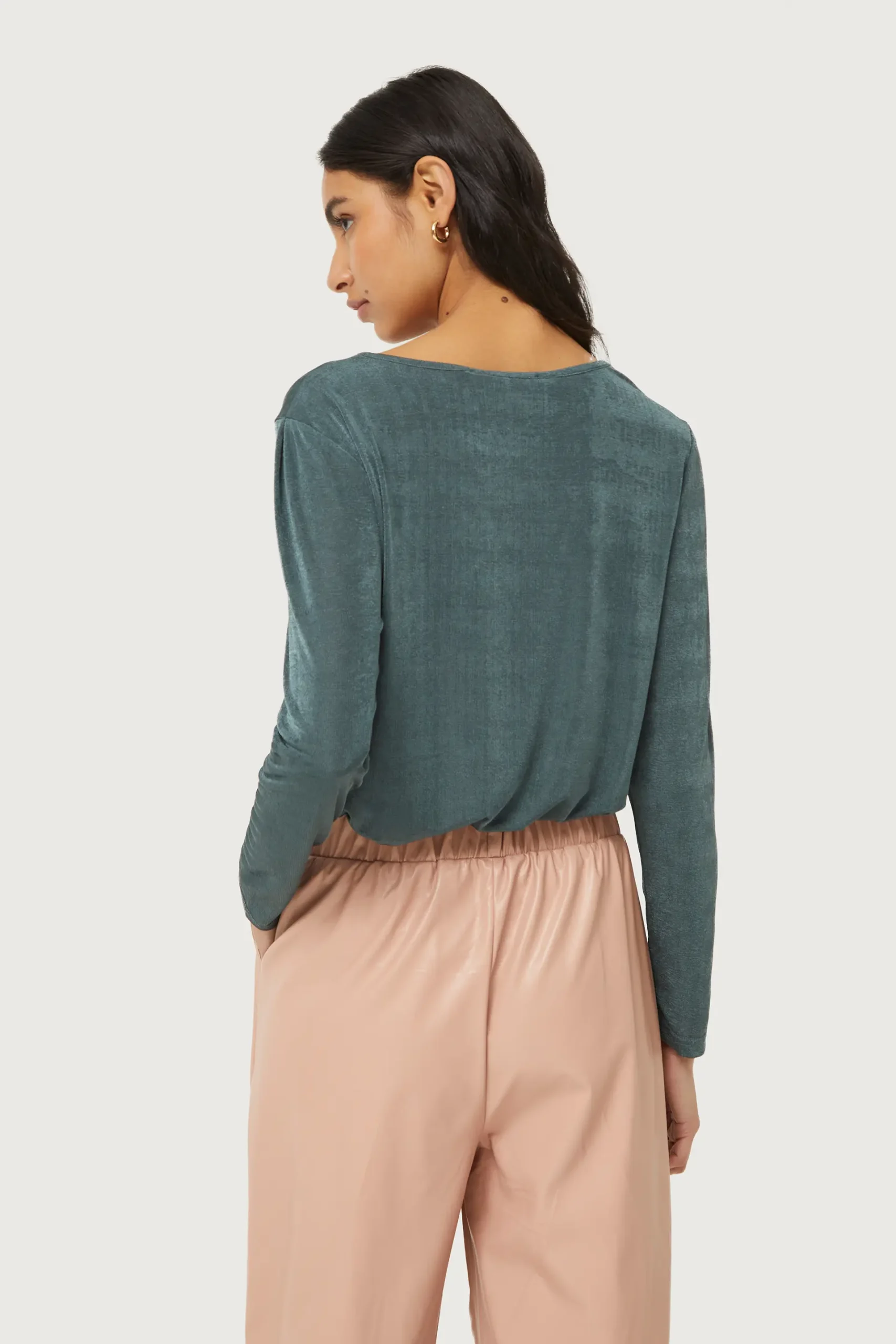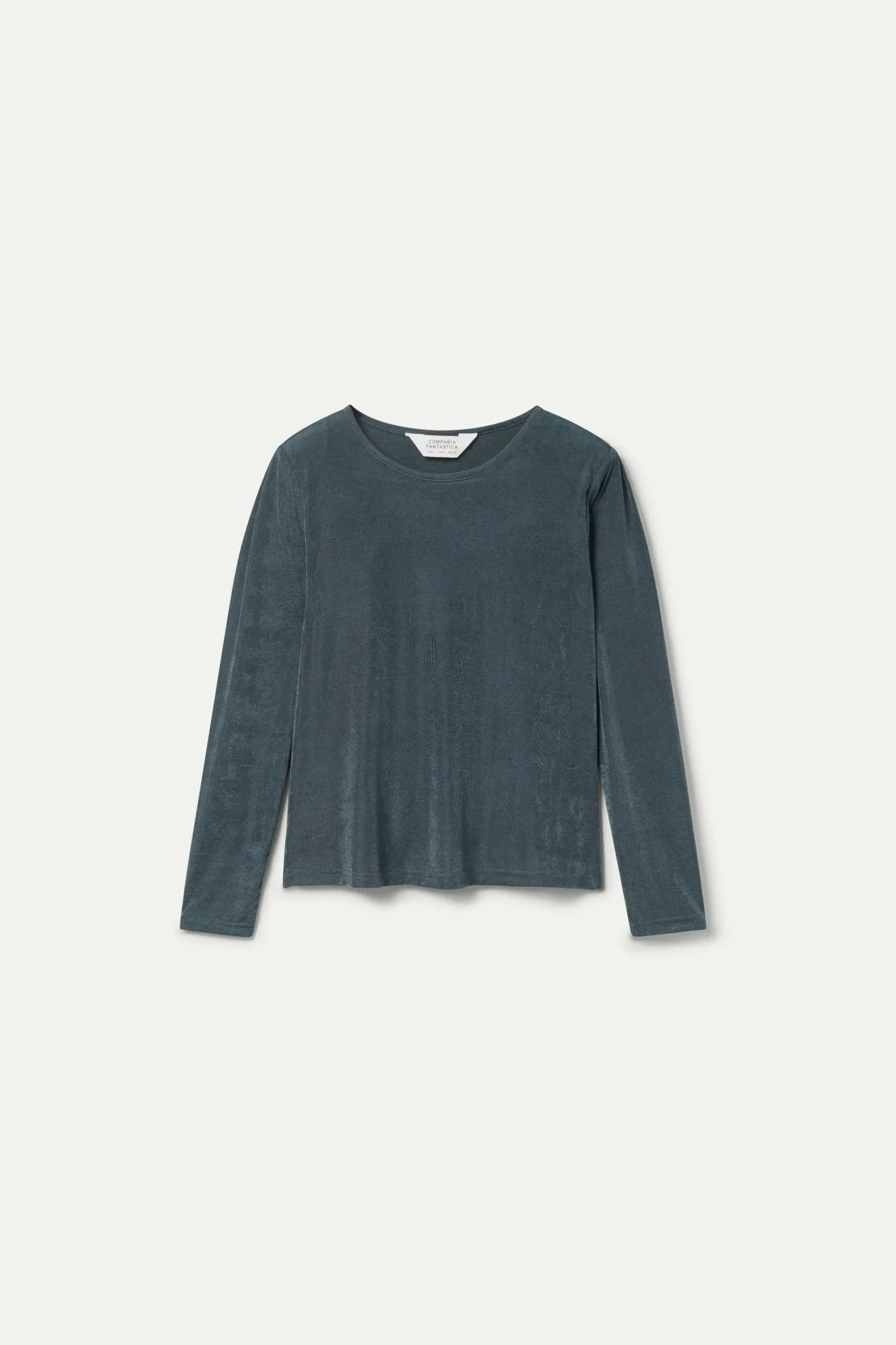 Top de punto con acabado brillante de color gris. Con cuello redondo y manga larga. La modelo mide 176 cm y lleva la talla S.