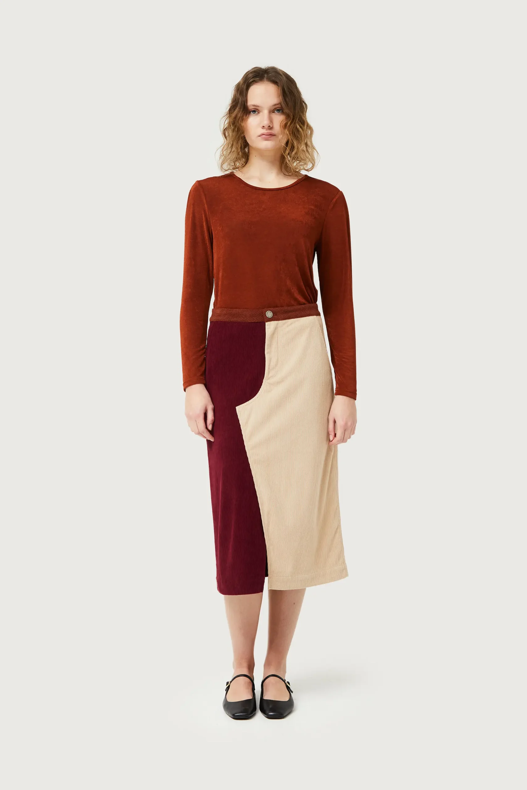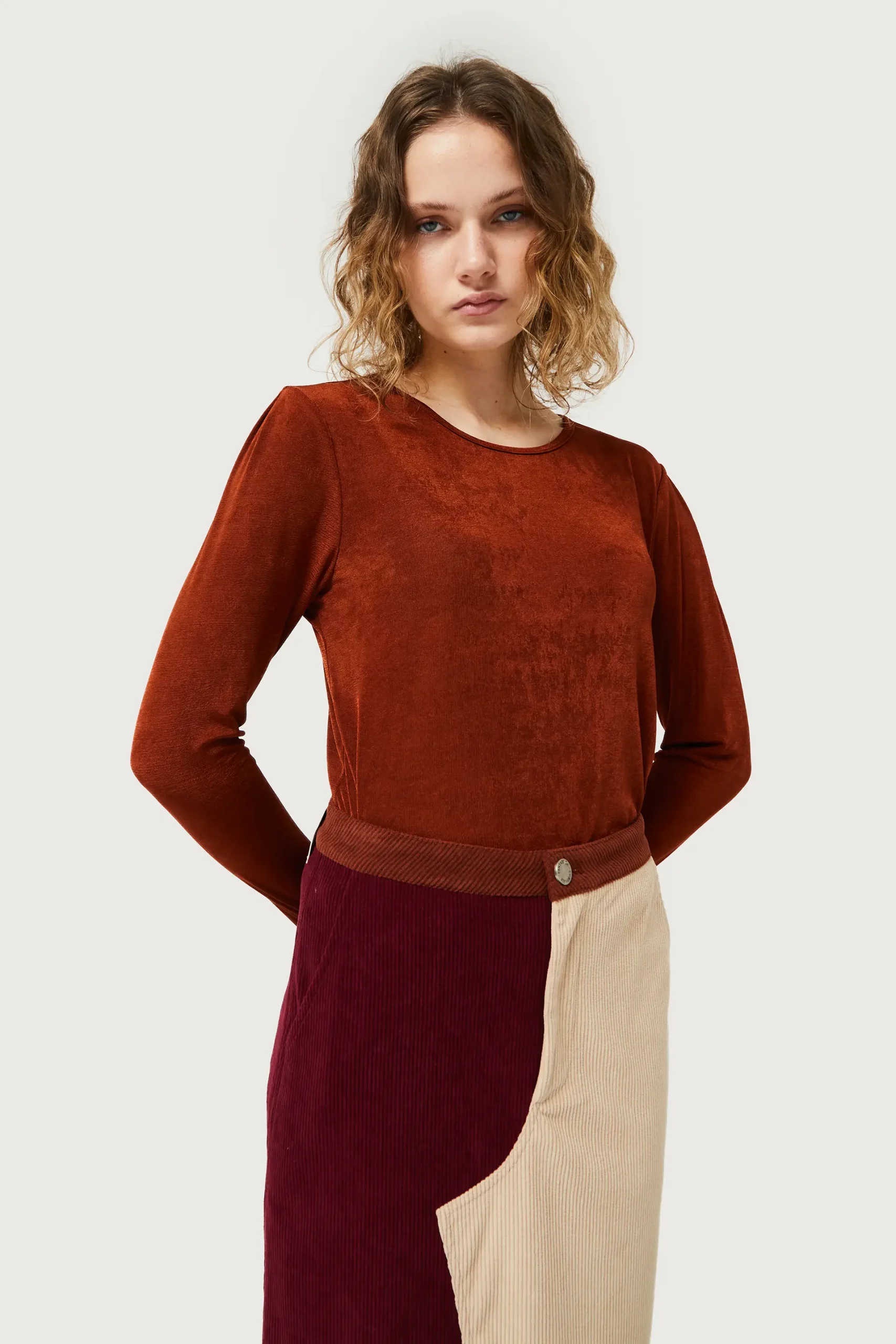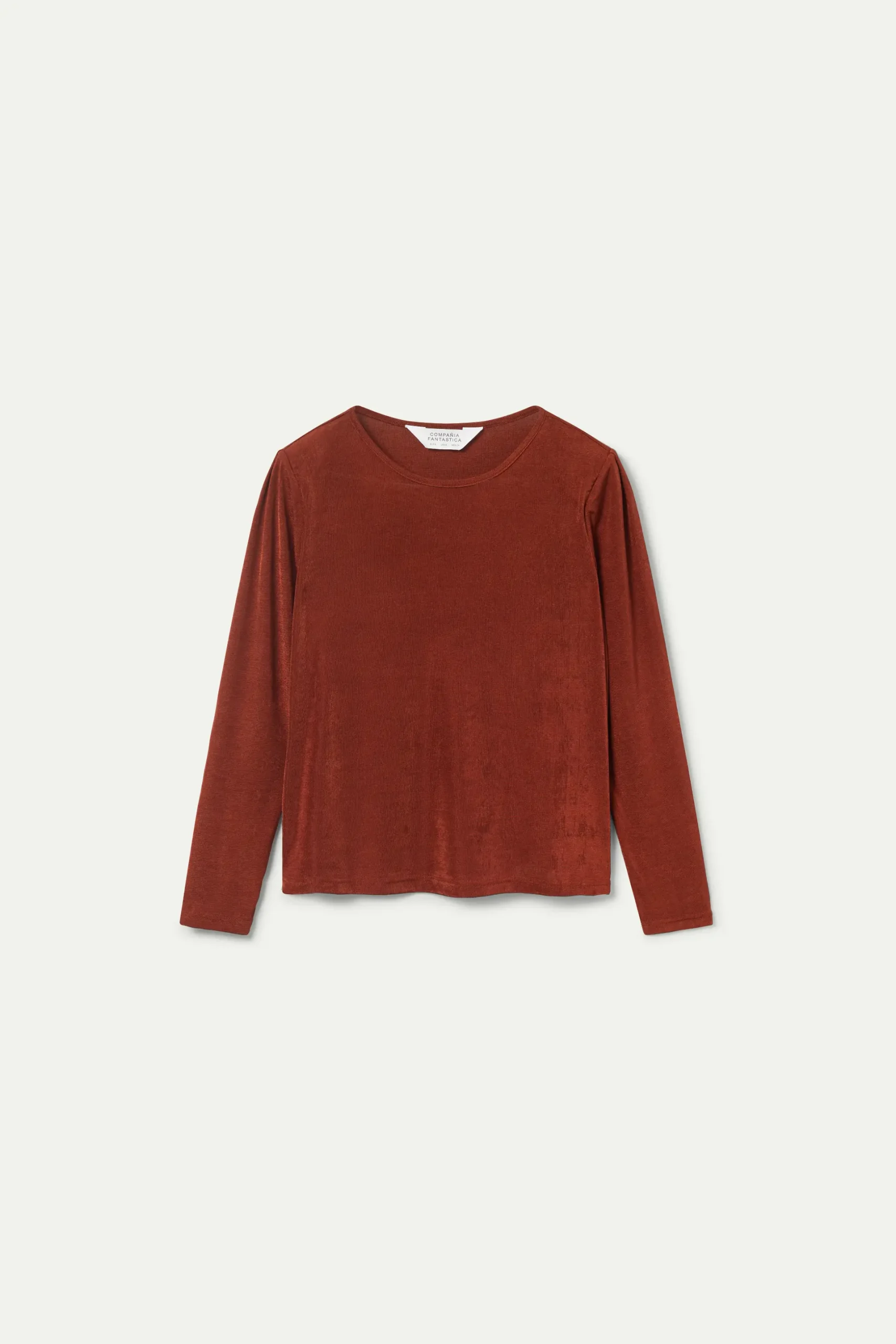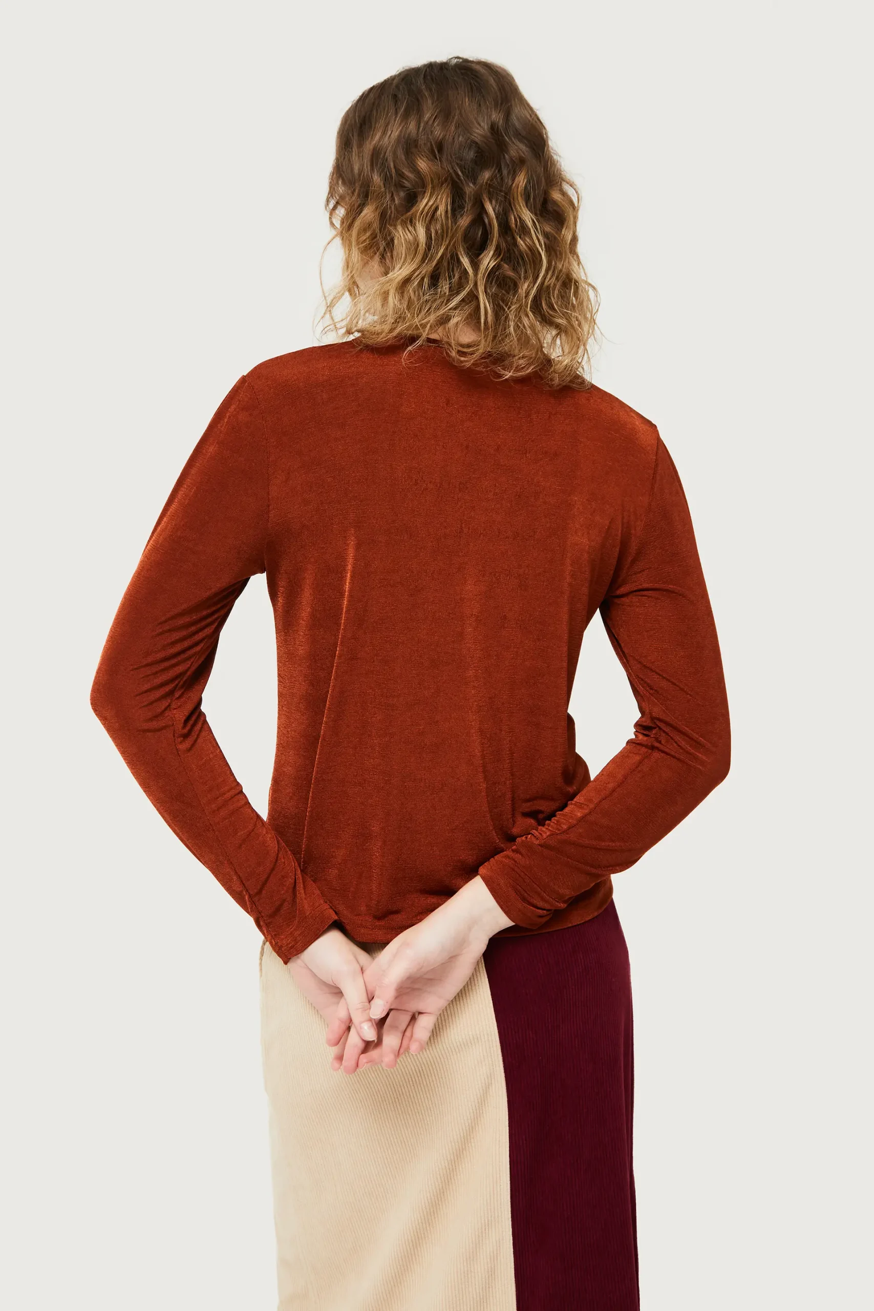 Top de punto con acabado brillante de color marrón. Con cuello redondo y manga larga. La modelo mide 175 cm y lleva la talla S.