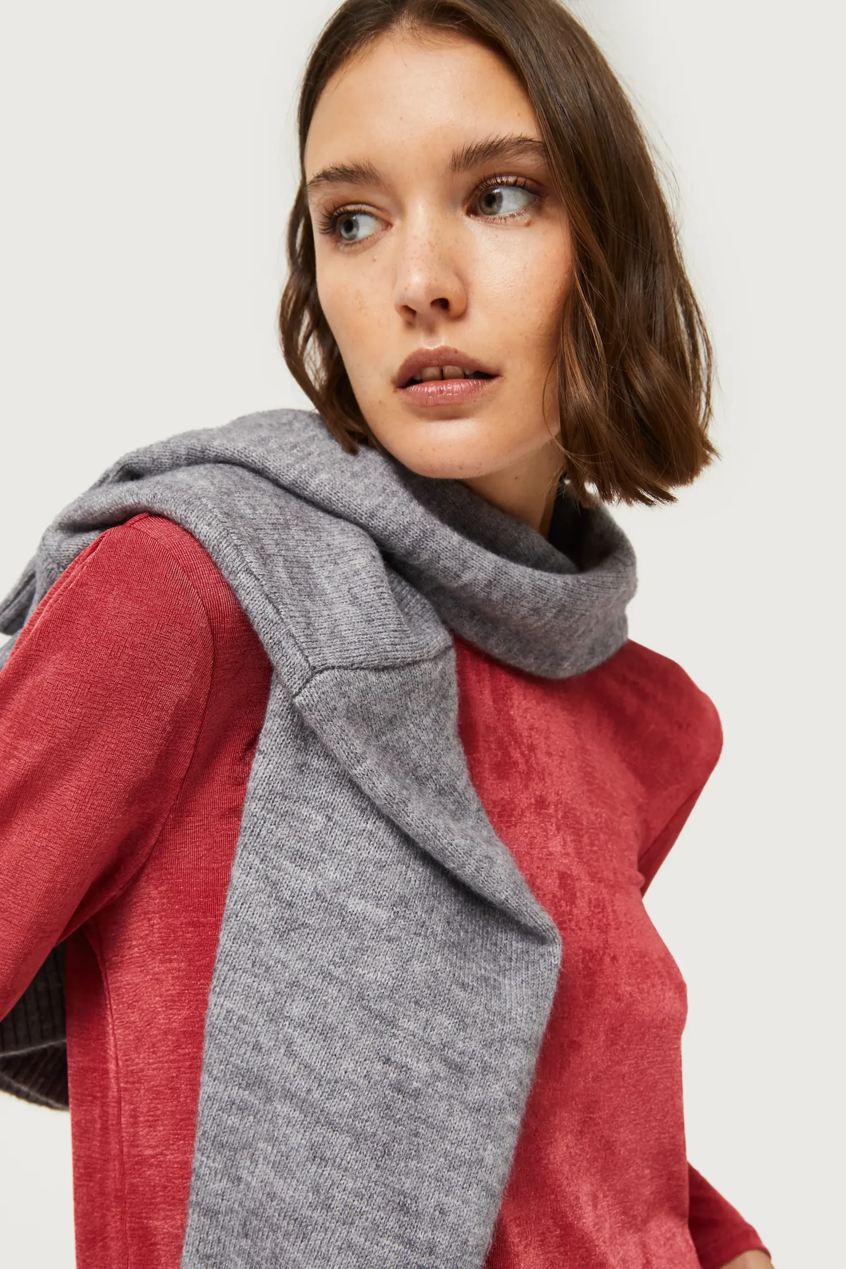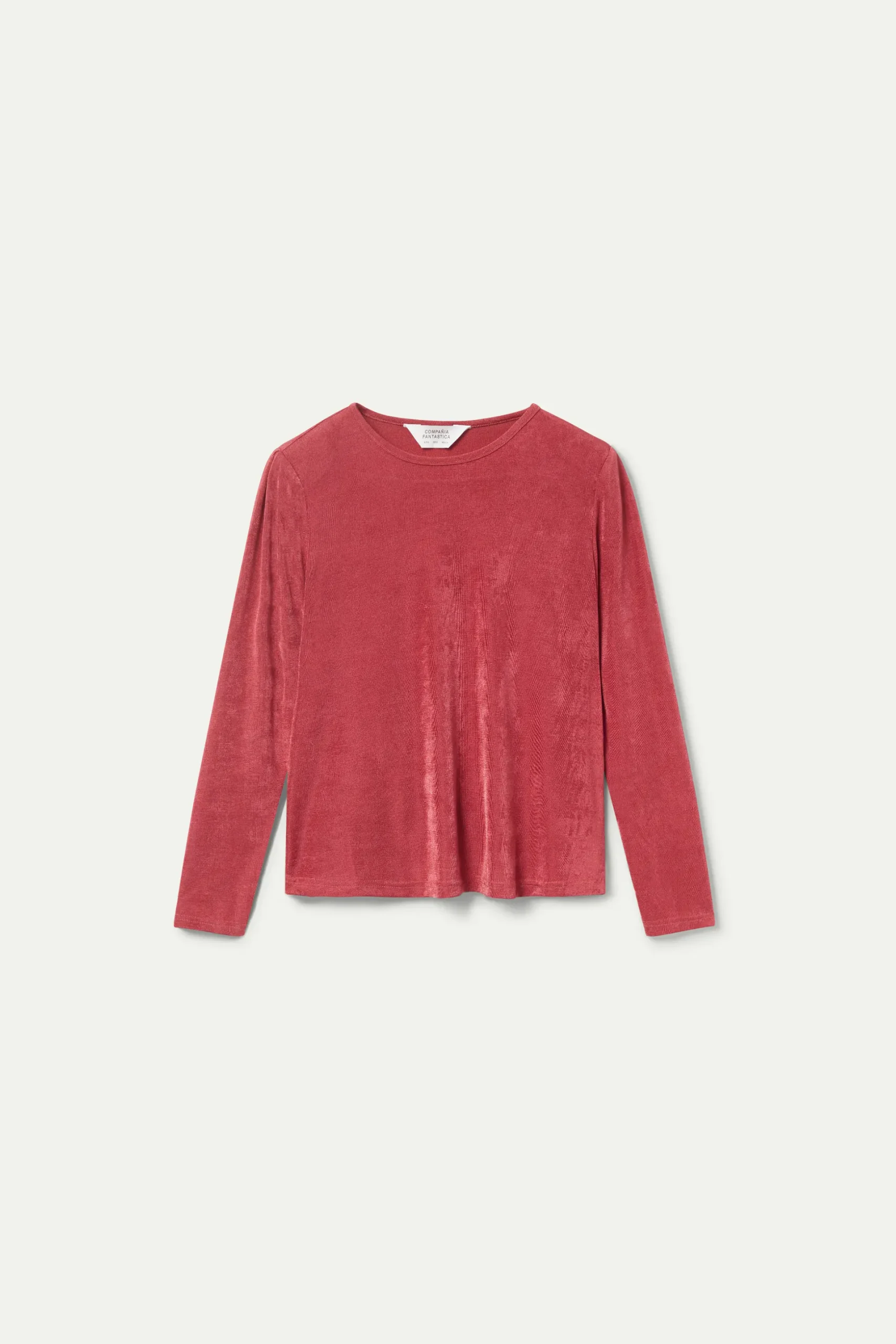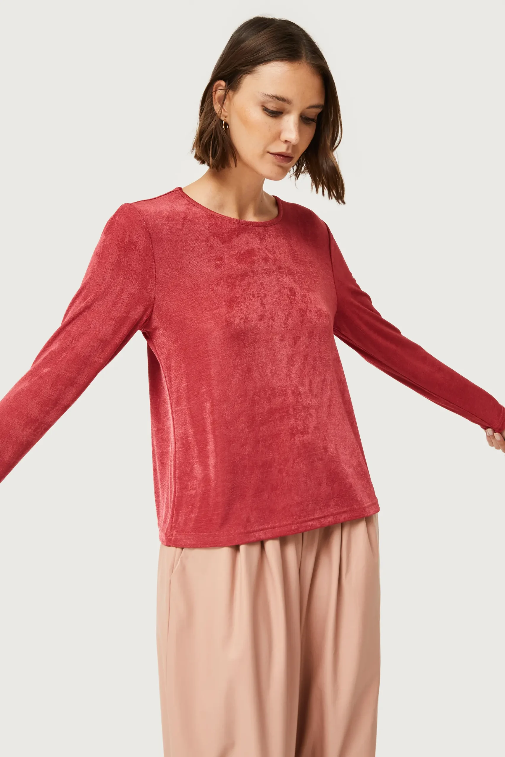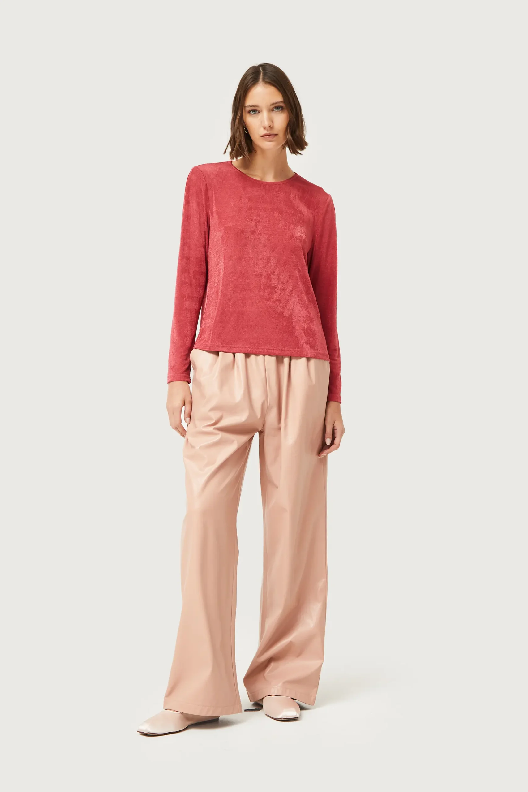 Top de punto con acabado brillante de color rosa. Con cuello redondo y manga larga. La modelo mide 176 cm y lleva la talla S.