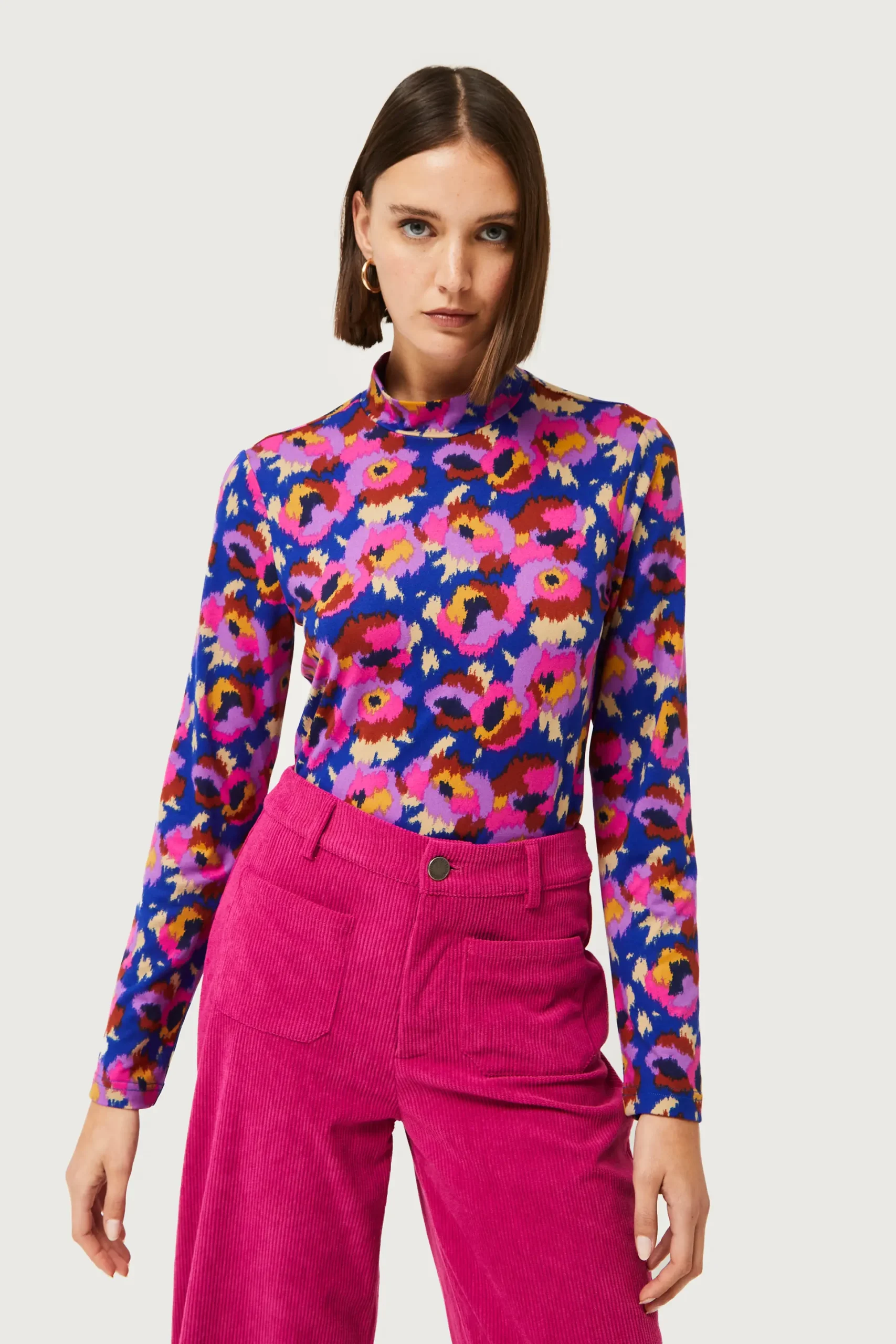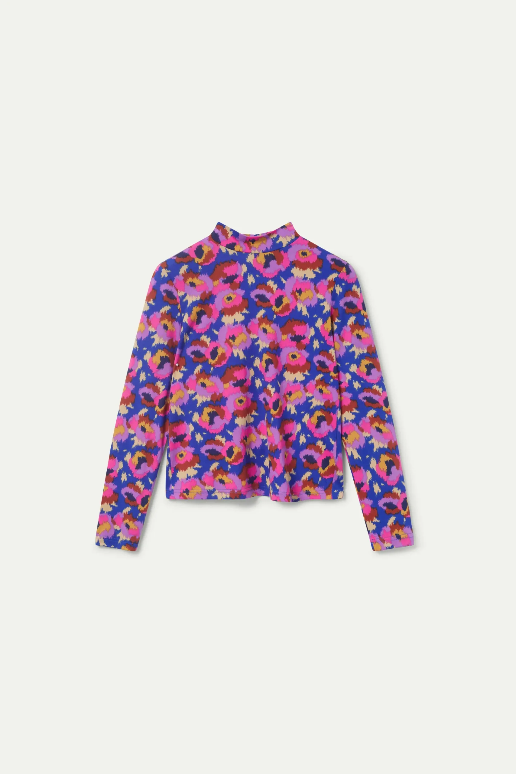 Top de color negro con estampado de flores de color azul, morado, rosa, marrón, amarillo y blanco. Con cuello mock y manga larga. La modelo mide 176 cm y lleva la talla S.