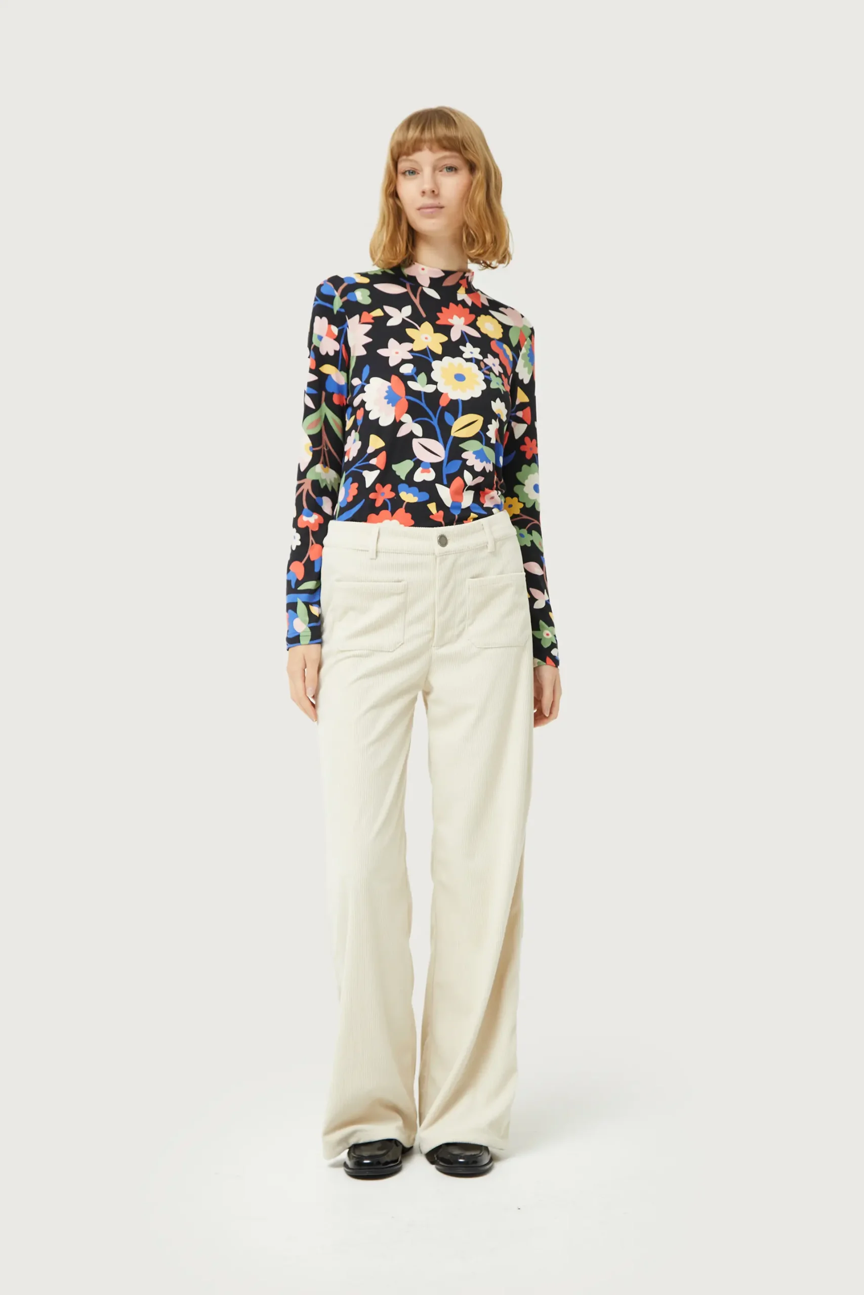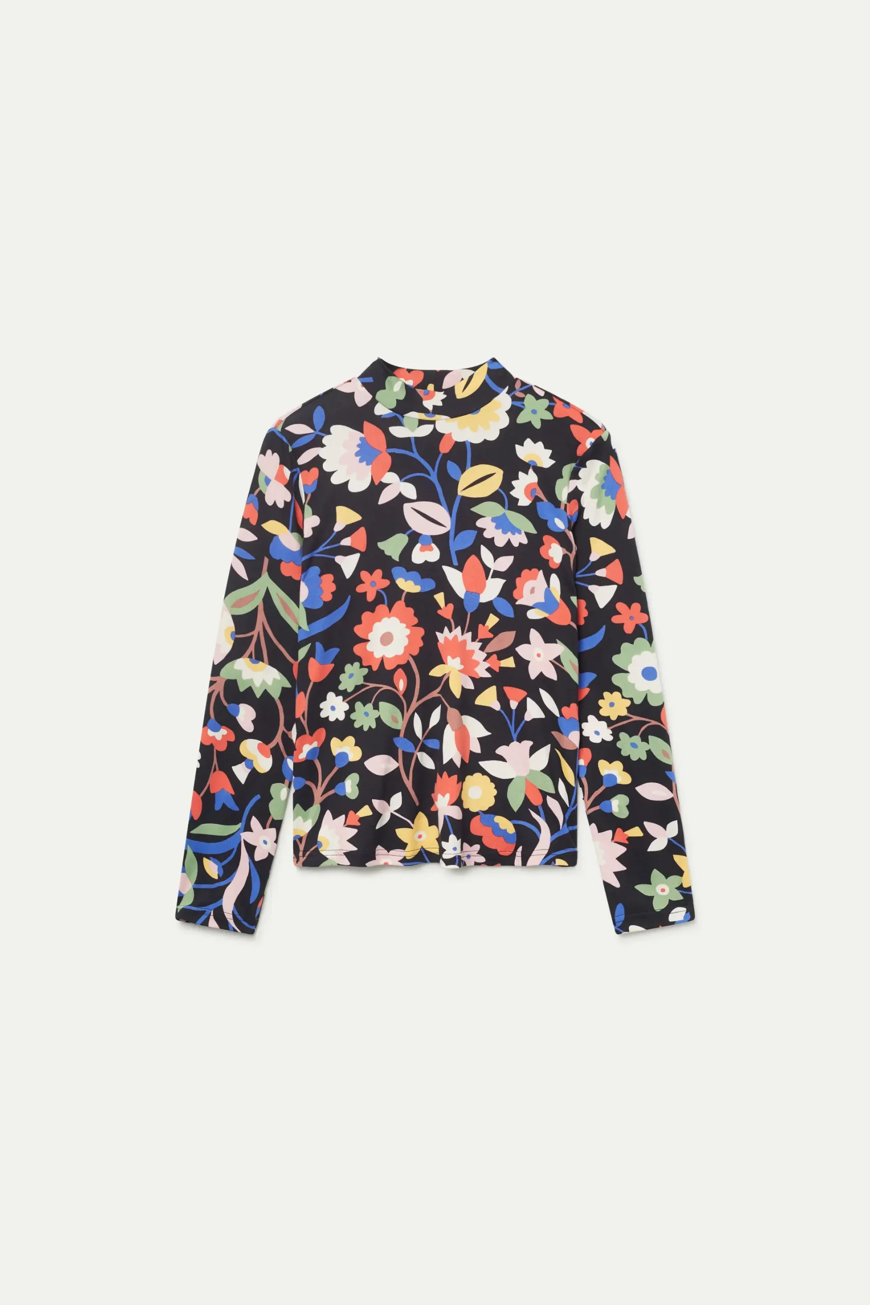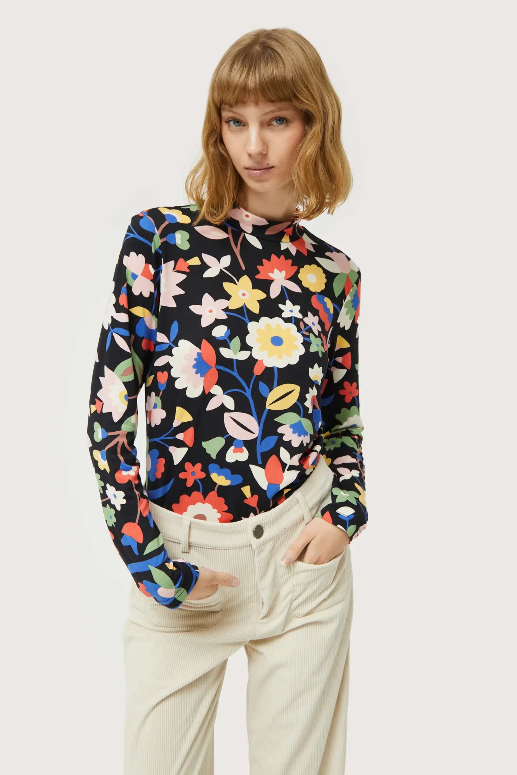 Top de color negro con estampado floral grande multicolor. Con cuello mock y manga larga. La modelo mide 177 cm y lleva la talla S.
