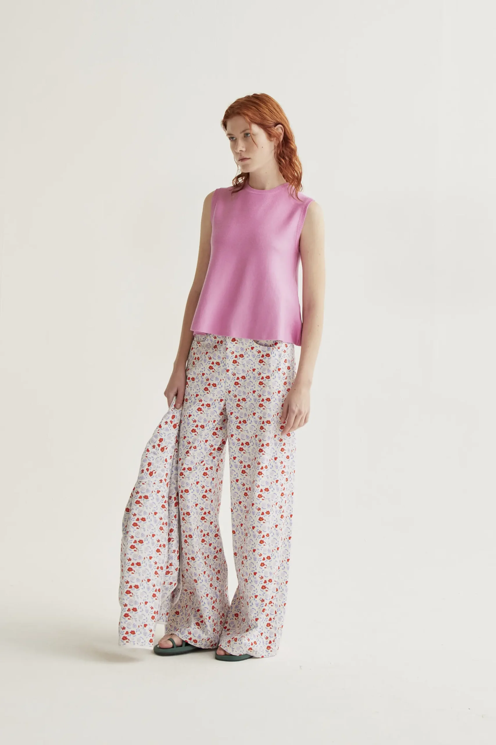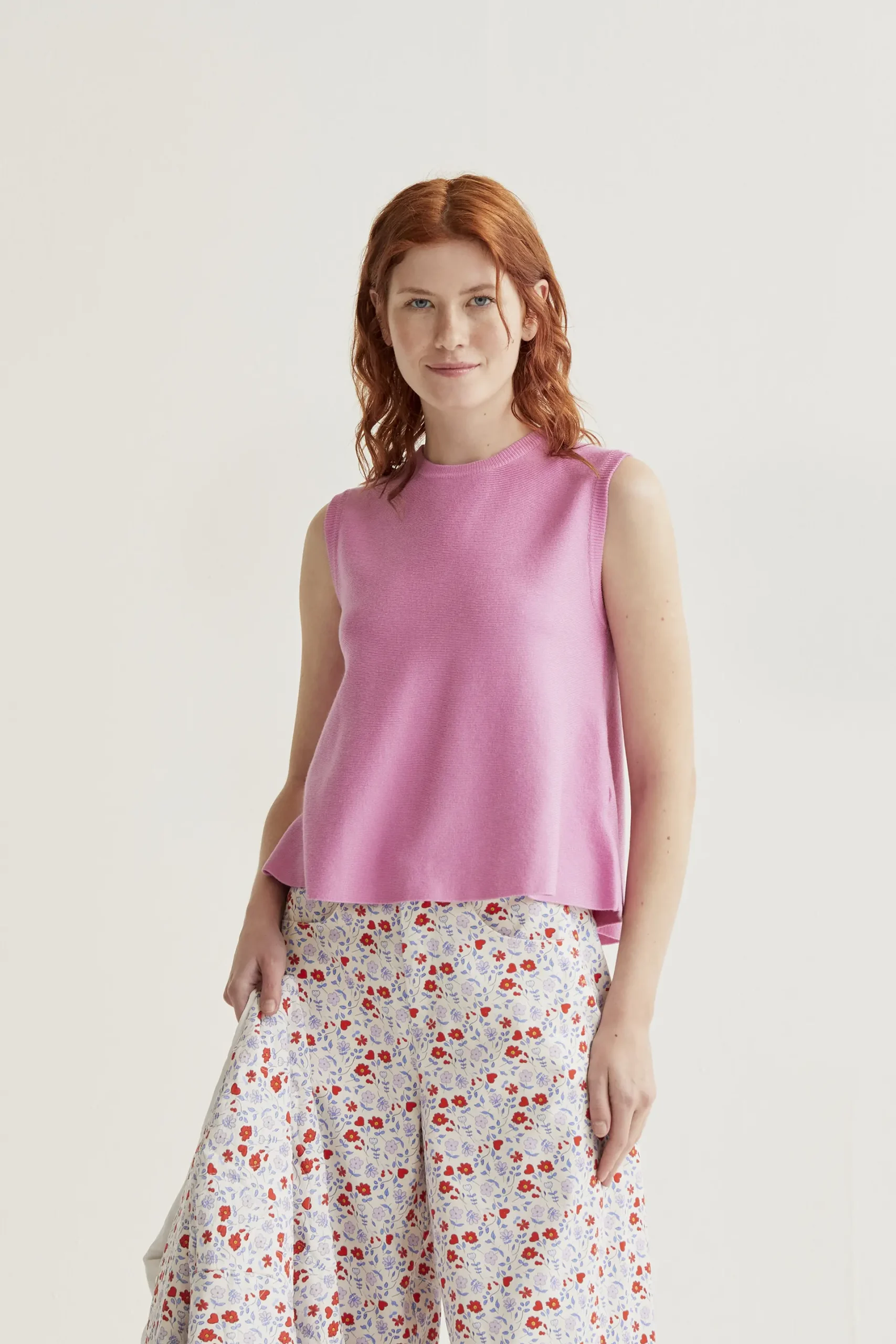 Top de tejido punto de color rosado. Cuello redondo y sin mangas. Corte amplio.Detalles acabados en rib. La modelo mide 175 cm y lleva la talla S.