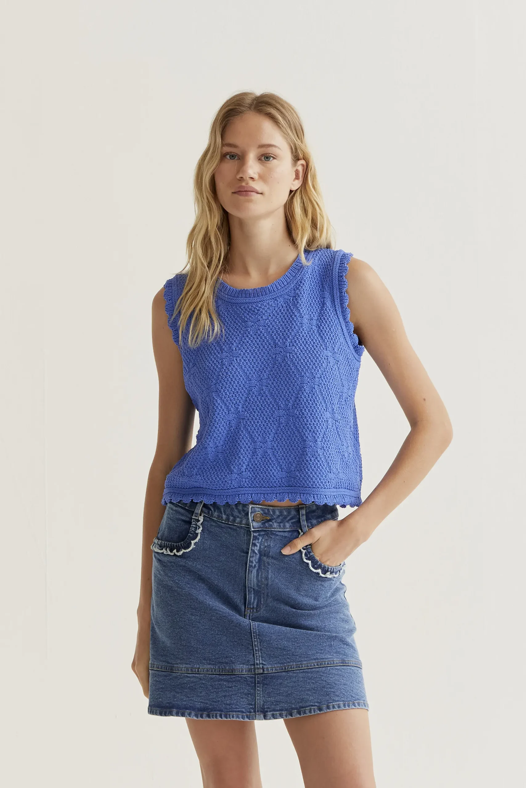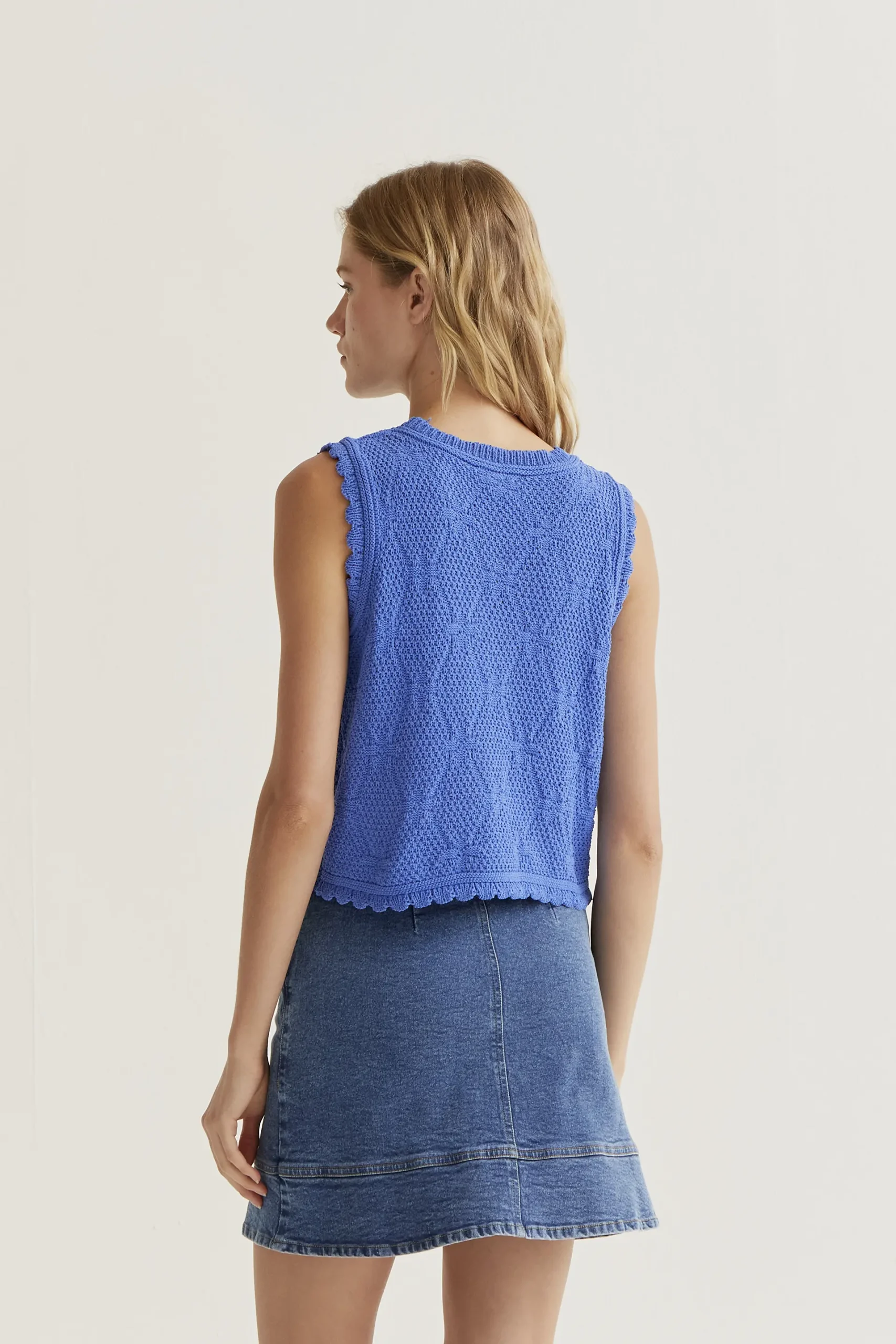 Top con tejido de punto bordado encadenado de color azul. Cuello redondo y sin mangas. Detalles en relieves bordados. La modelo mide 177 cm y lleva la talla S.