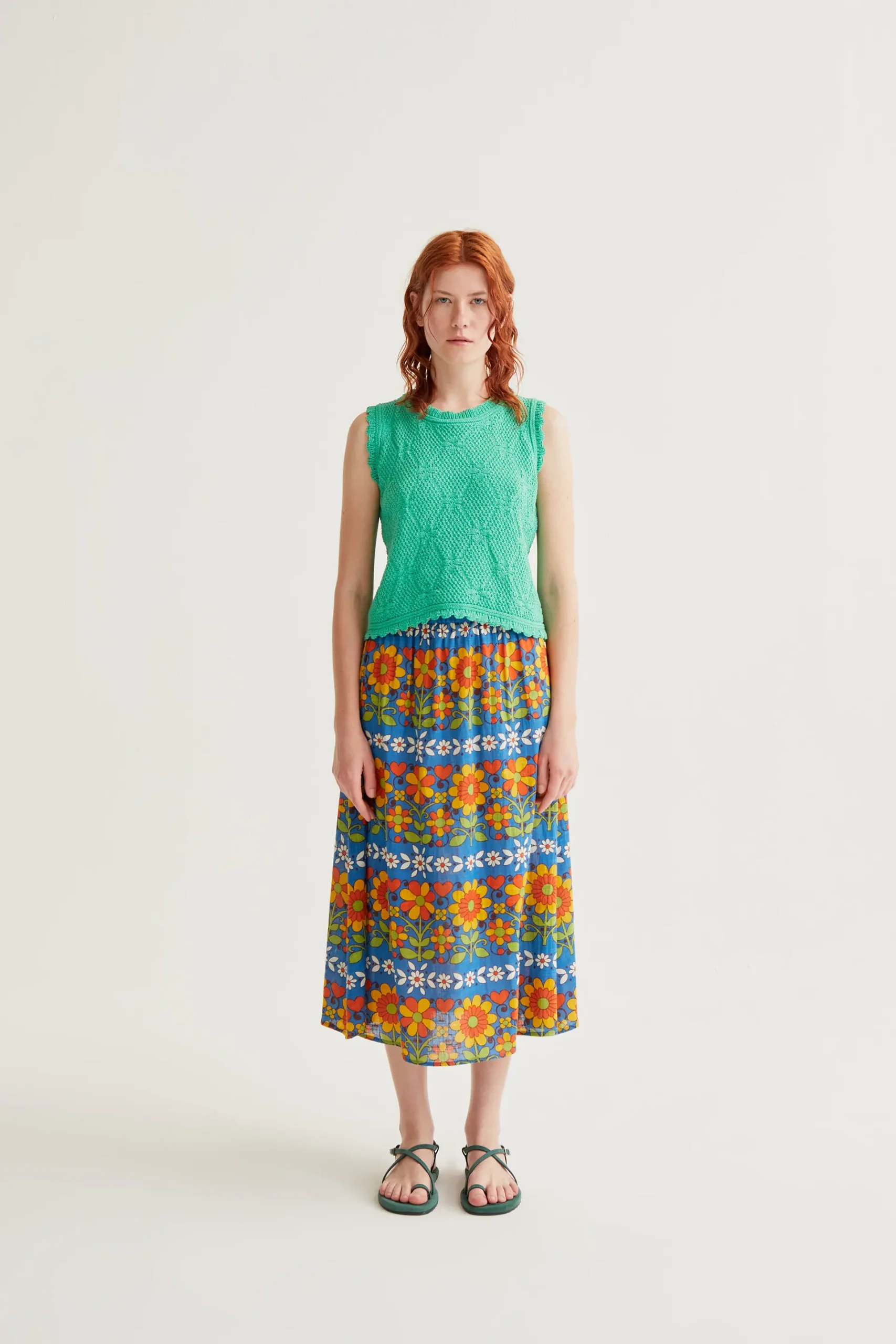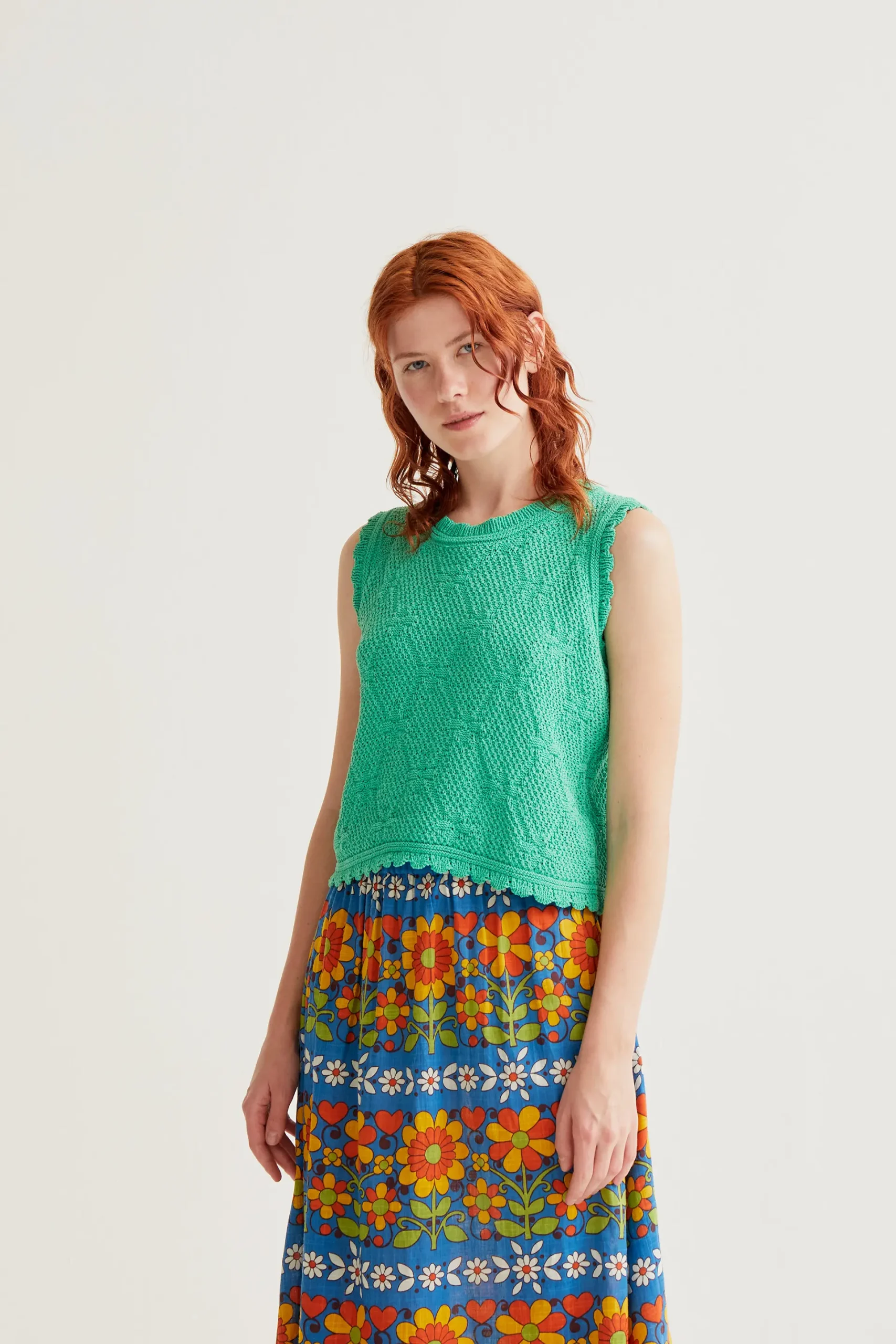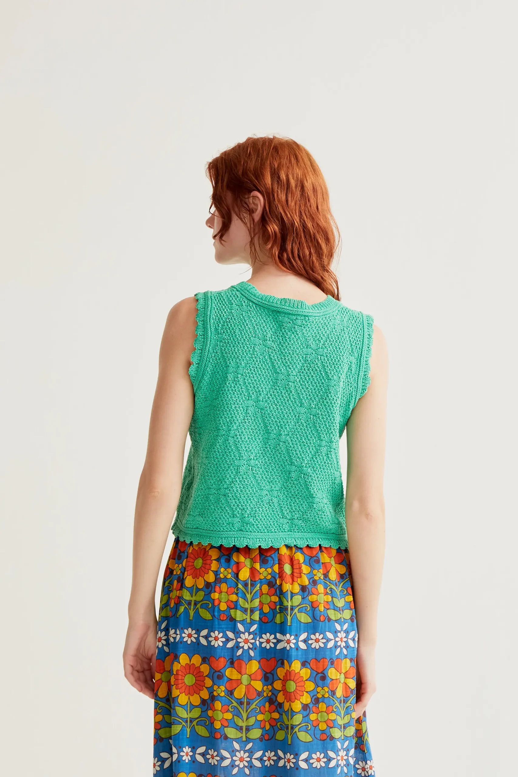 Top con tejido de punto bordado encadenado de color verde. Cuello redondo y sin mangas. Detalles en relieves bordados. La modelo mide 177 cm y lleva la talla S.