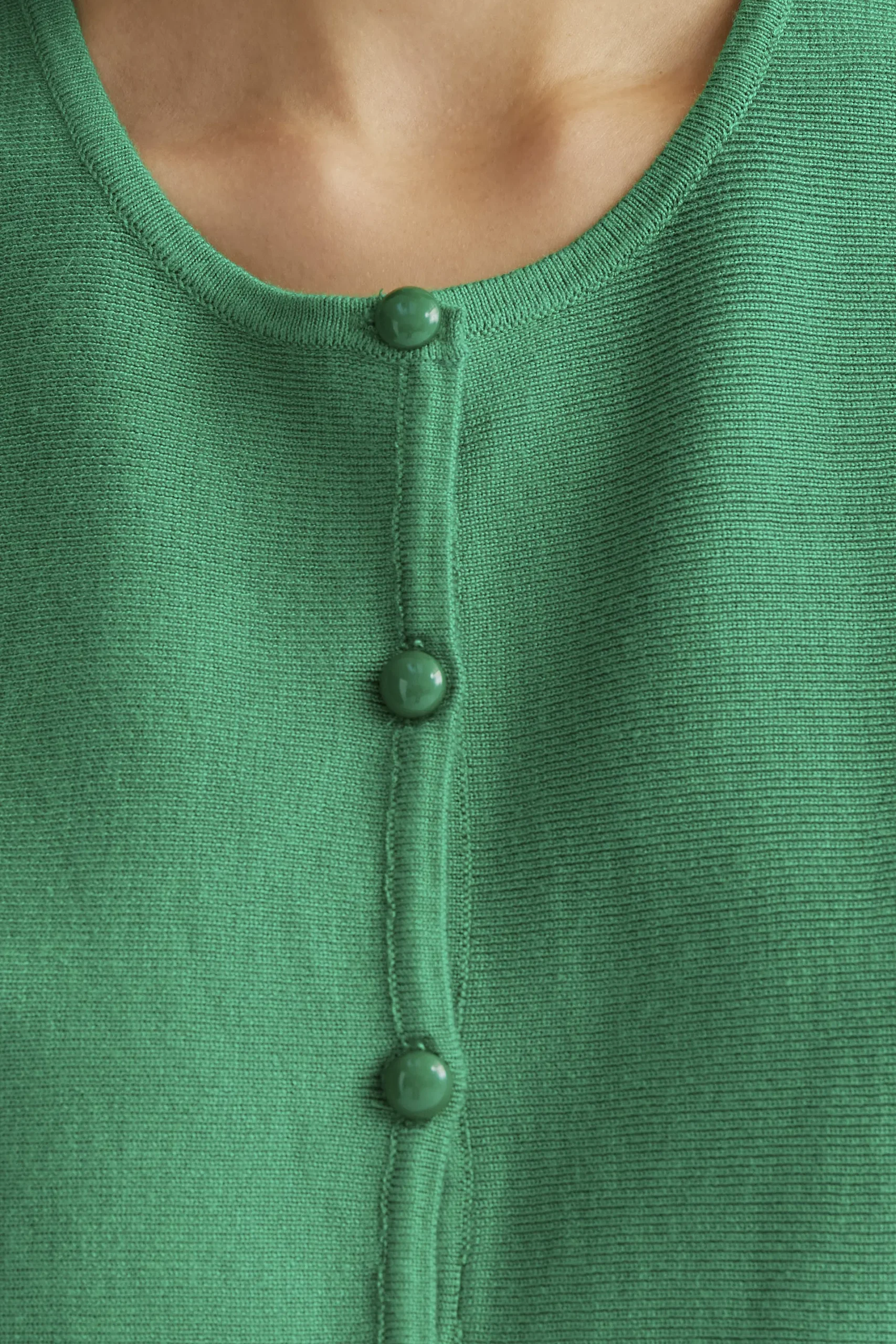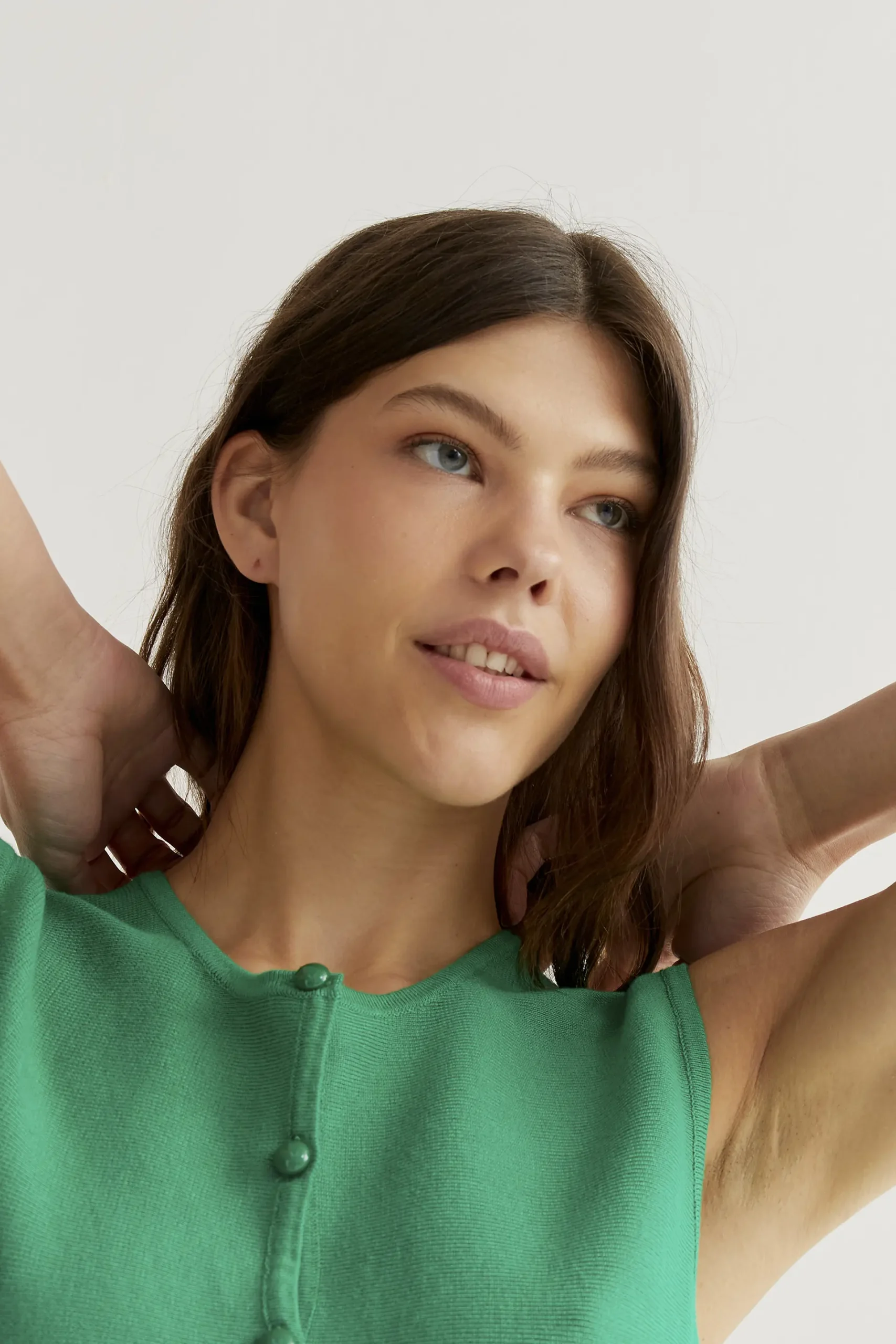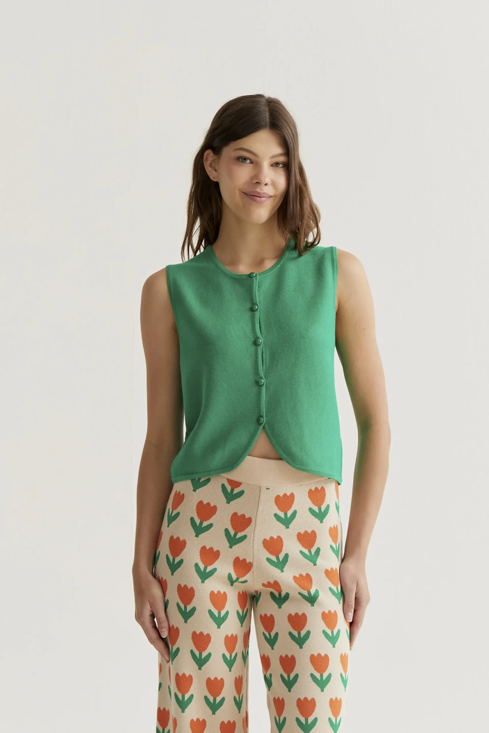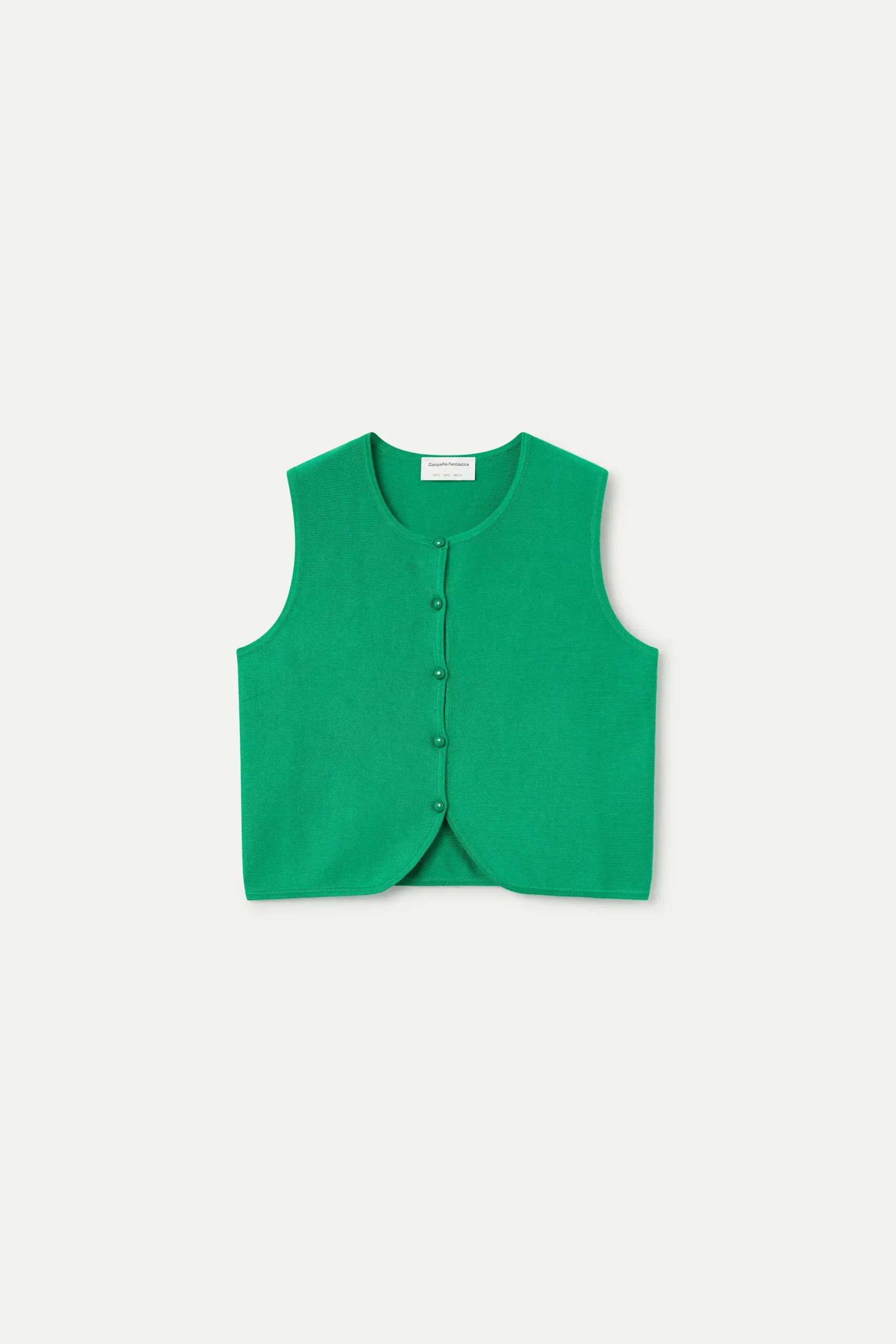 Top chaleco de tejido punto de color verde. Cuello redondo y sin mangas. Cierre frontal con botones redondos de color verde. La modelo mide 177 cm y lleva la talla S.