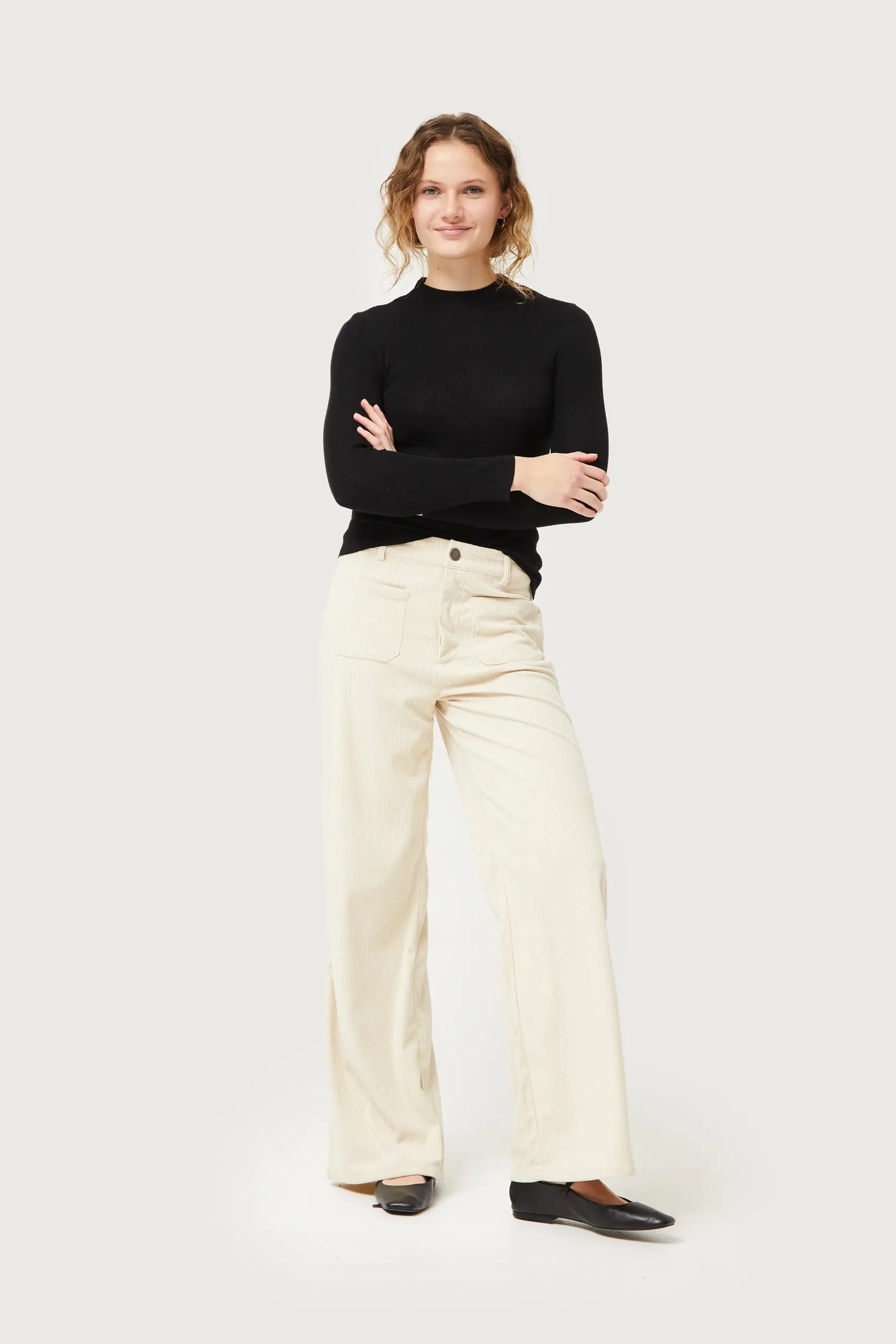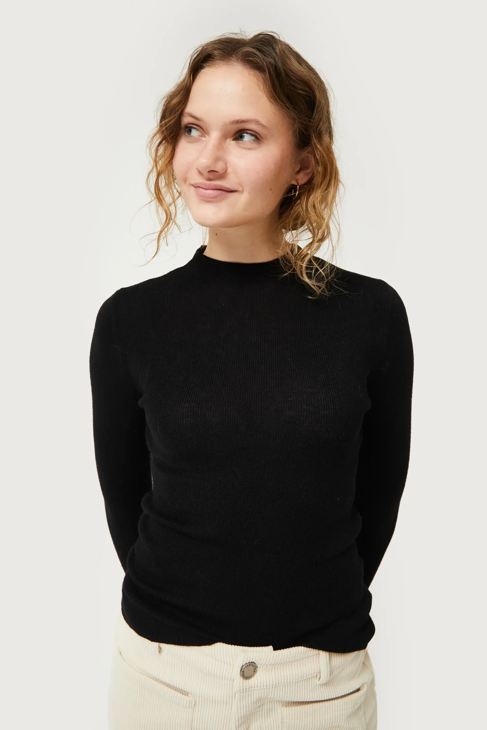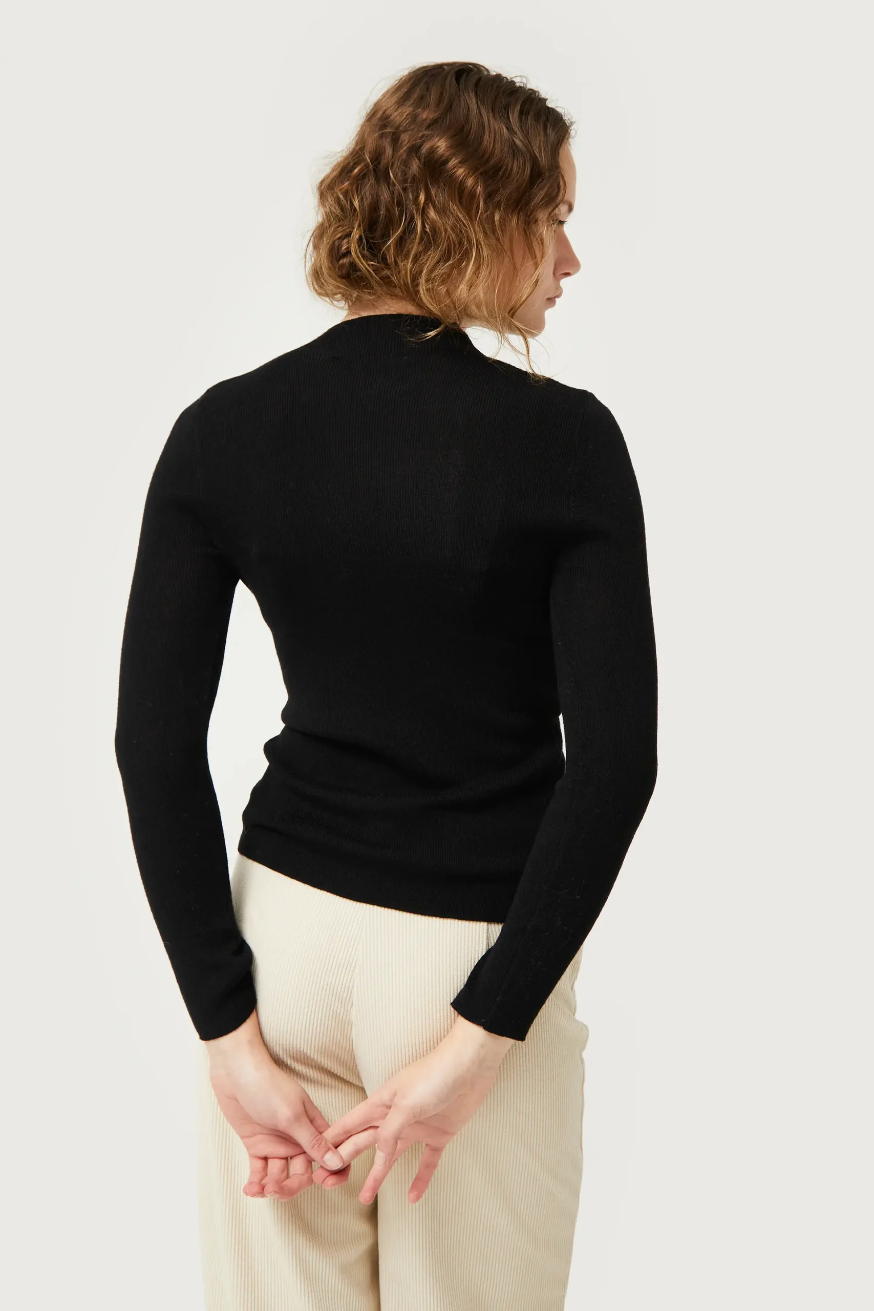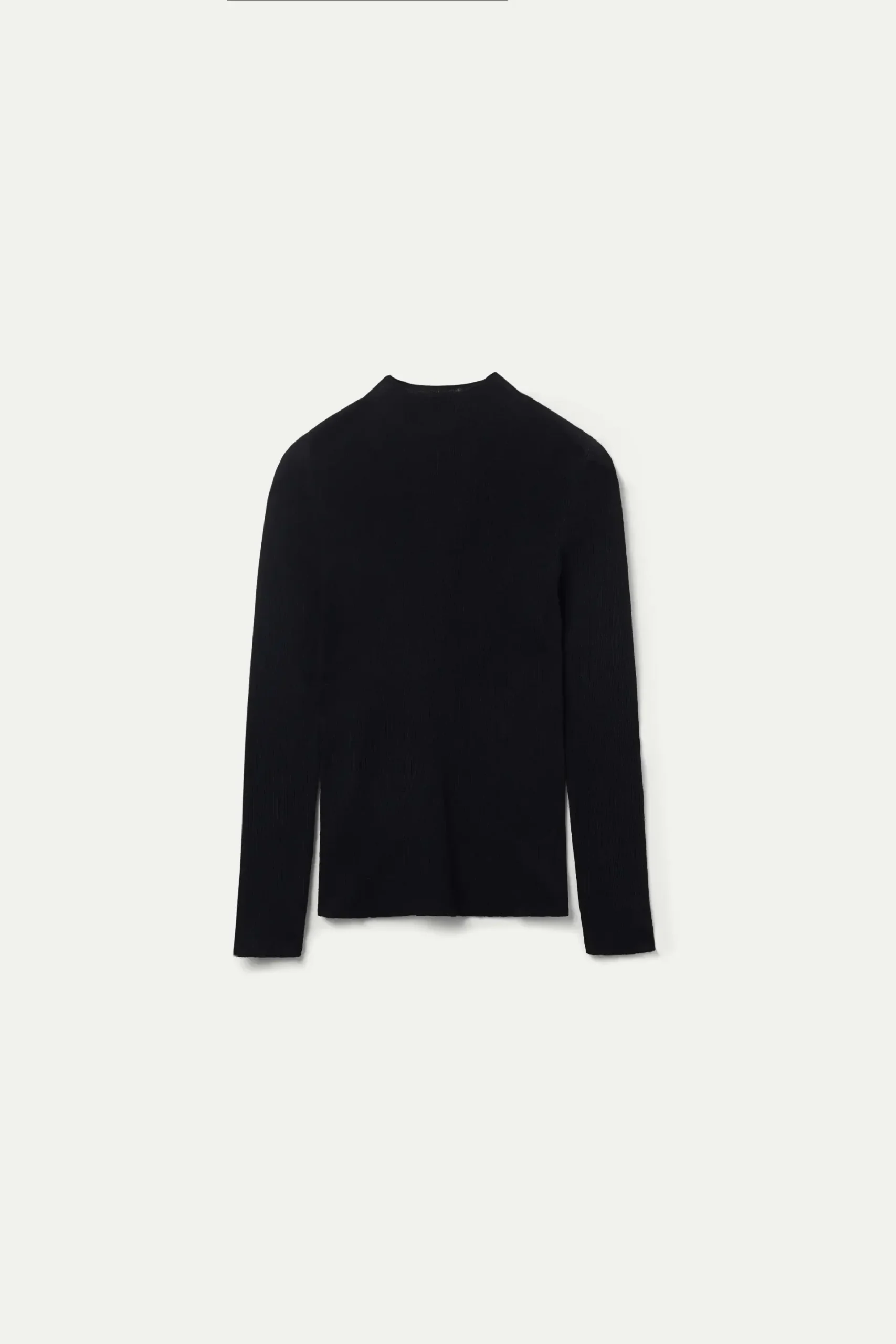 Top de canalé de color negro. Con cuello perkins y manga larga. La modelo mide 175 cm y lleva la talla S.