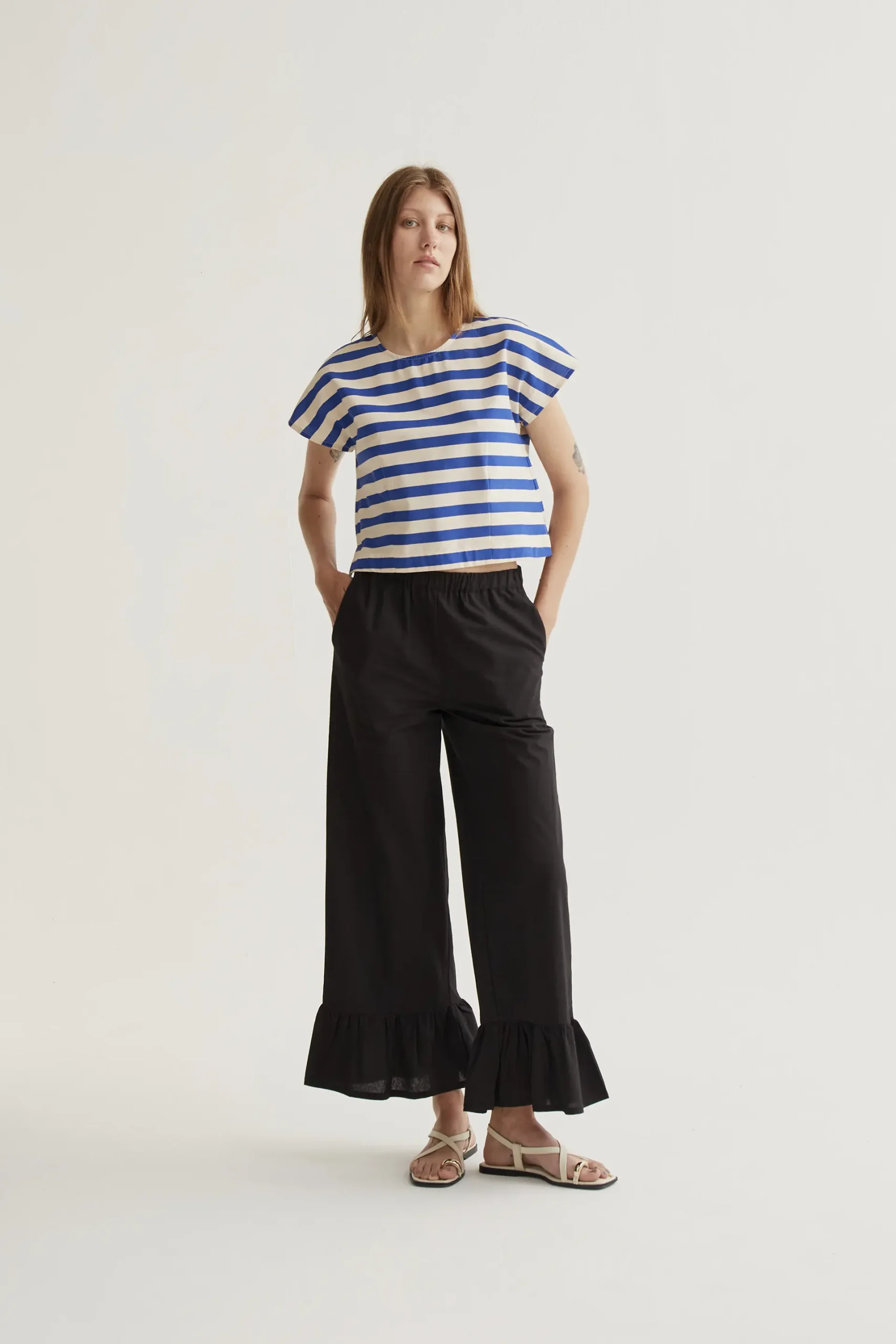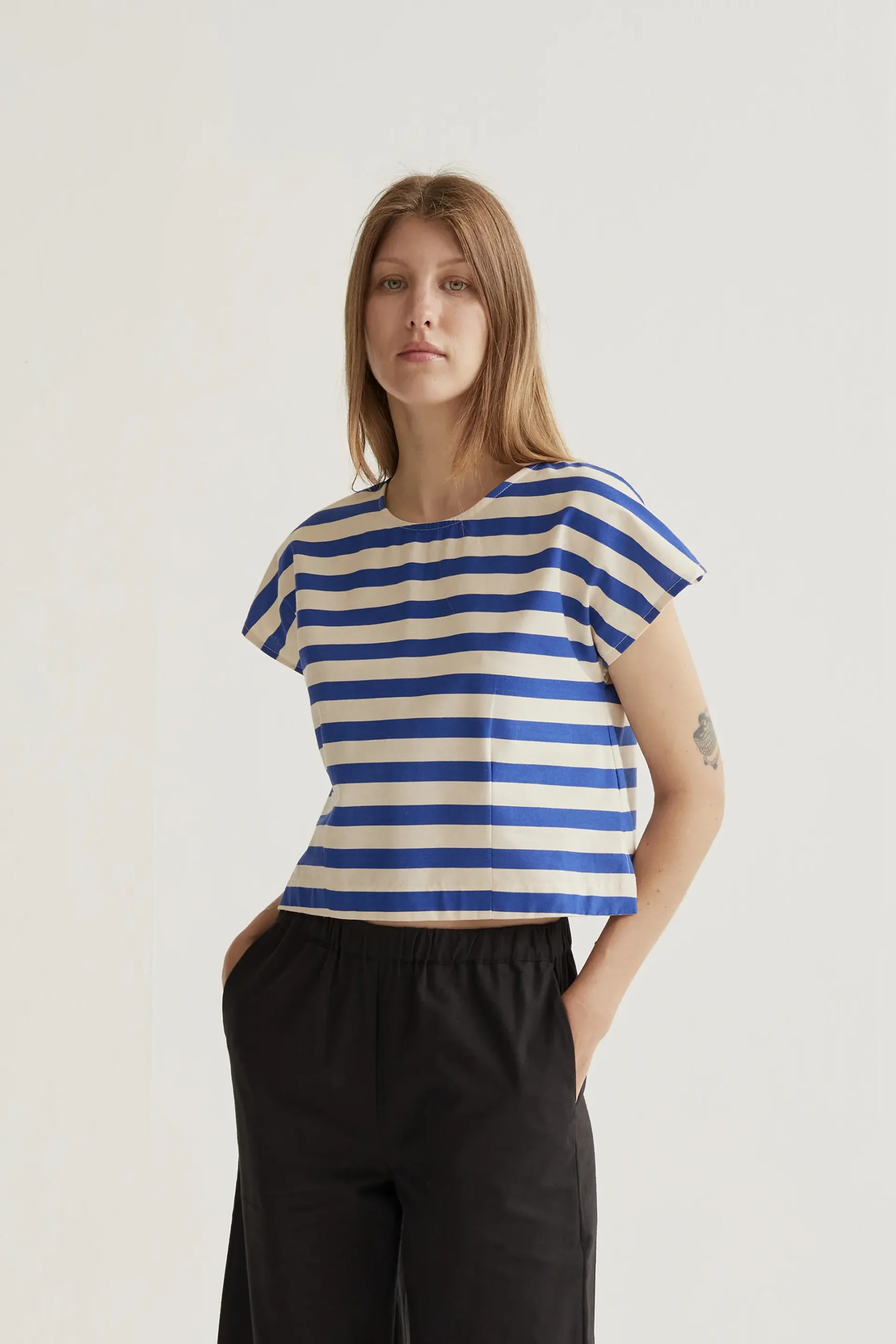 Top de tejido 100% algodón con estampado bamboo blue. Cuello redondo y manga corta. Cierre trasero con botón oculto en escote pico. La modelo mide 177 cm y lleva la talla S.