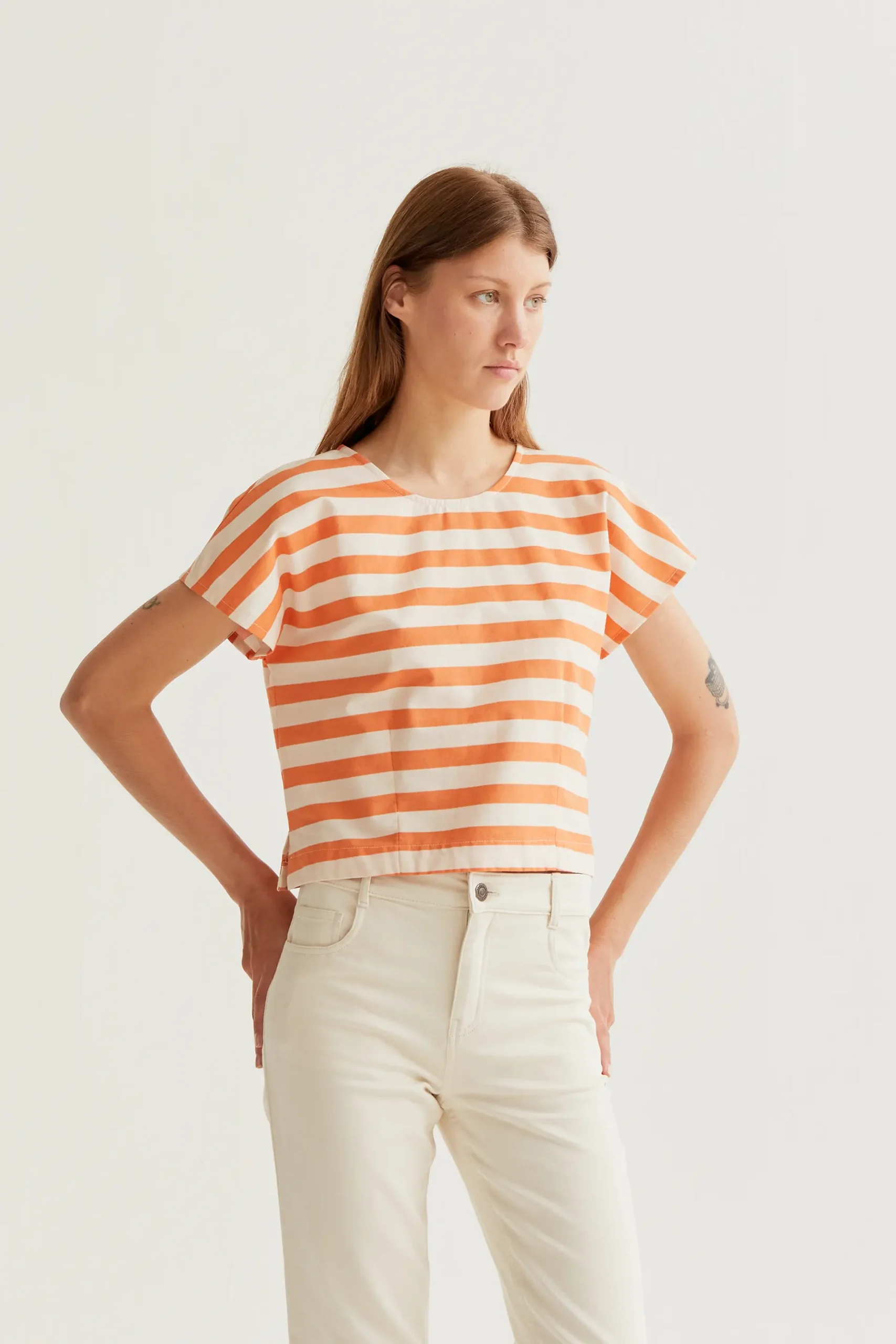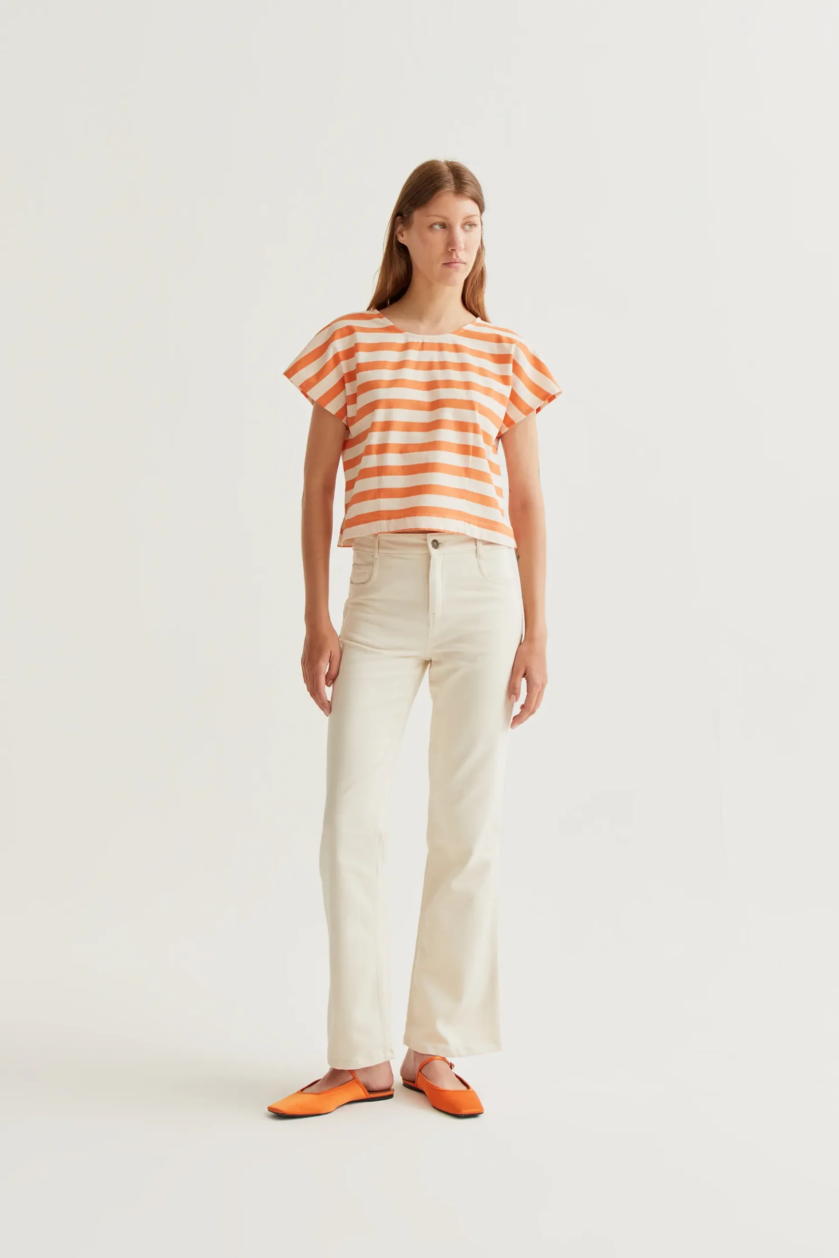 Top de tejido 100% algodón con estampado bamboo orange. Cuello redondo y sin mangas. Cierre posterior con botón oculto. La modelo mide 177 cm y lleva la talla S.
