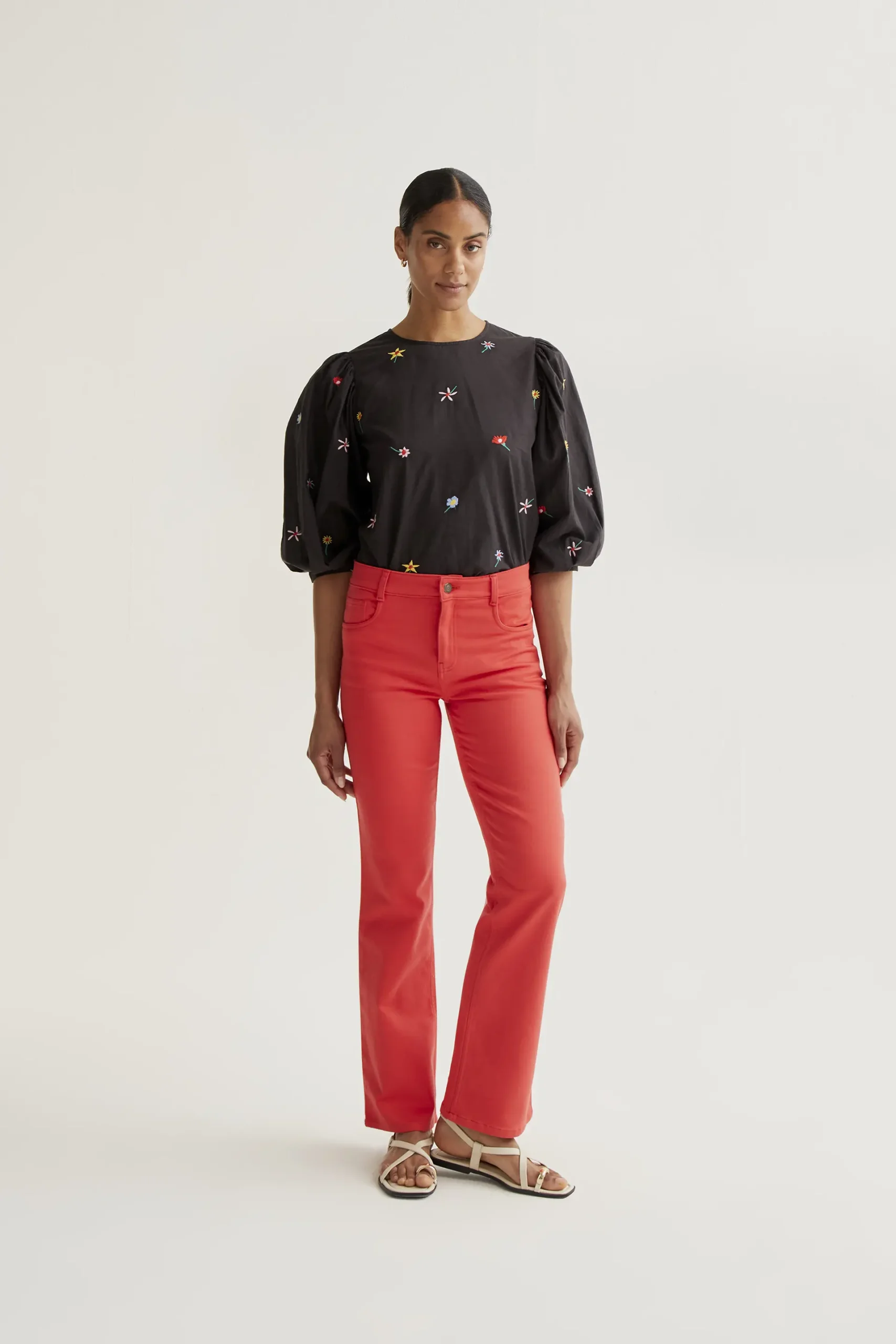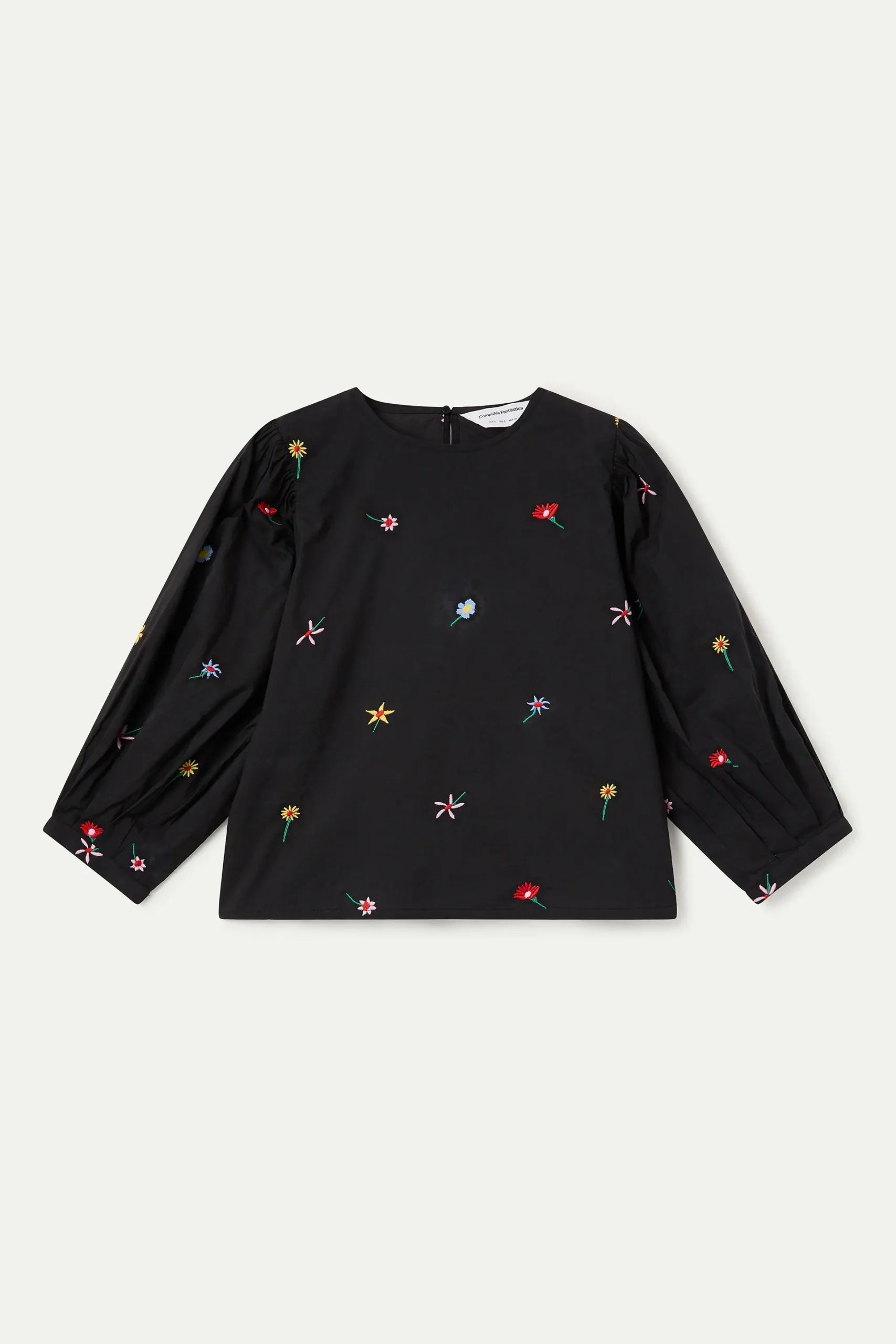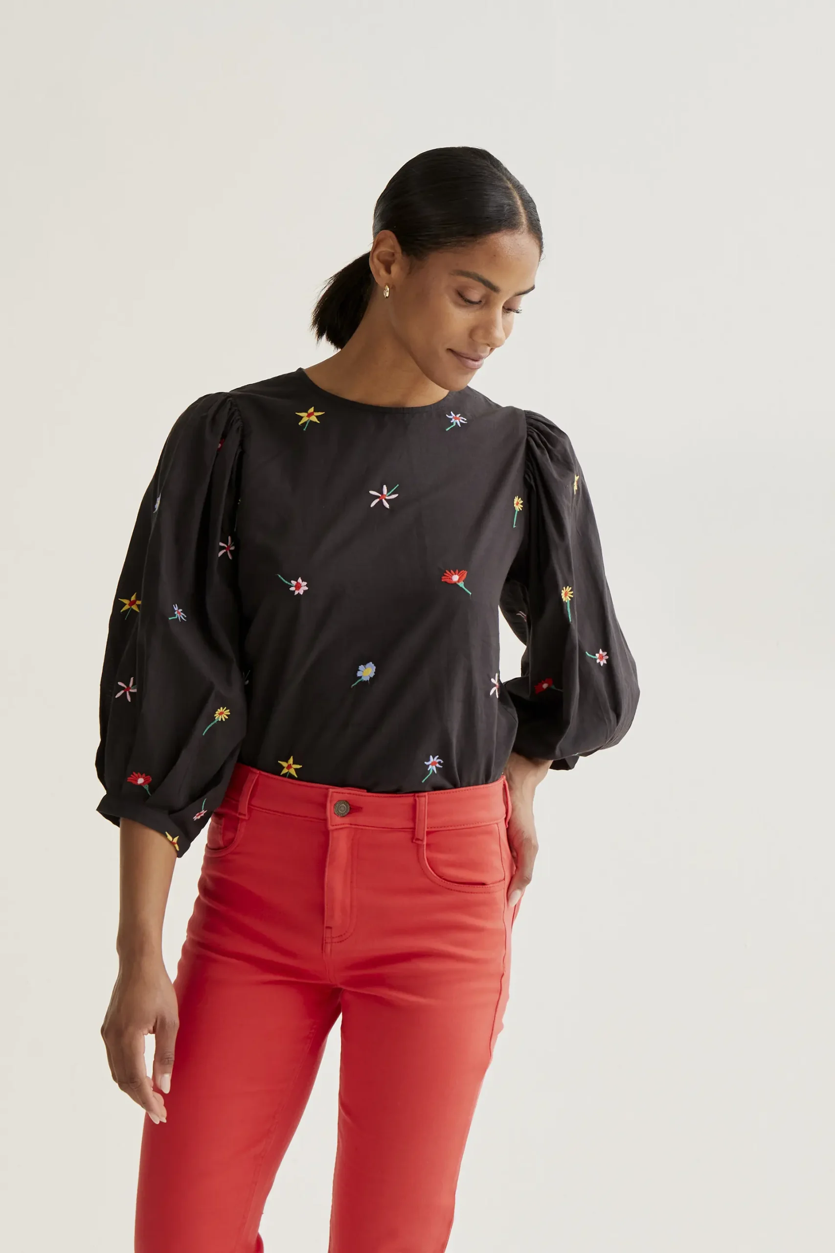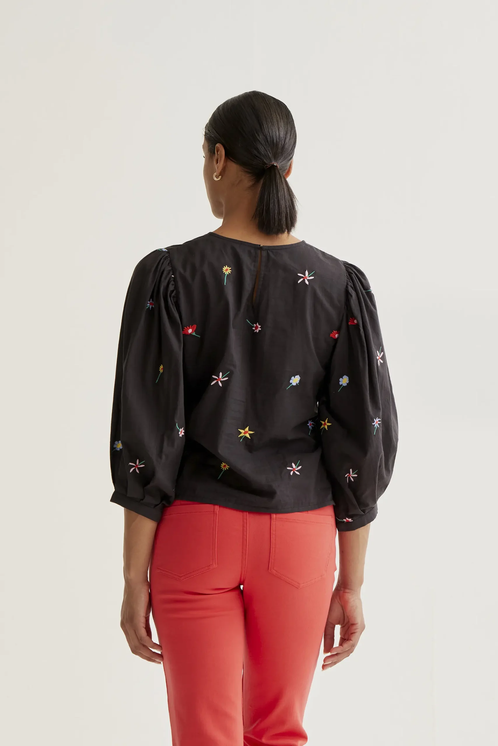 Top con estampado black gardener flowers. Cuello redondo y manga ligeramente abullonada. Cierre posterior con botón oculto. La modelo mide 173 cm y lleva la talla S.