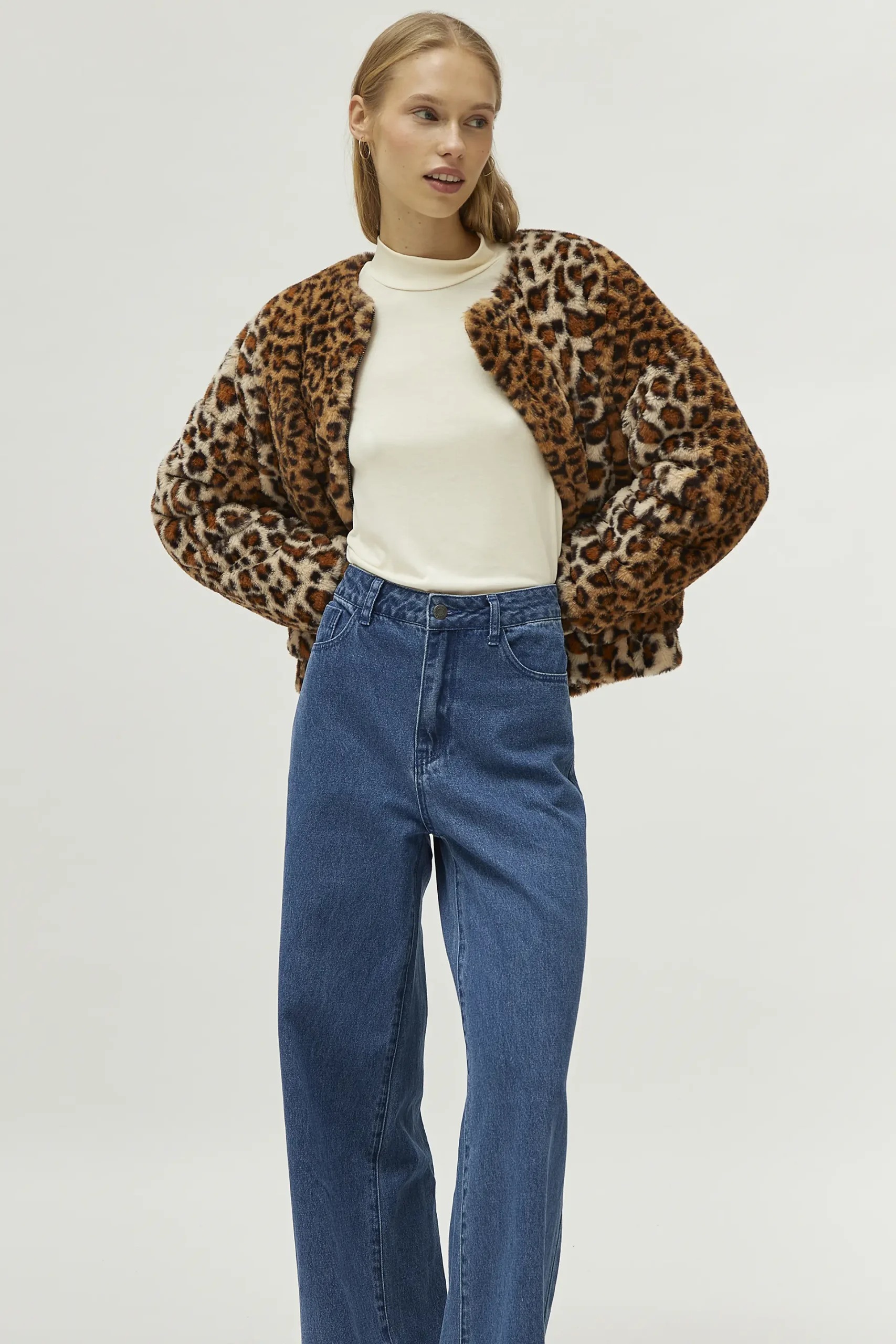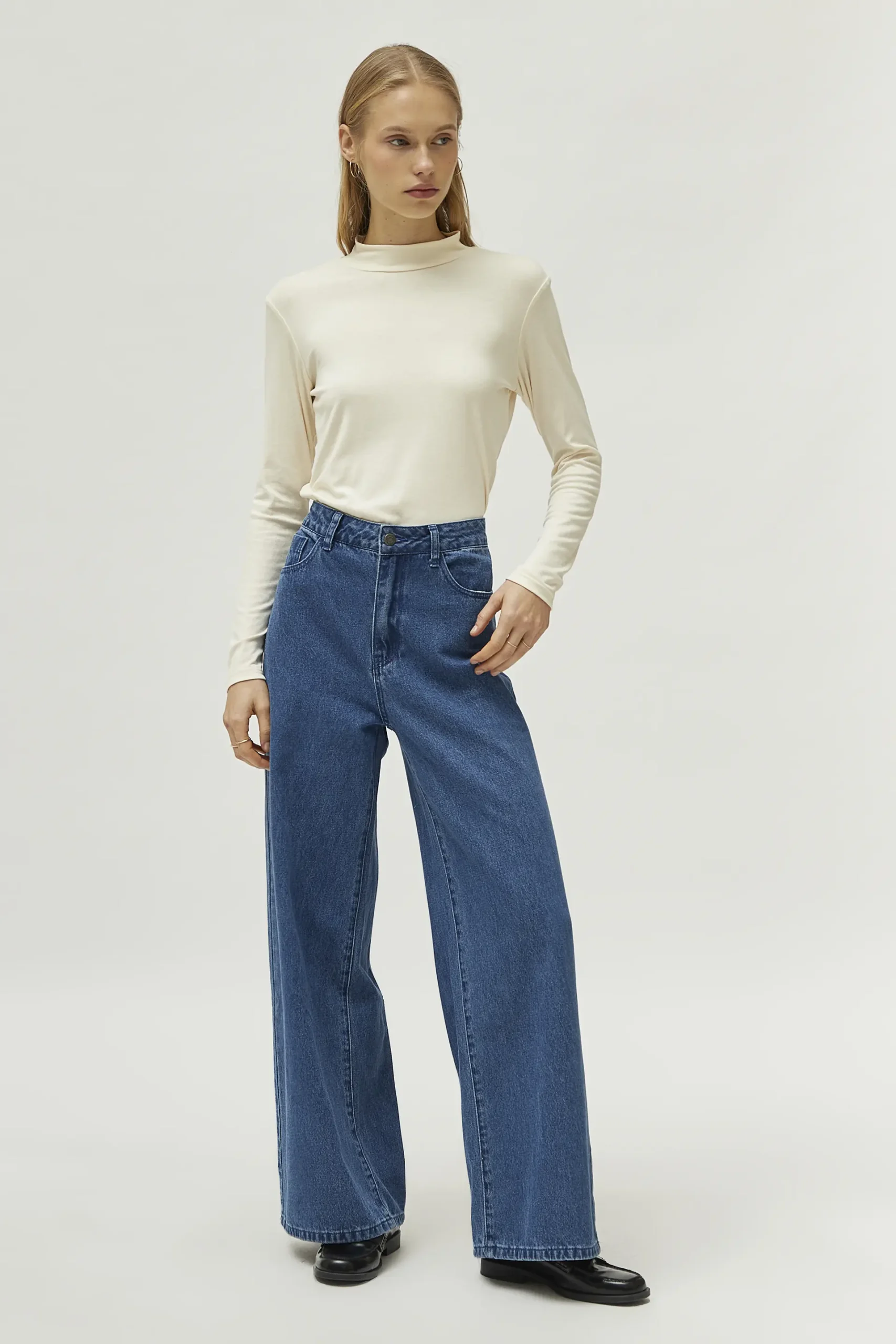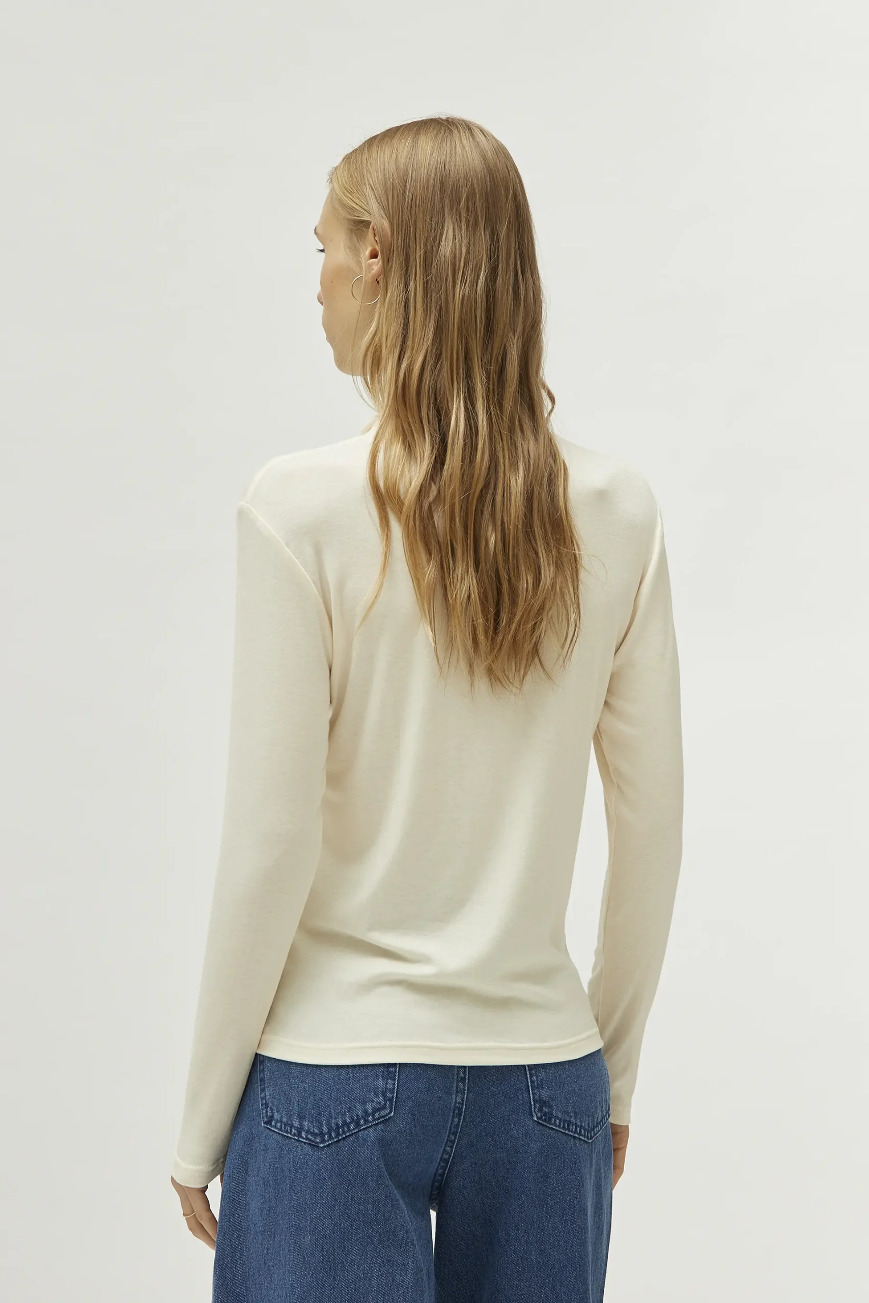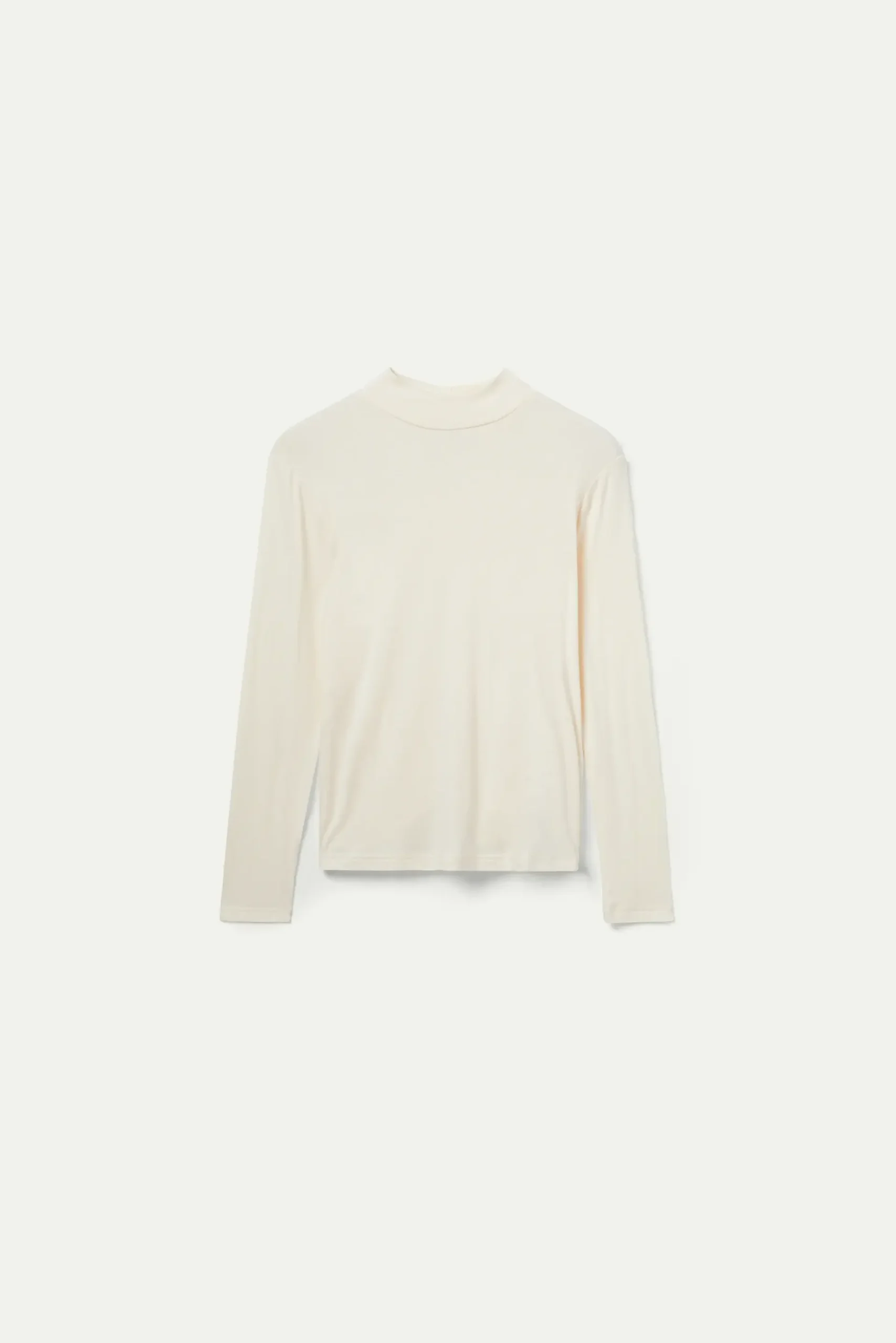 Top de punto de color blanco roto. Con cuello mock y manga larga. La modelo mide 174 cm y lleva la talla S.