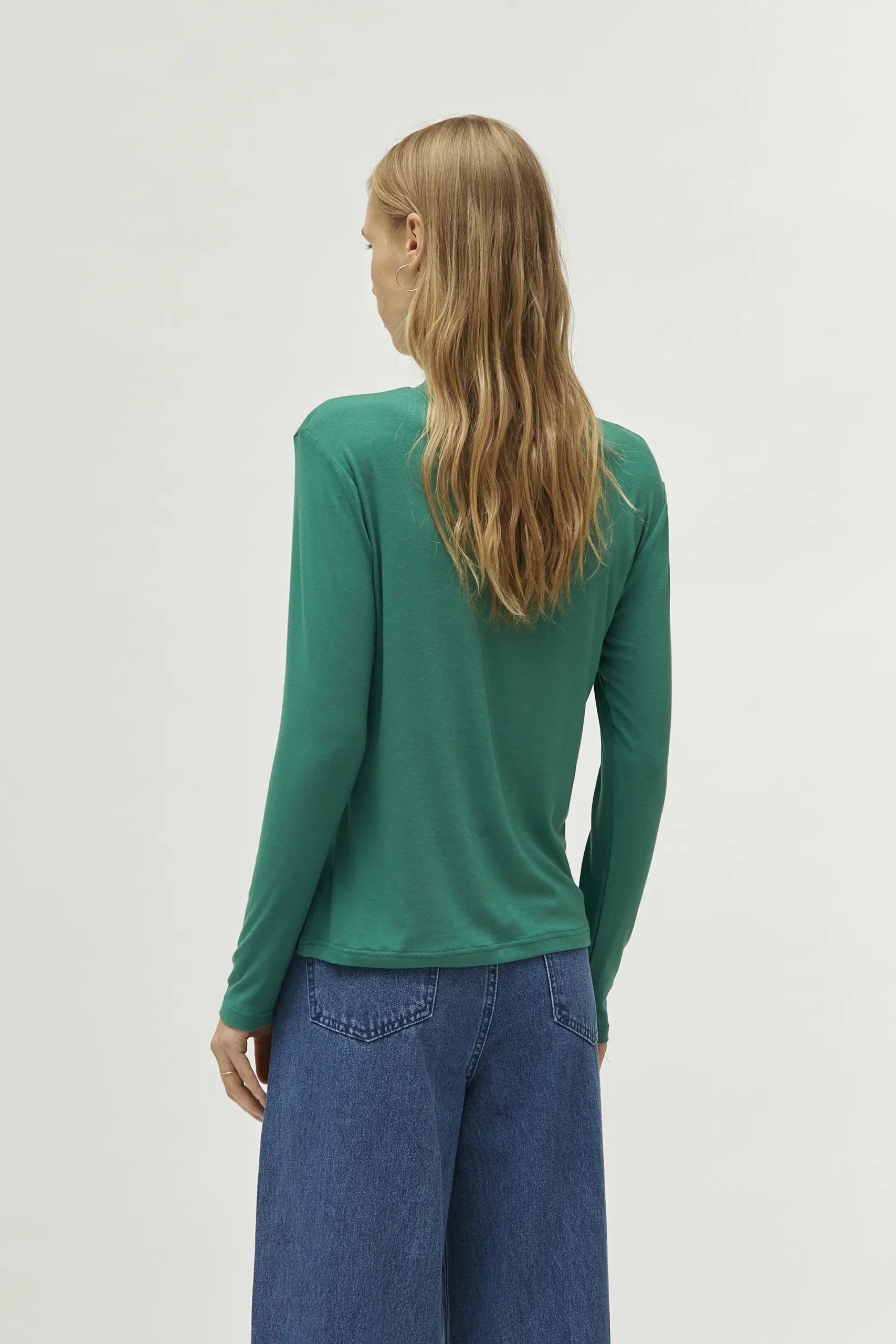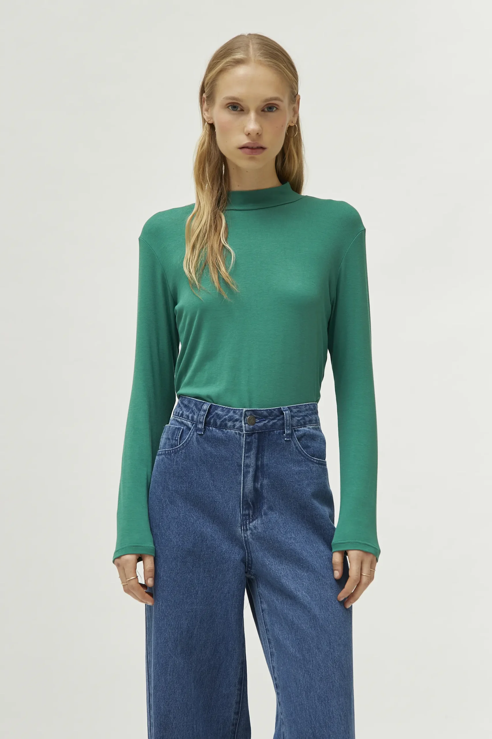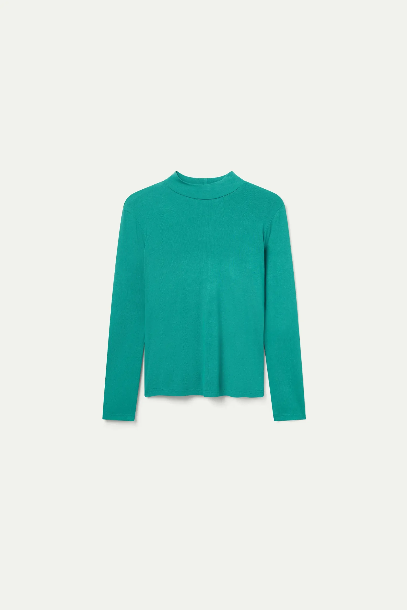 Top de punto de color verde. Con cuello mock y manga larga. La modelo mide 174 cm y lleva la talla S.