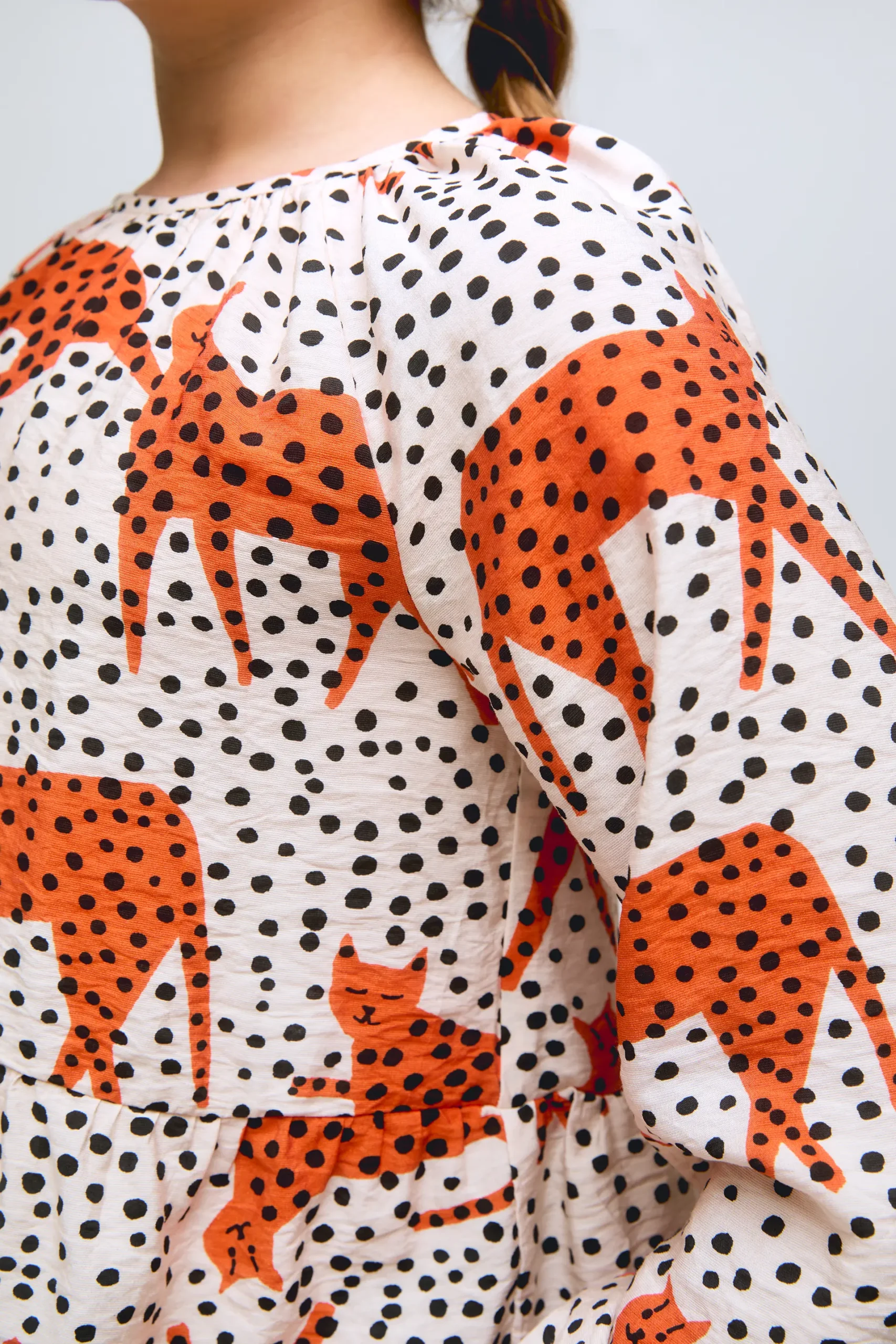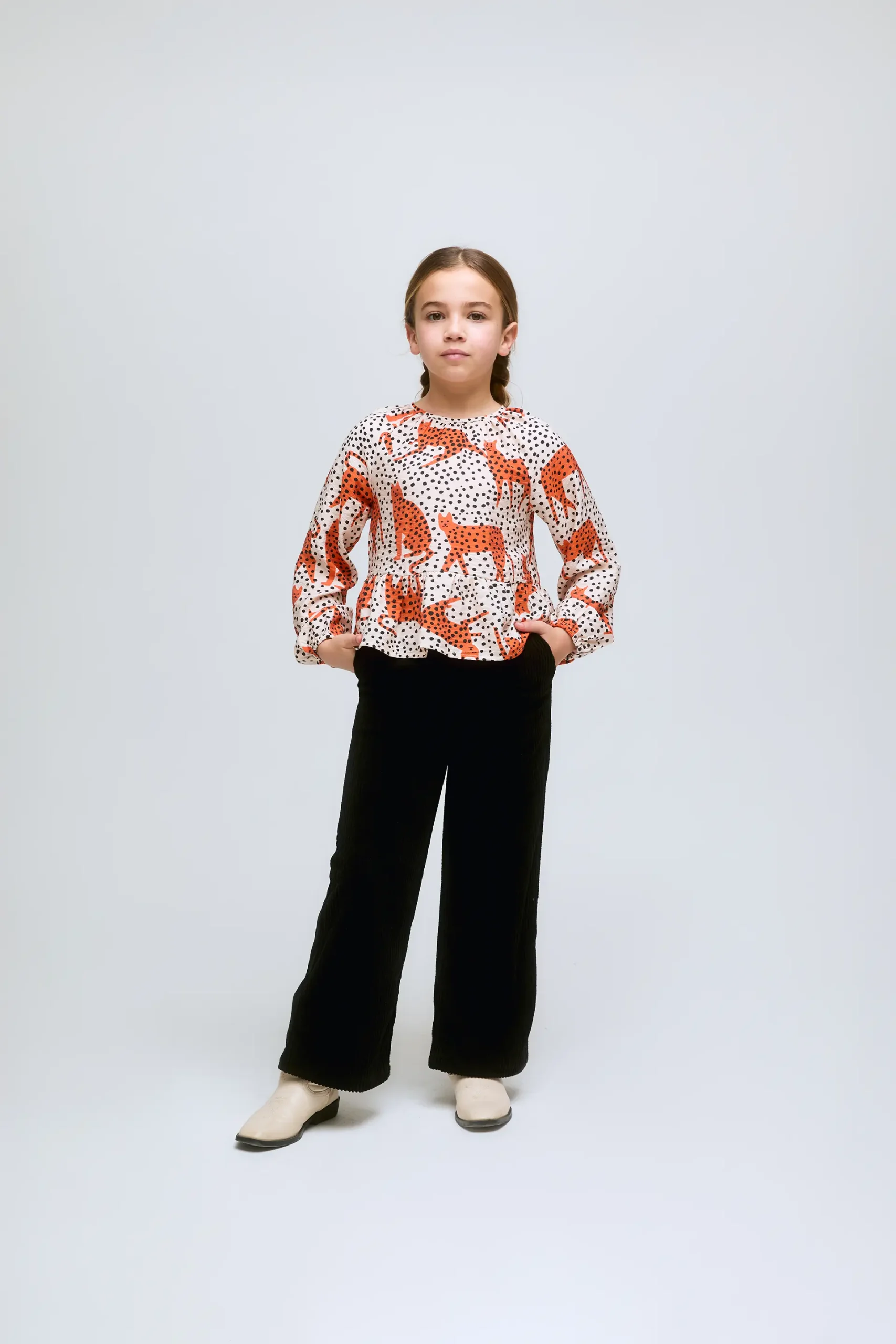 Top de niña estampado tano en color blanco con puntos negros y leopardos. De corte recto y manga larga con puño fruncido.