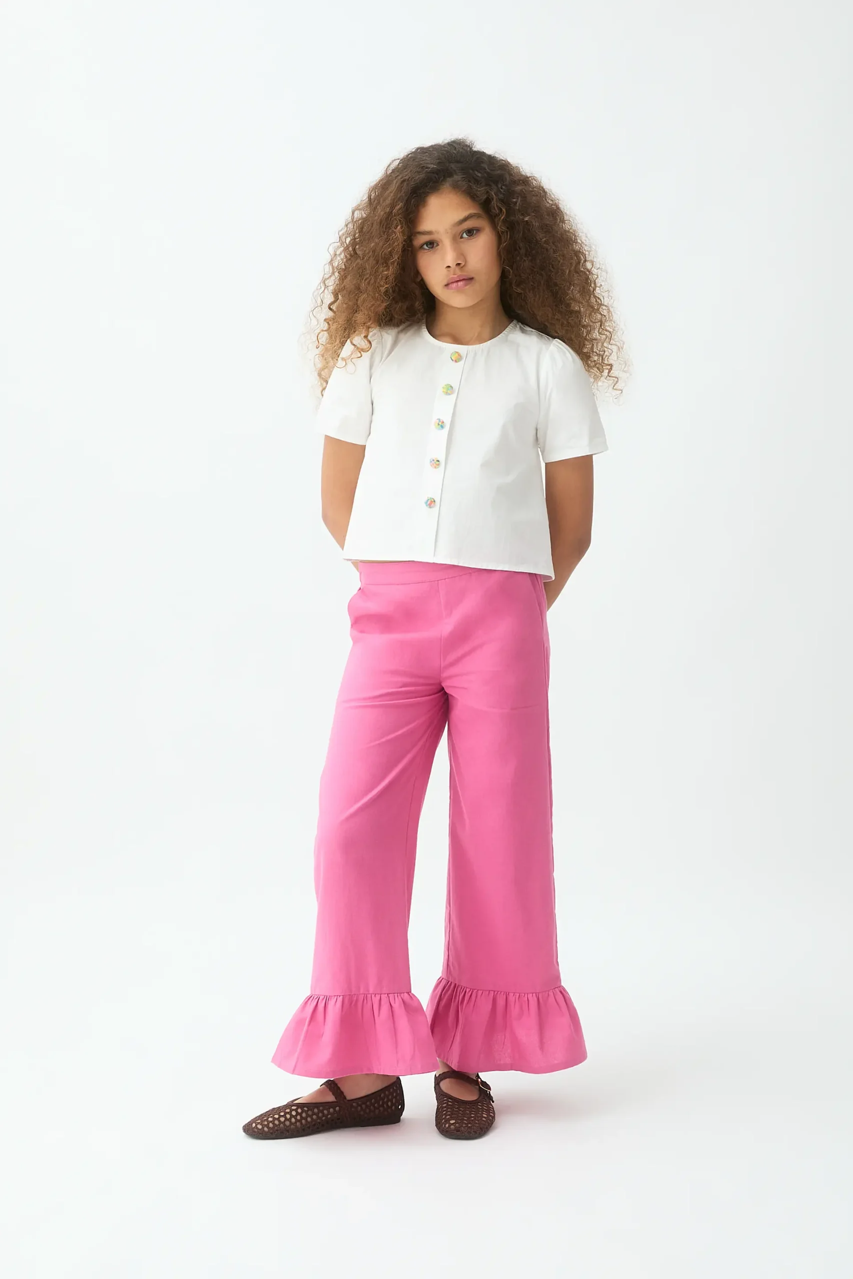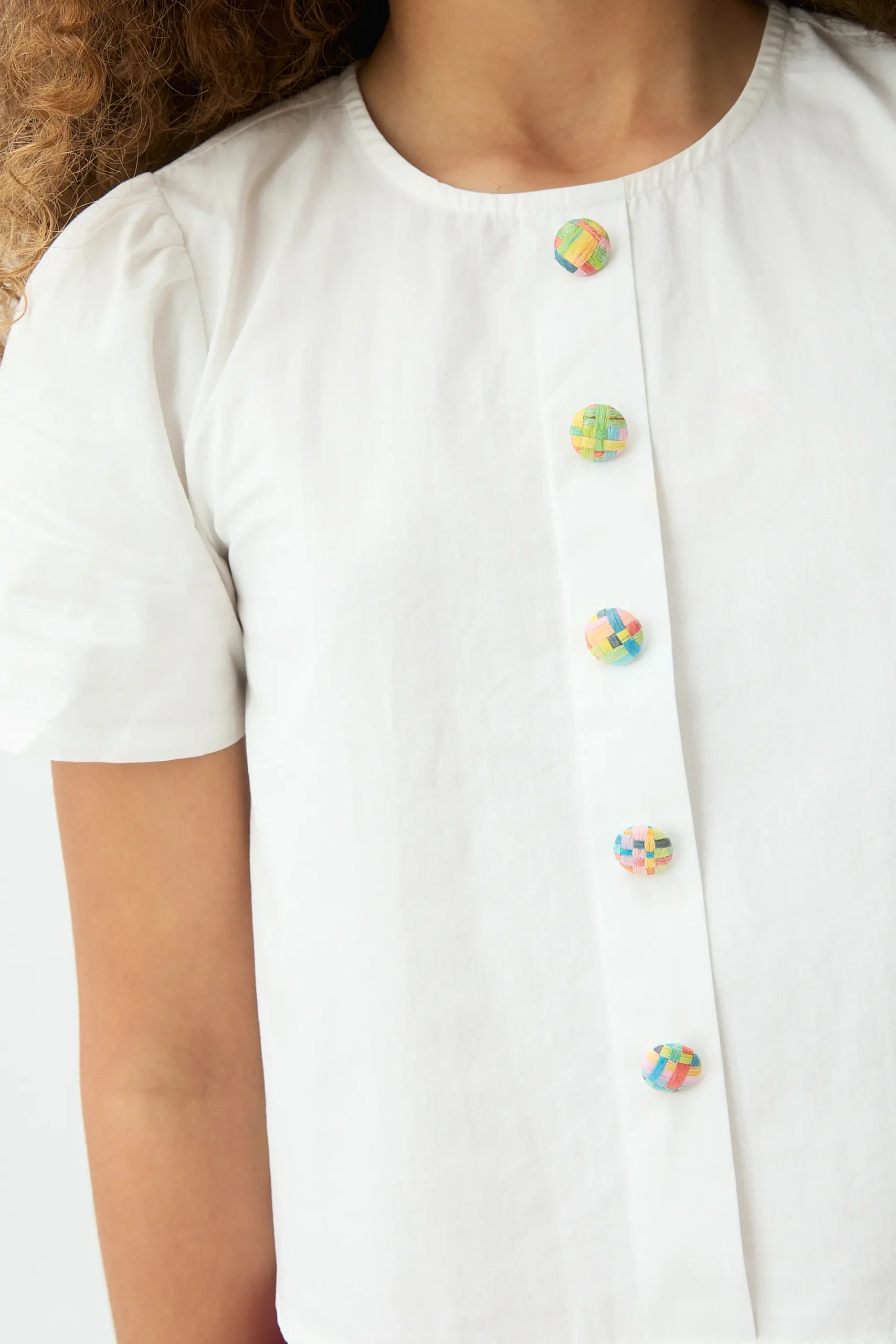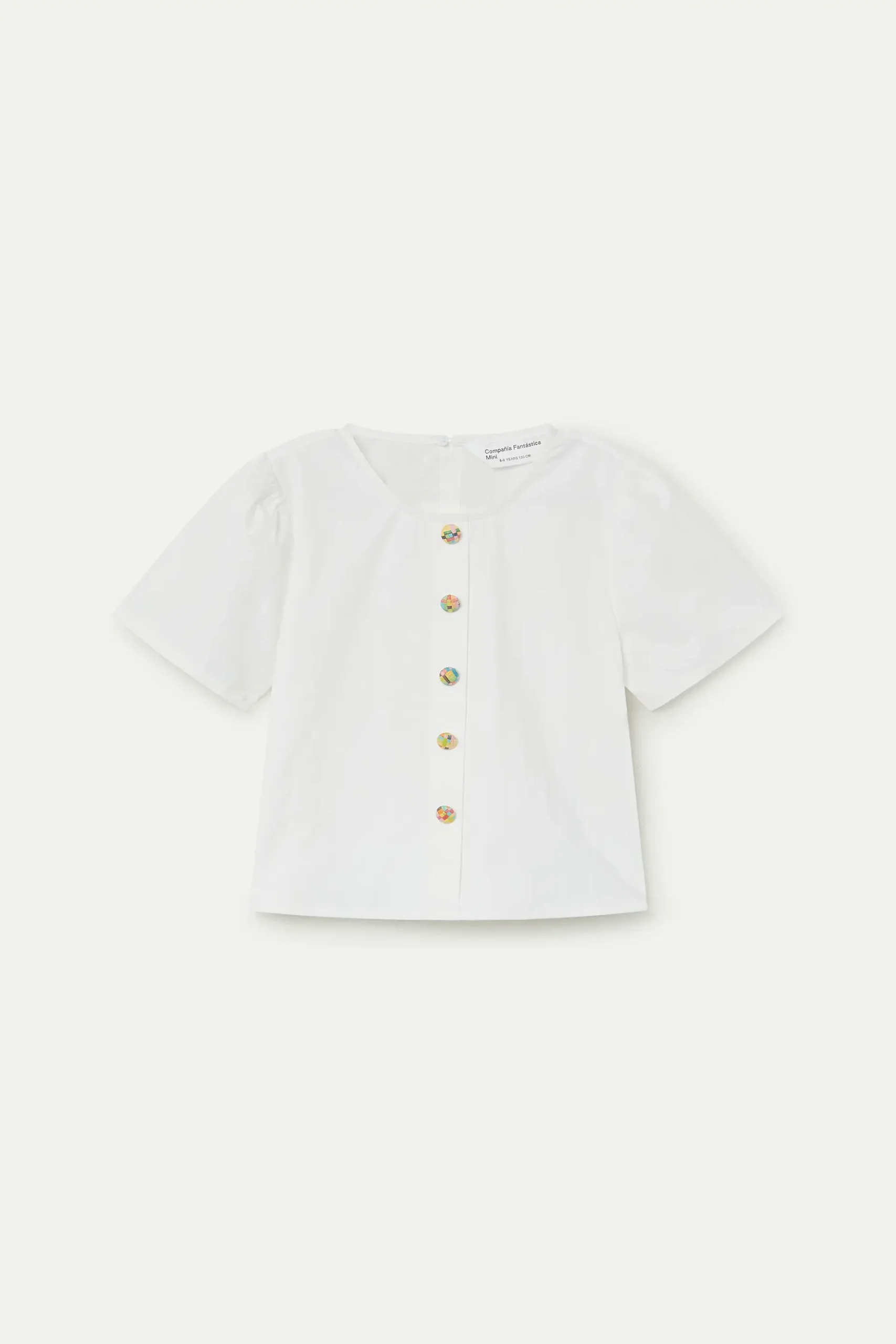 Top de niña de tejido 100% algodón de color blanco. Cuello redondo y manga corta ligeramente abullonada. Cierre frontal con botones redondos multicolor. La modelo mide 135 cm y lleva la talla 8-9 años.