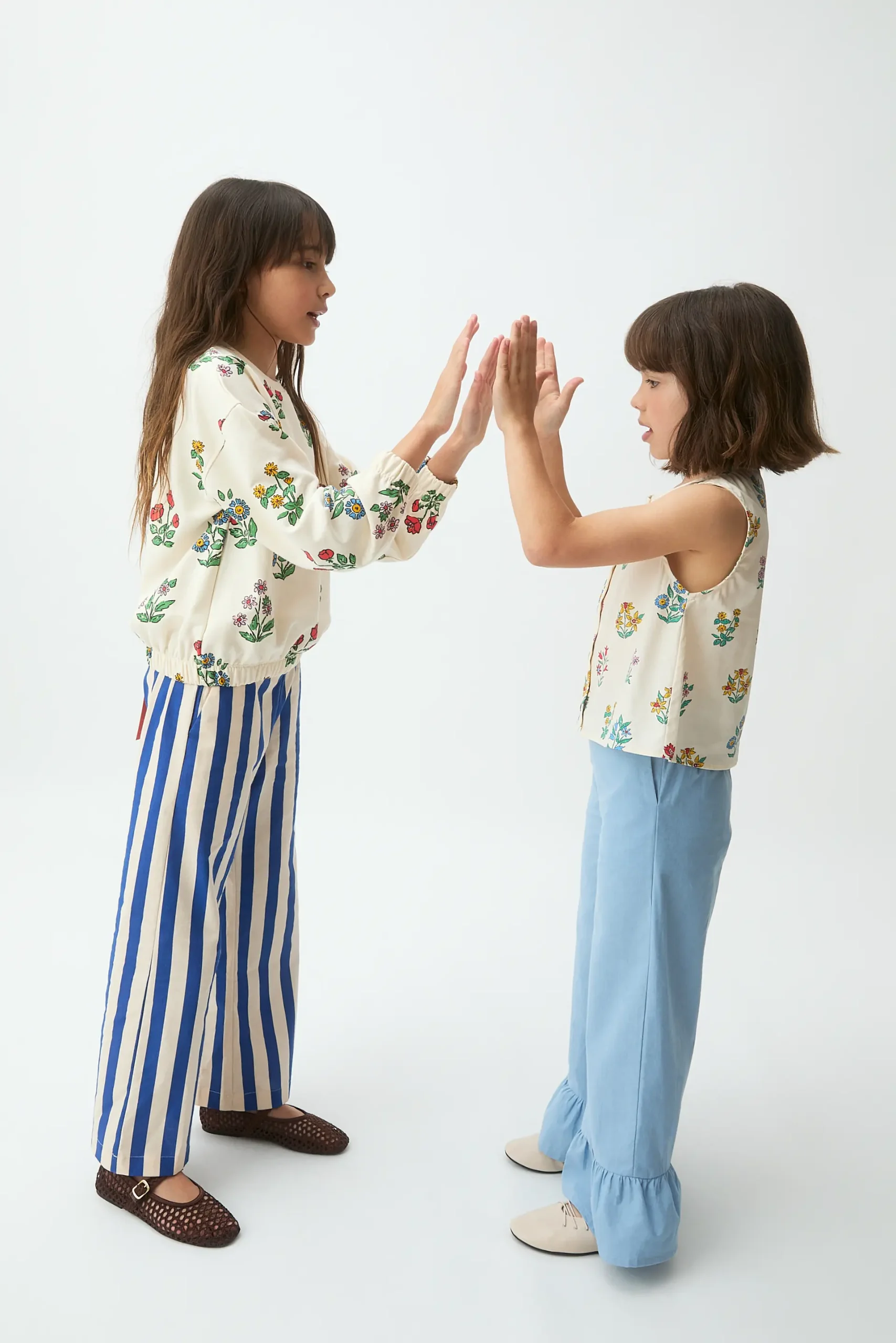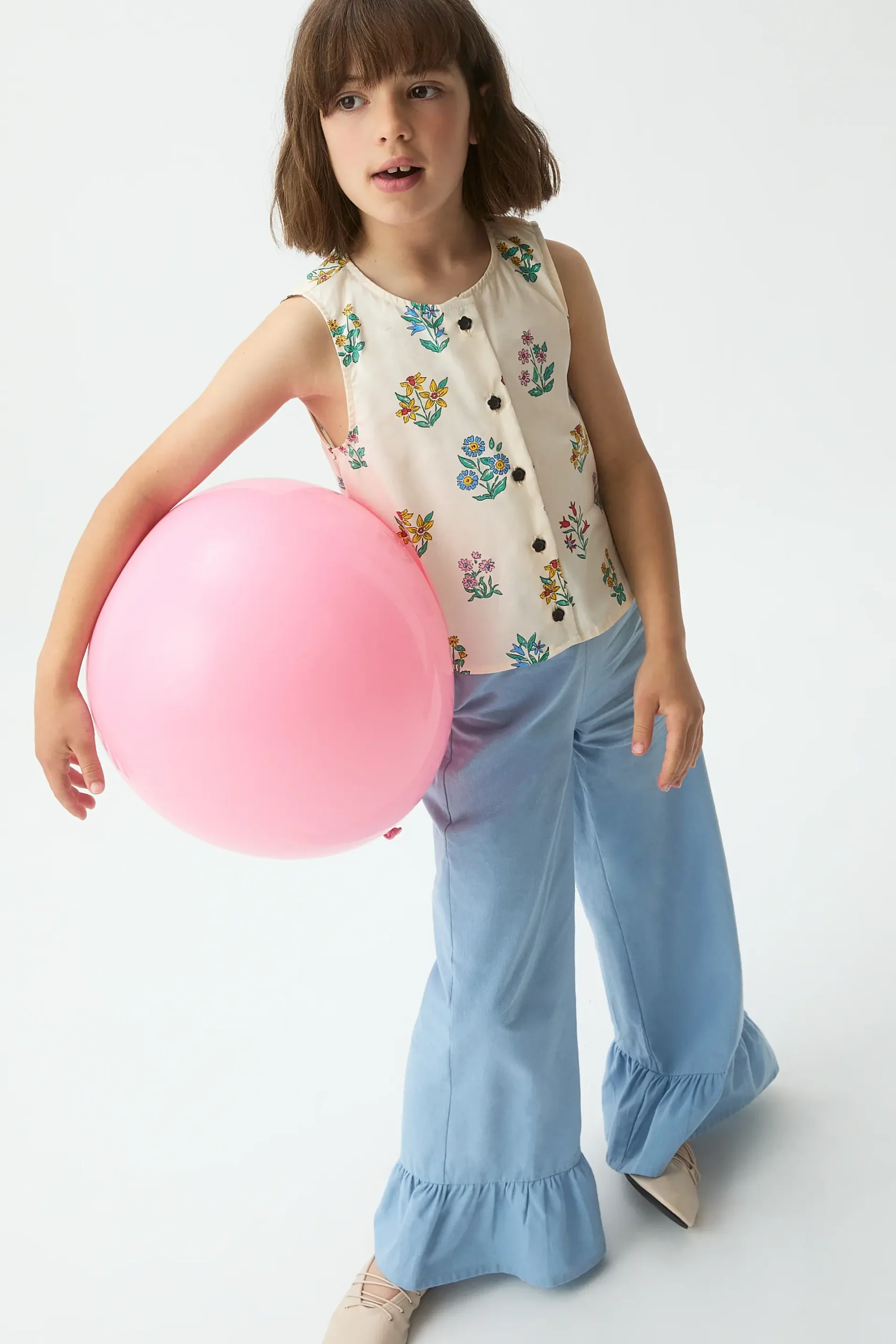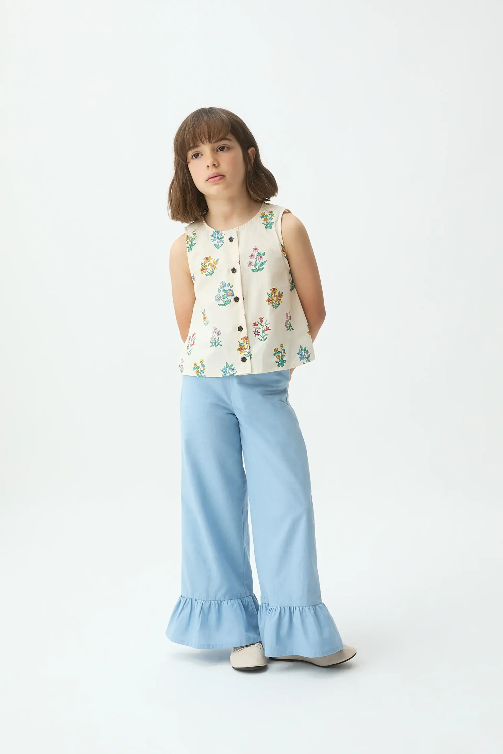 Top de niña de tejido crepé con estampado gardener. Cuello redondo y sin mangas. Cierre frontal con botones en forma de flor de color negro. La modelo mide 127 cm y lleva la talla 8-9 años.