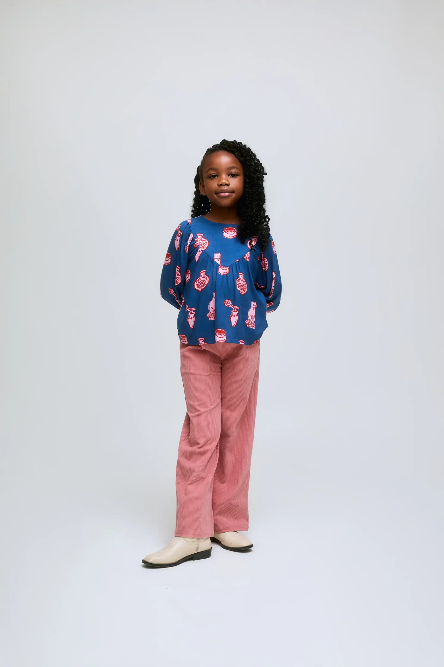 Top de niña azul de manga larga con estampado Porcelain. Con manga larga abullonada y cuello redondo con cierre en la parte posterior.
