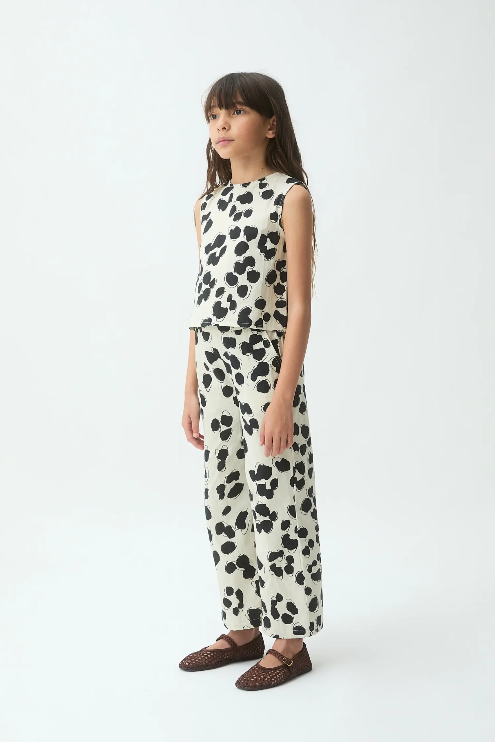 Top de niña con tejido 100% algodón con estampado dalmatian. Cuello redondo y sin mangas. La modelo mide 136 cm y lleva la talla 8-9 años.
