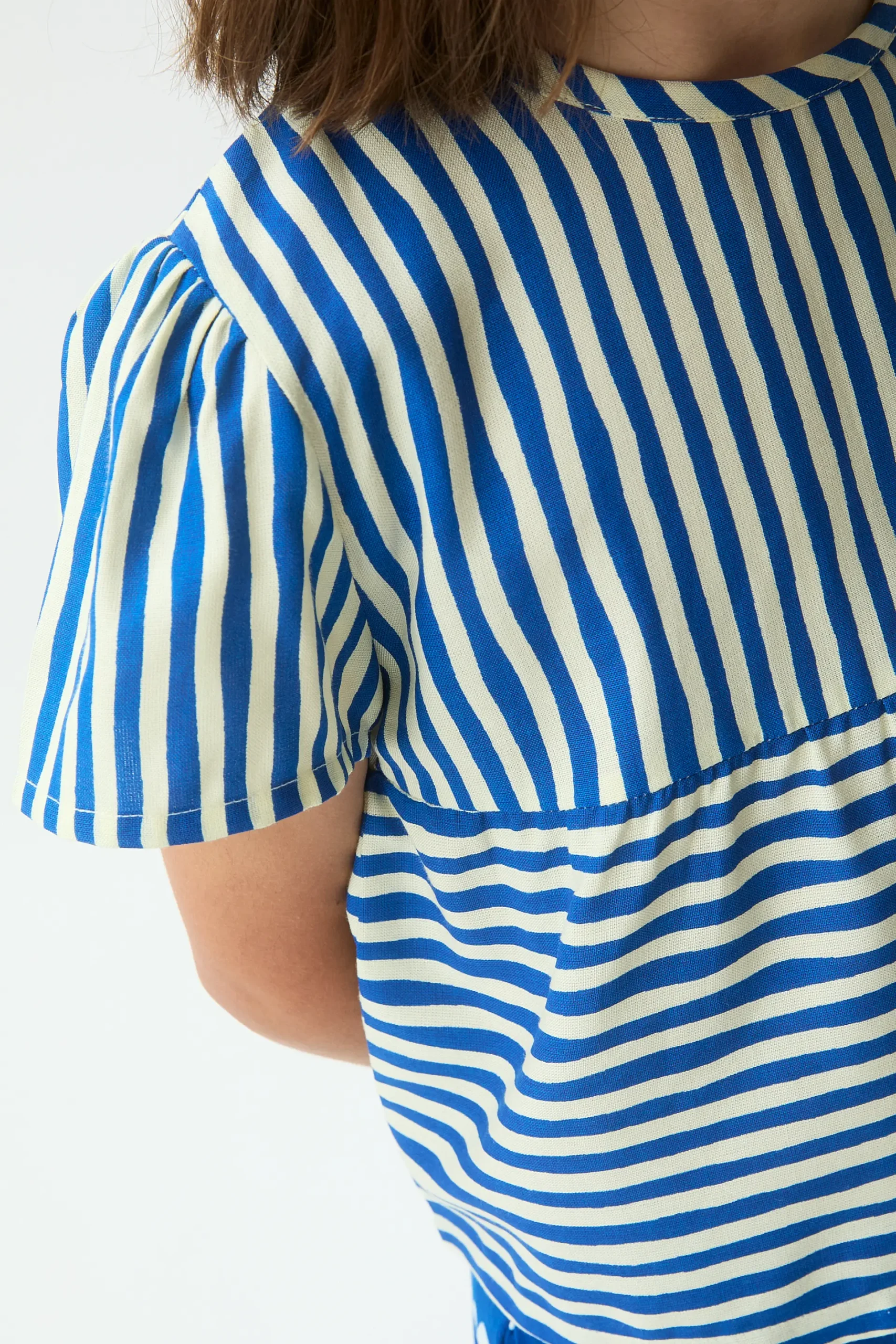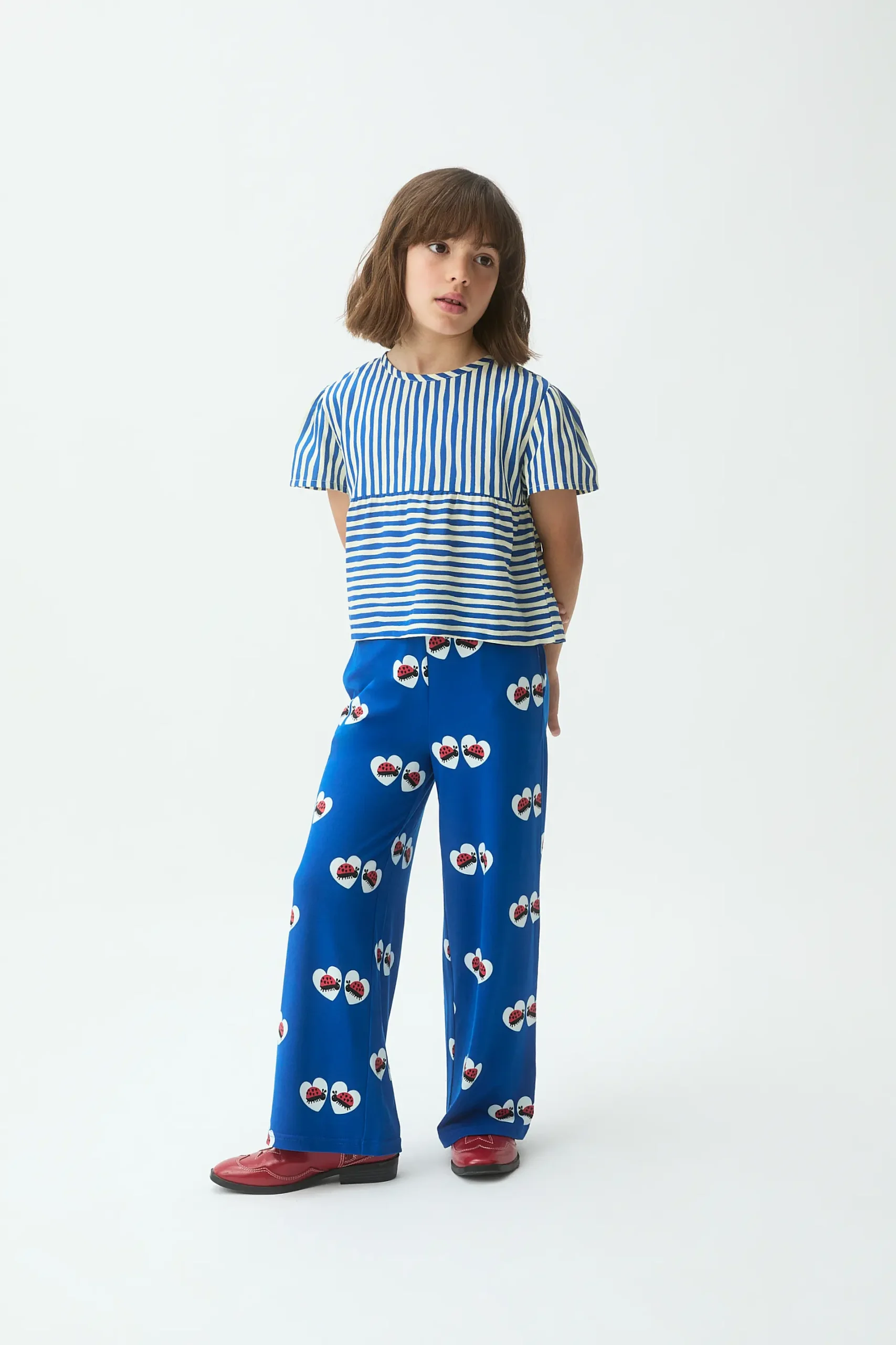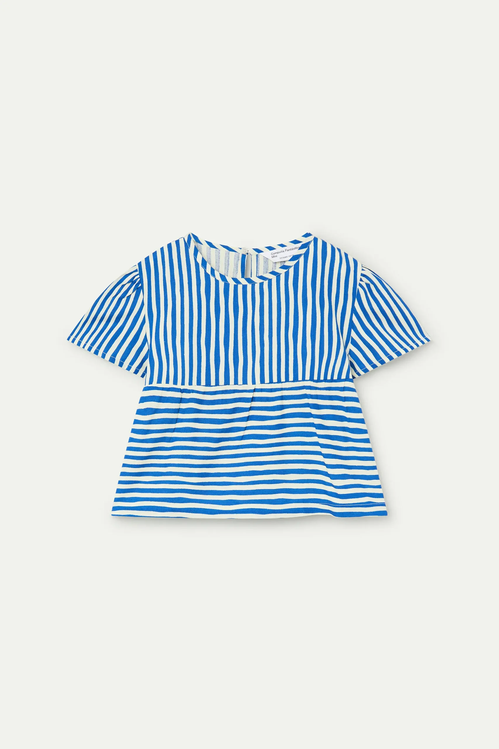 Top de niña con estampado lavagna de color azul. Cuello redondo y manga corta abullonada. La modelo mide 127 cm y lleva la talla 8-9 años.