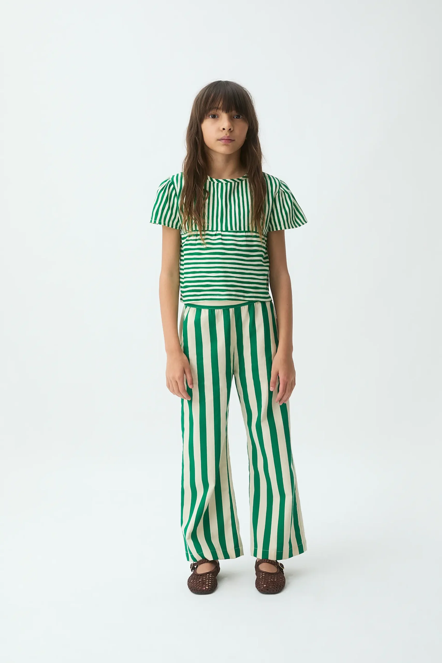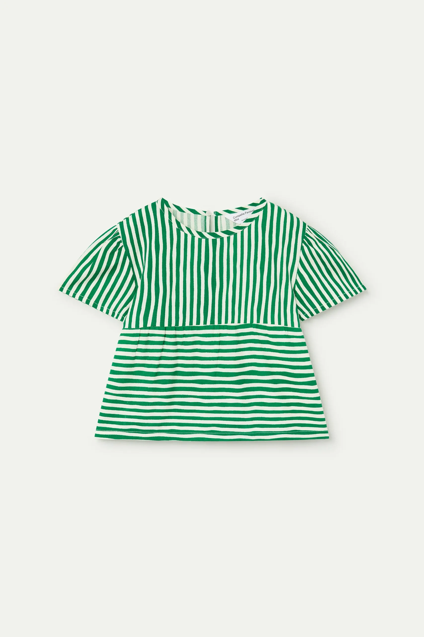 Top de niña con estampado lavagna de color verde. Cuello redondo y manga corta abullonada. La modelo mide 136 cm y lleva la talla 8-9 años.