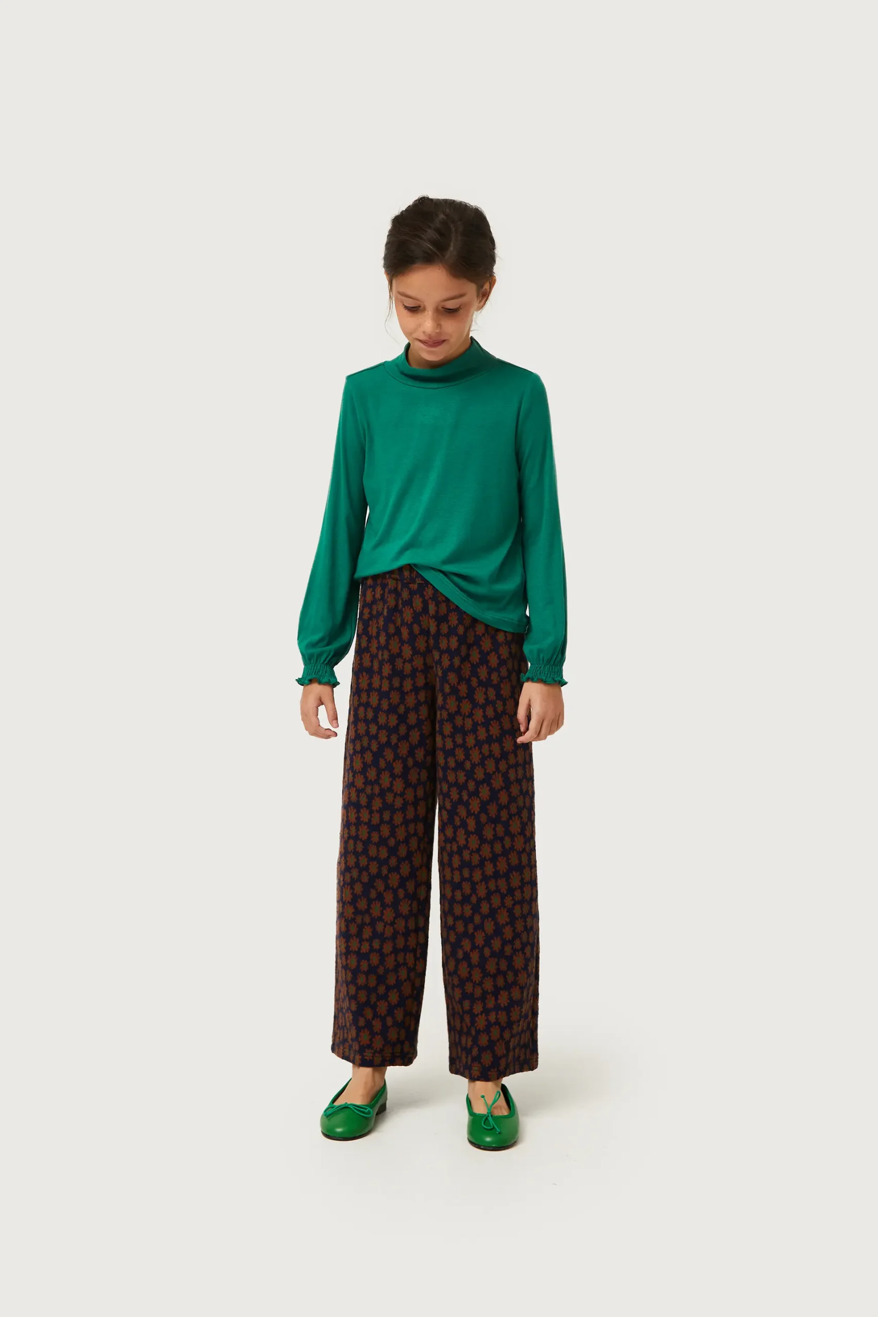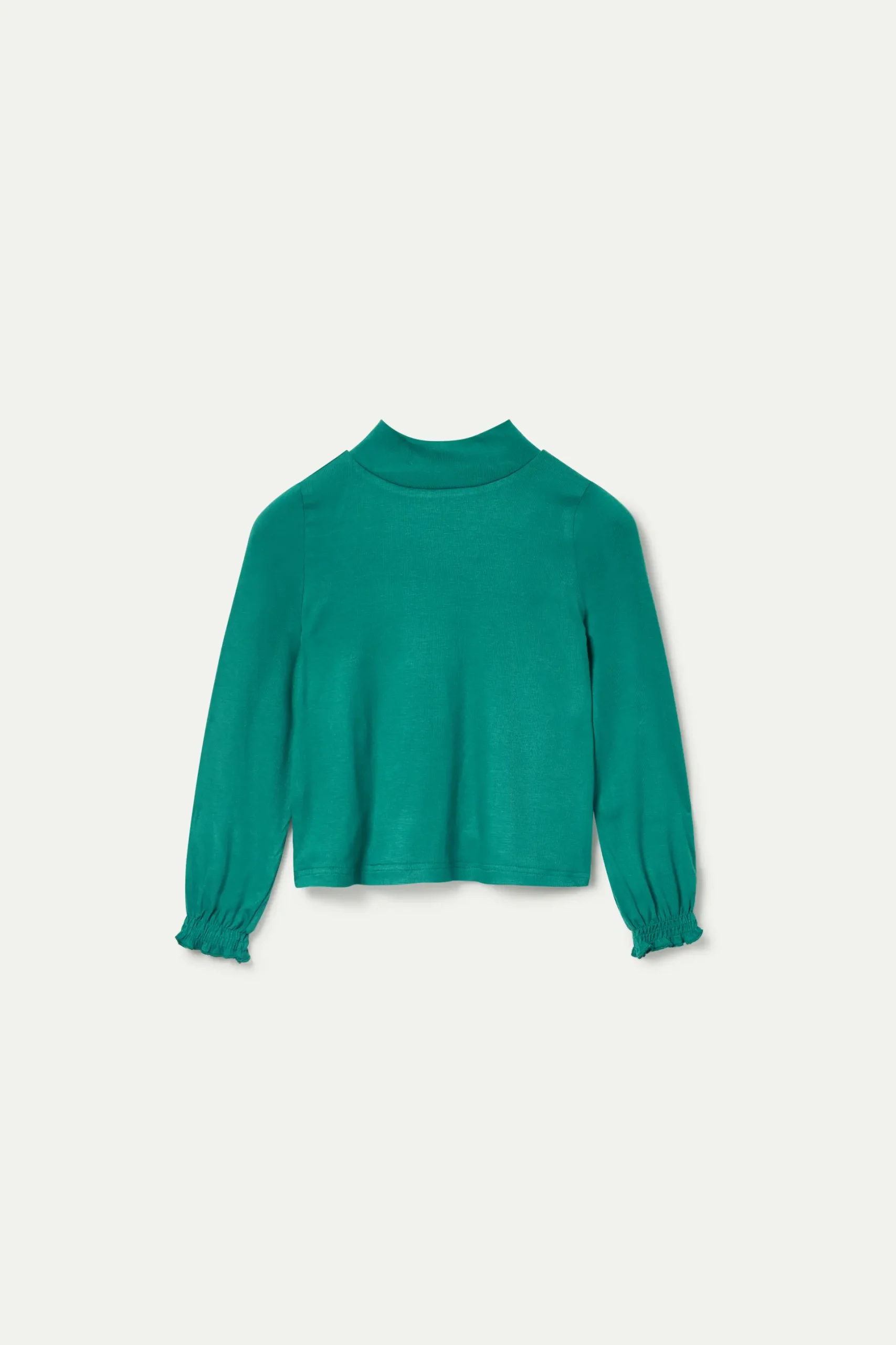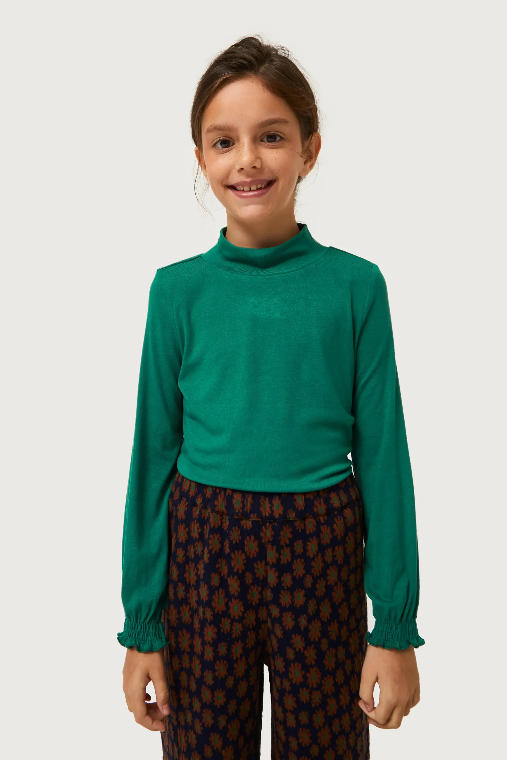 Top de niña de punto de color verde. Con cuello alto y manga larga. Detalle de puños fruncidos. La modelo mide 134 cm y lleva la talla 8.