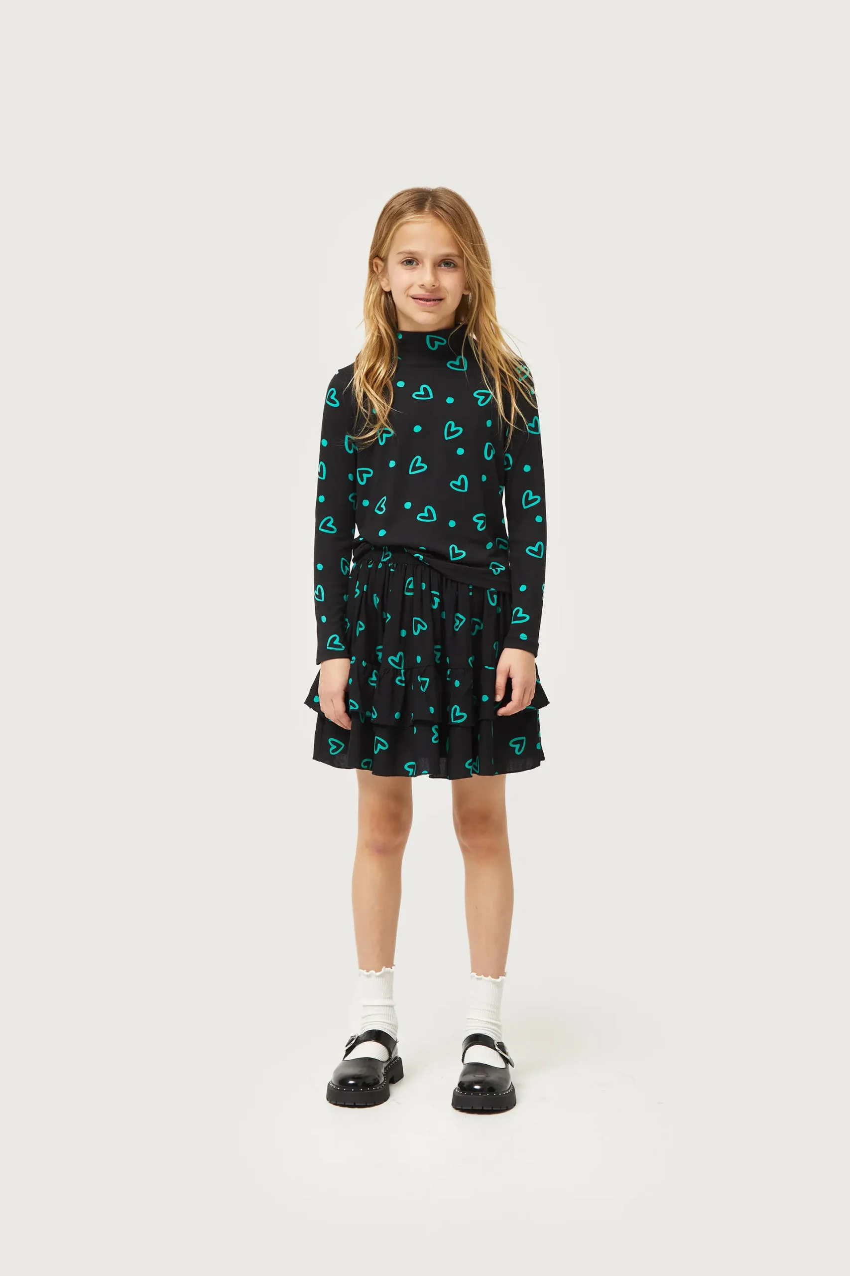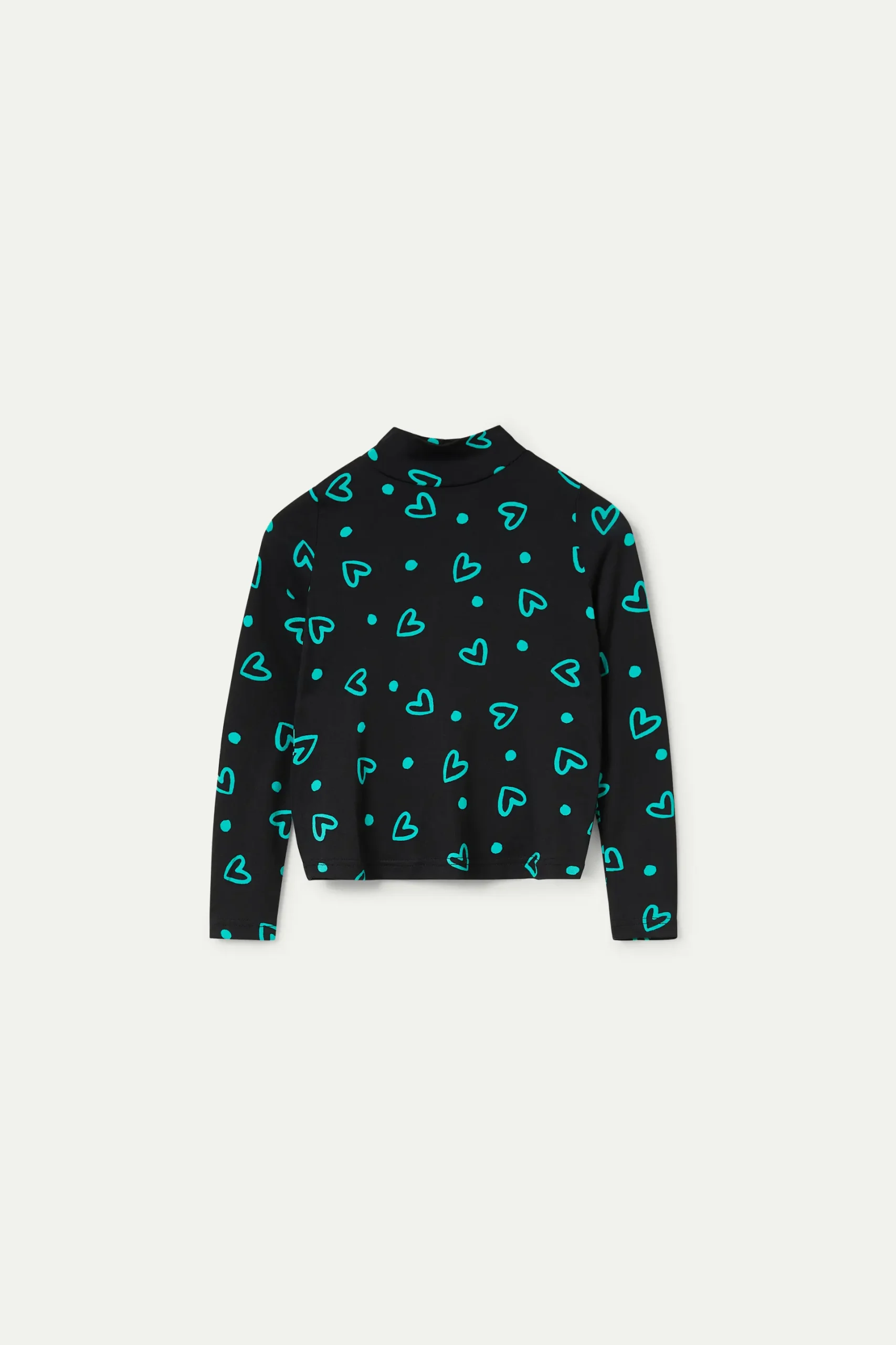 Top de niña de punto de color negro con estampado de corazones verdes. Con cuello perkins y manga larga. La modelo mide 140 cm y lleva la talla 8.