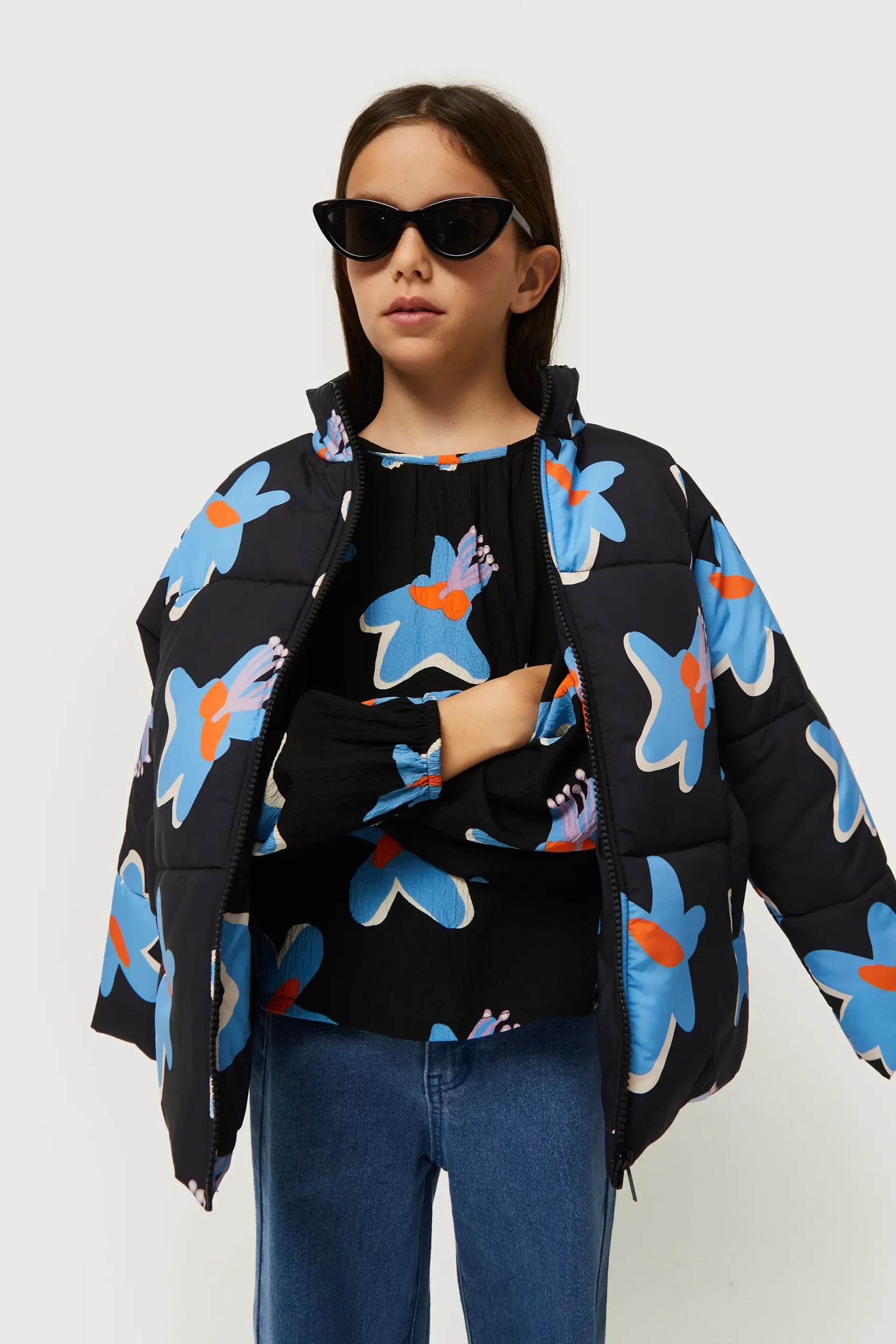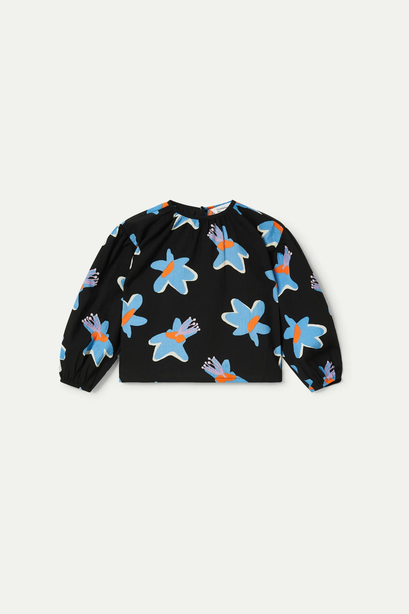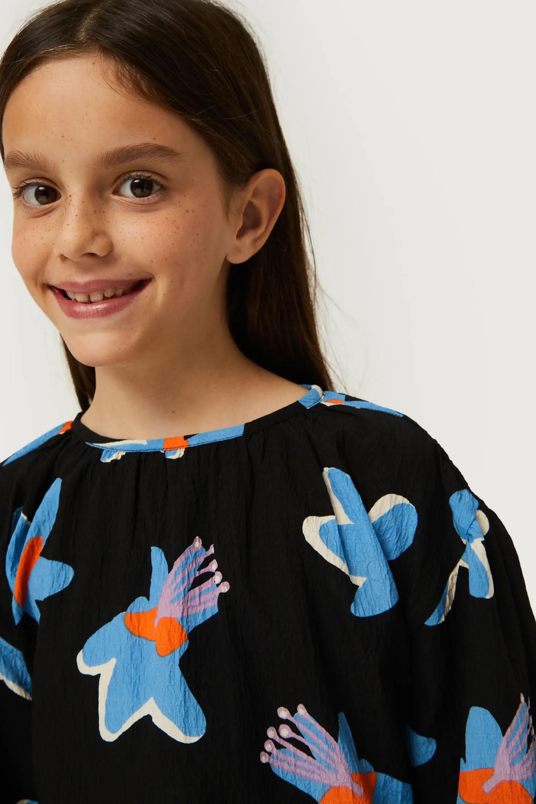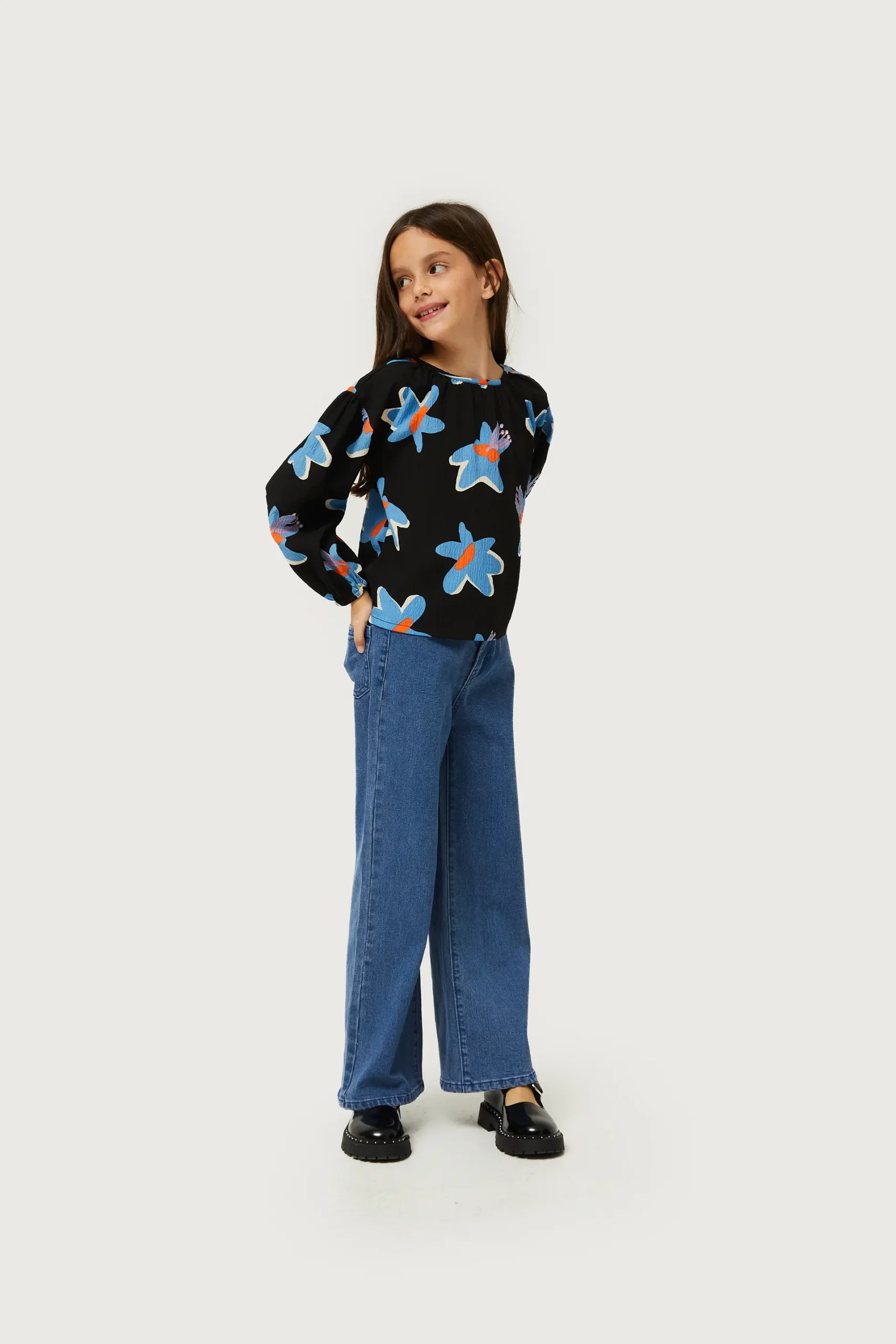 Top de niña en crepé de color negro con estampado de flores azules y amarillas. Con cuello redondo y manga larga. Acabado texturizado. La modelo mide 134 cm y lleva la talla 8.