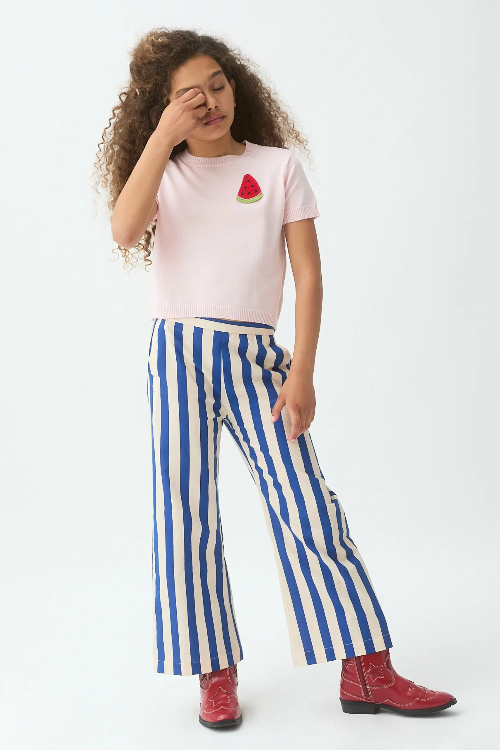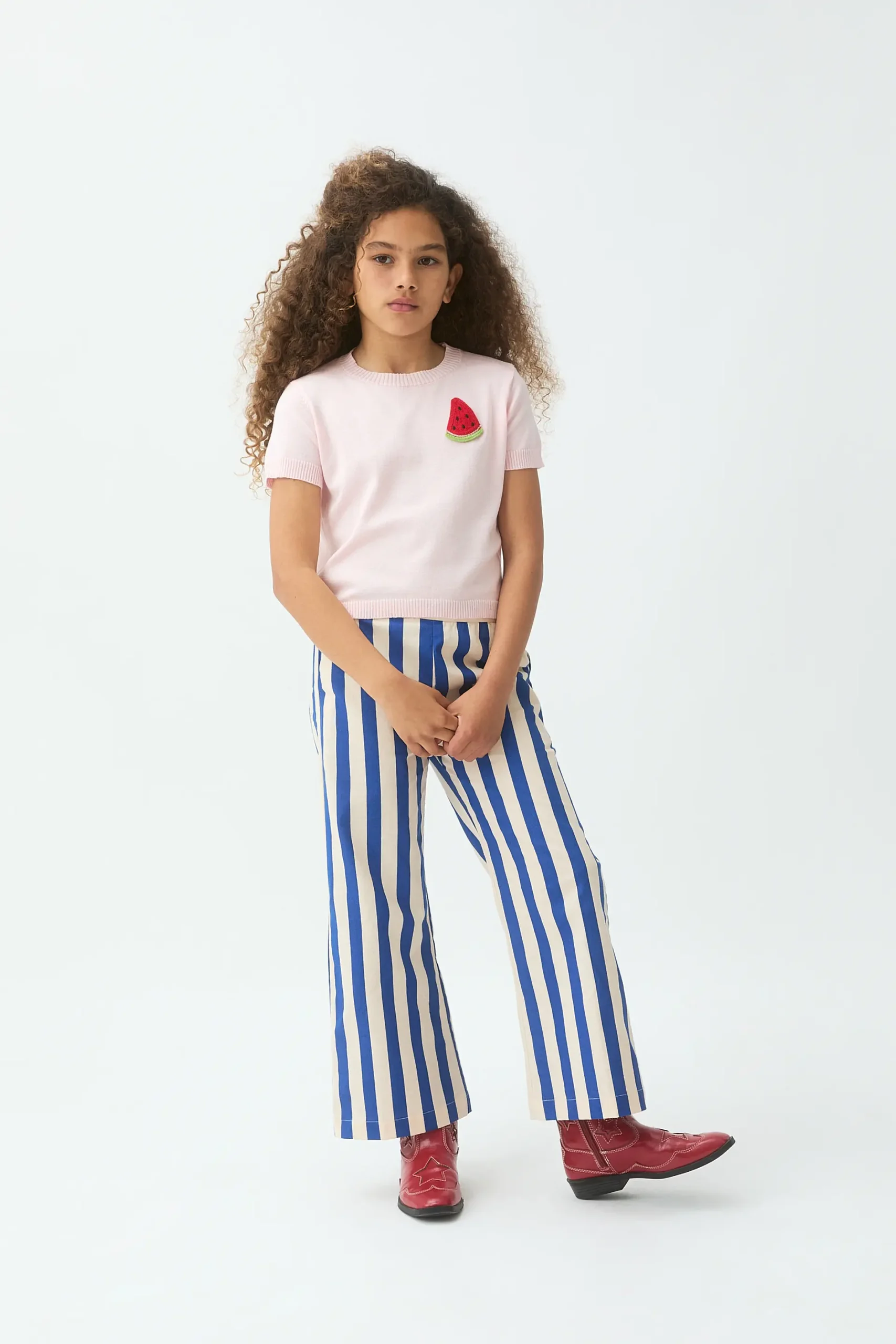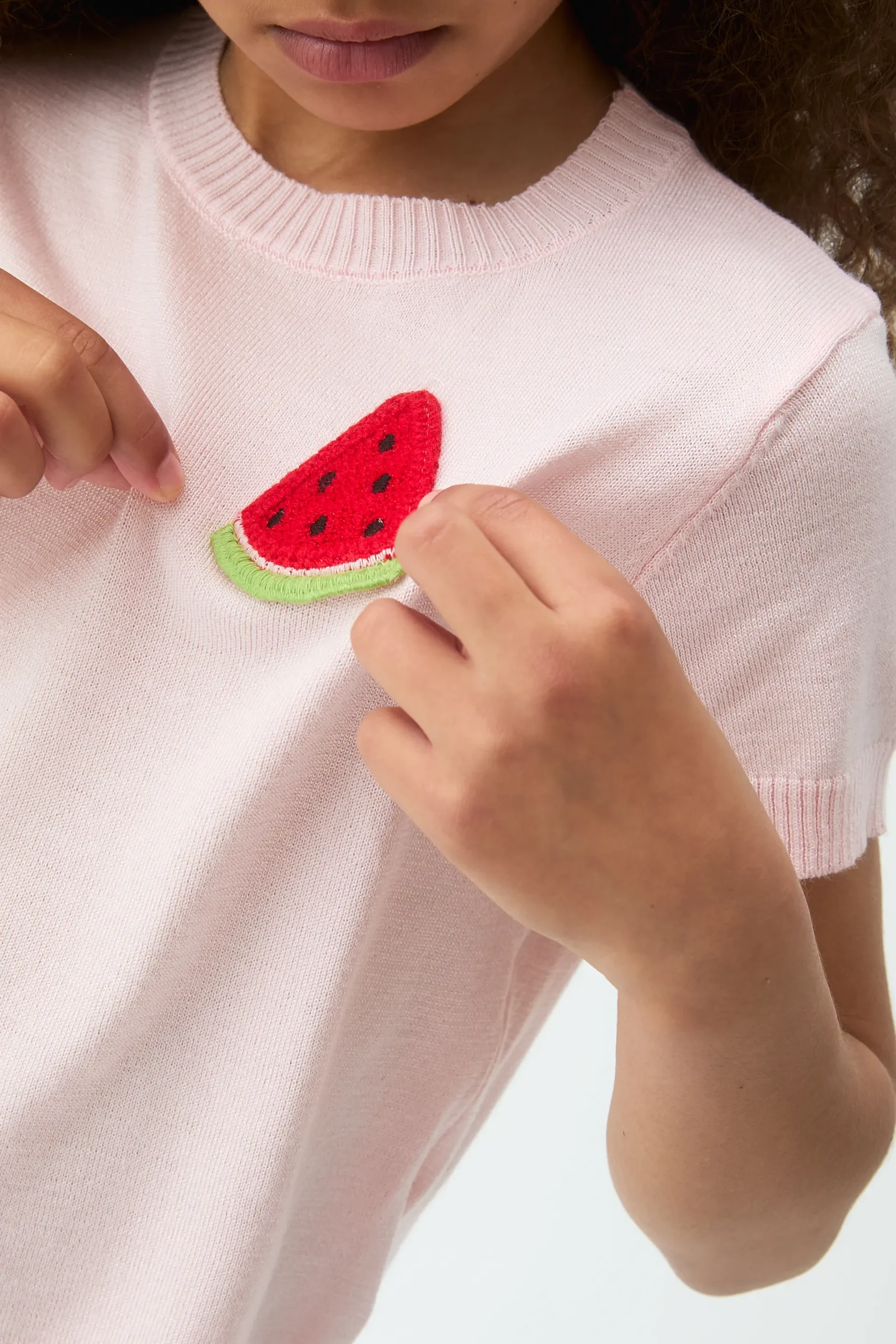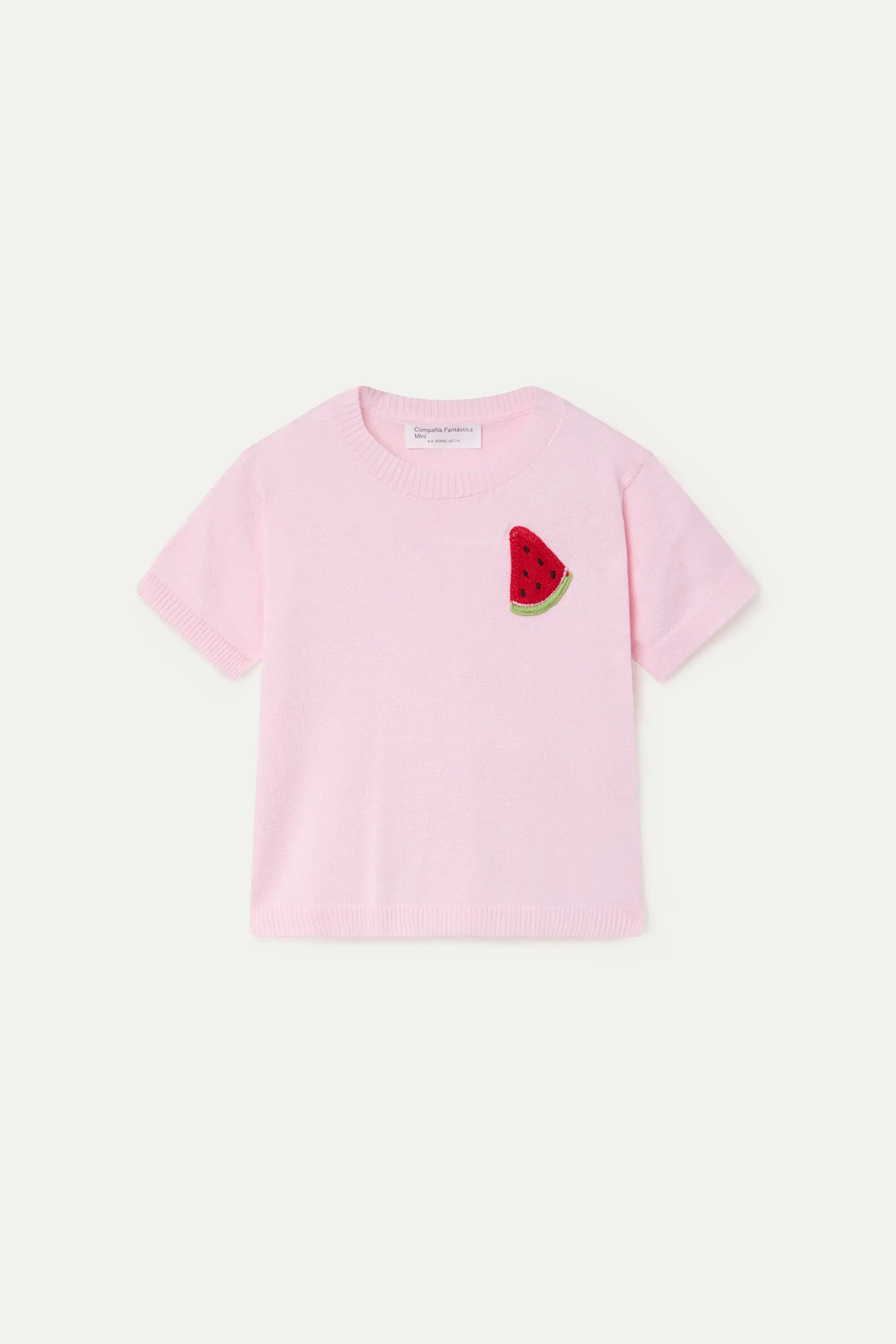 Top con tejido punto de color verde y detalle de sandía bordada. Cuello redondo y manga corta. Detalles acabados en rib. La modelo mide 135 cm y lleva la talla 8-9 años