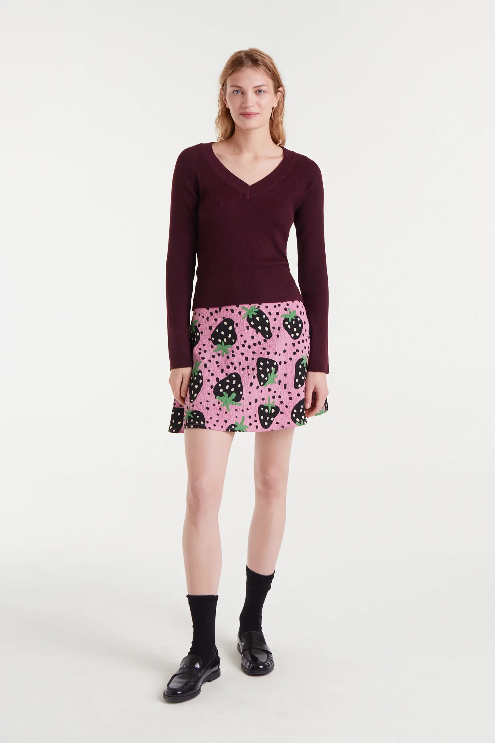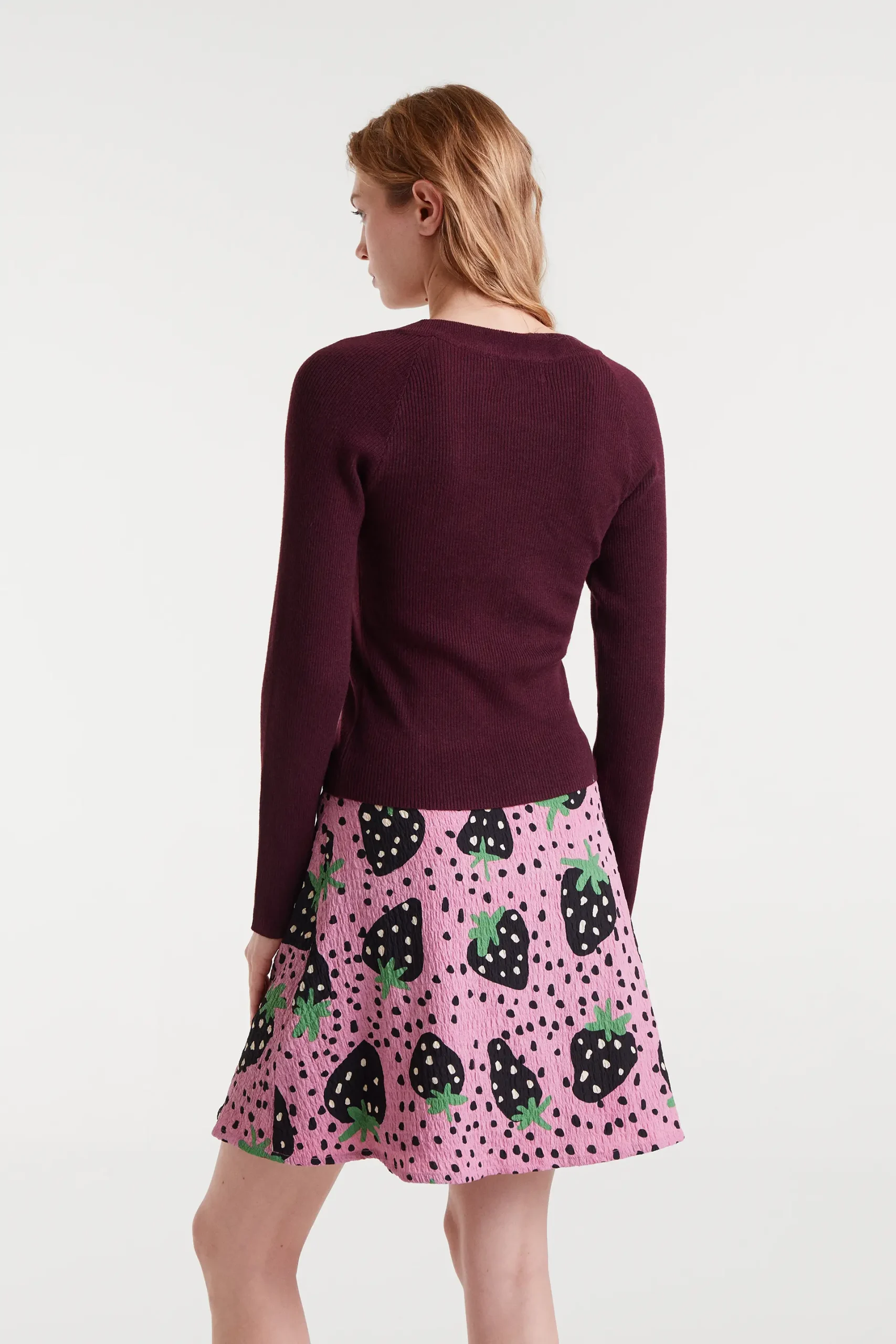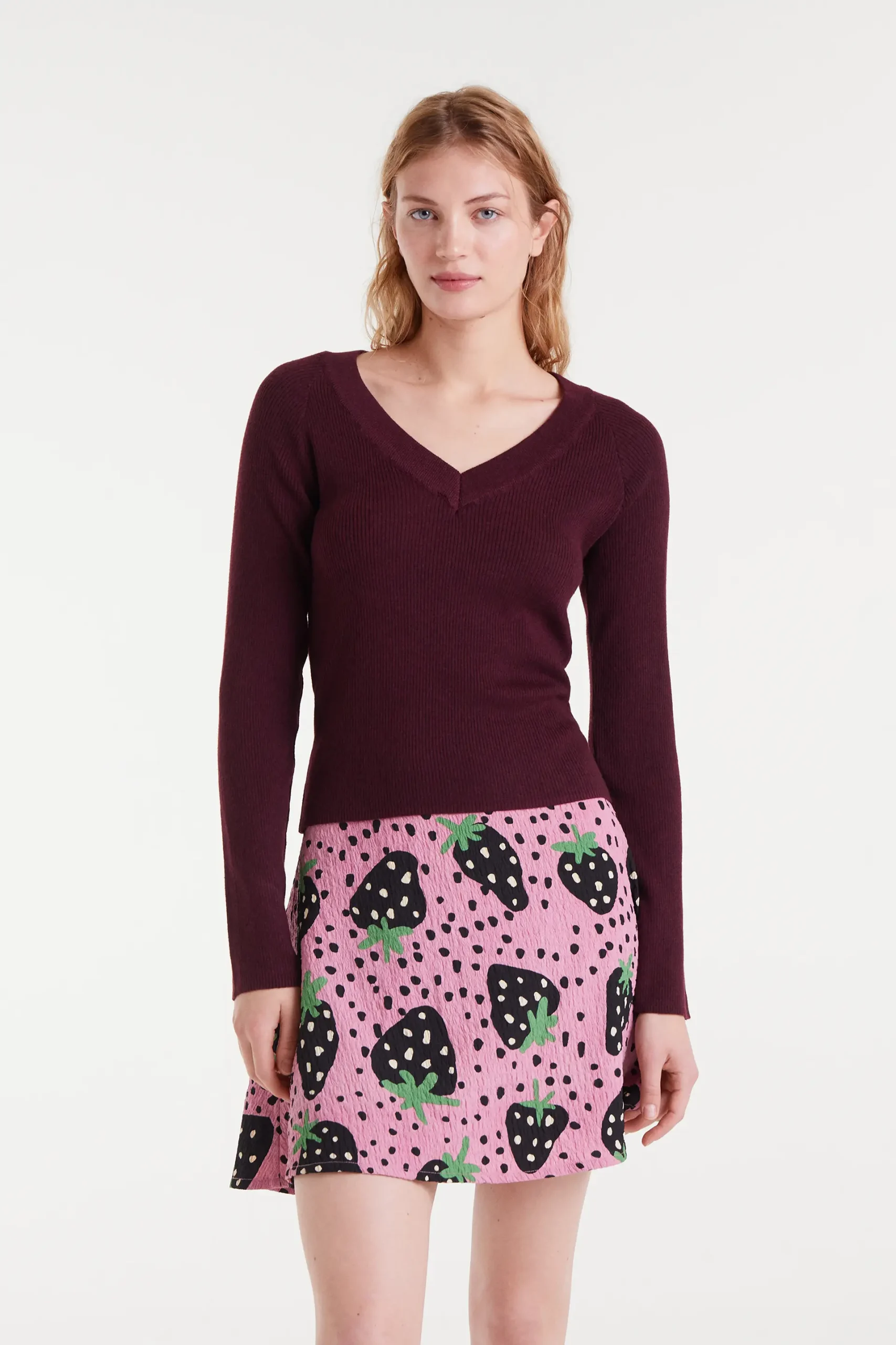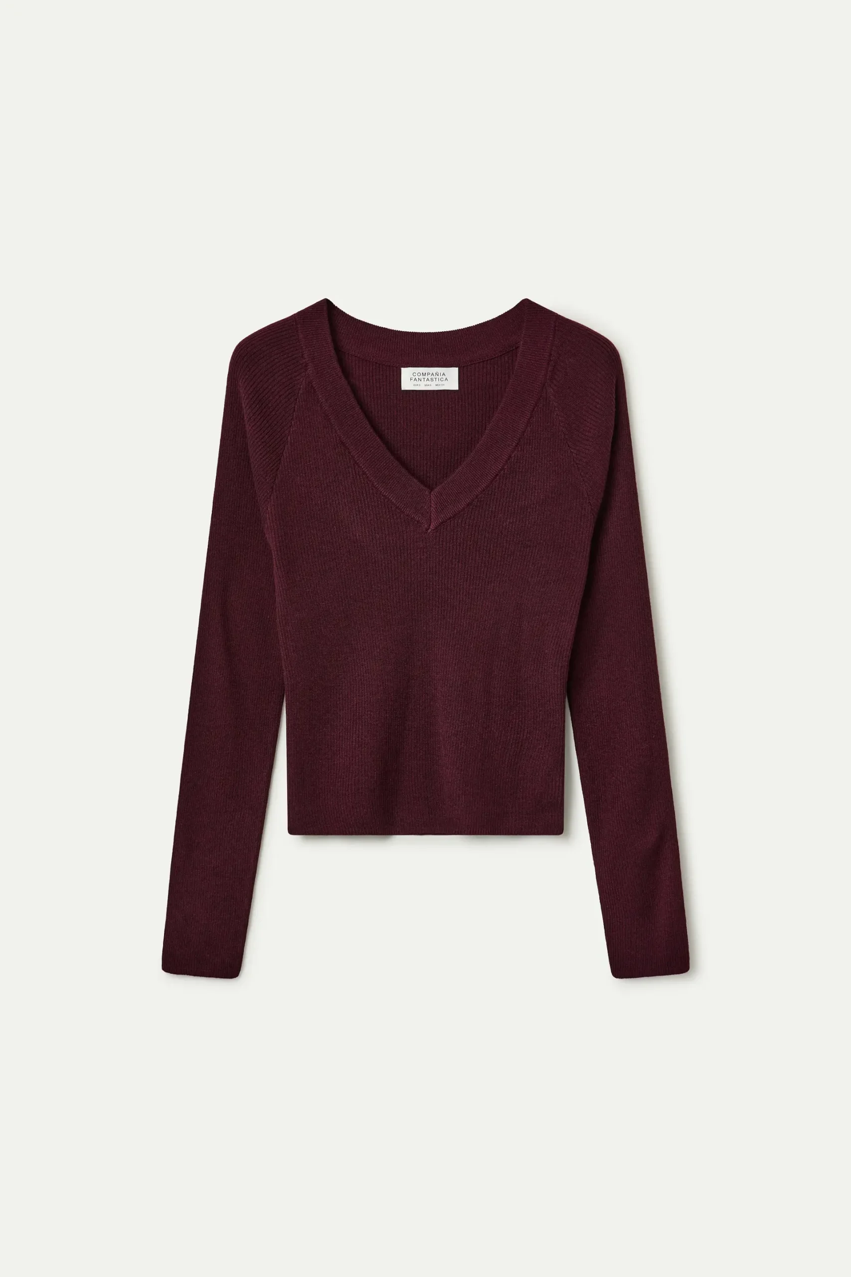 Top con tejido de punto de color berenjena. Escote pico y manga larga. Detalles acabados en rib.
