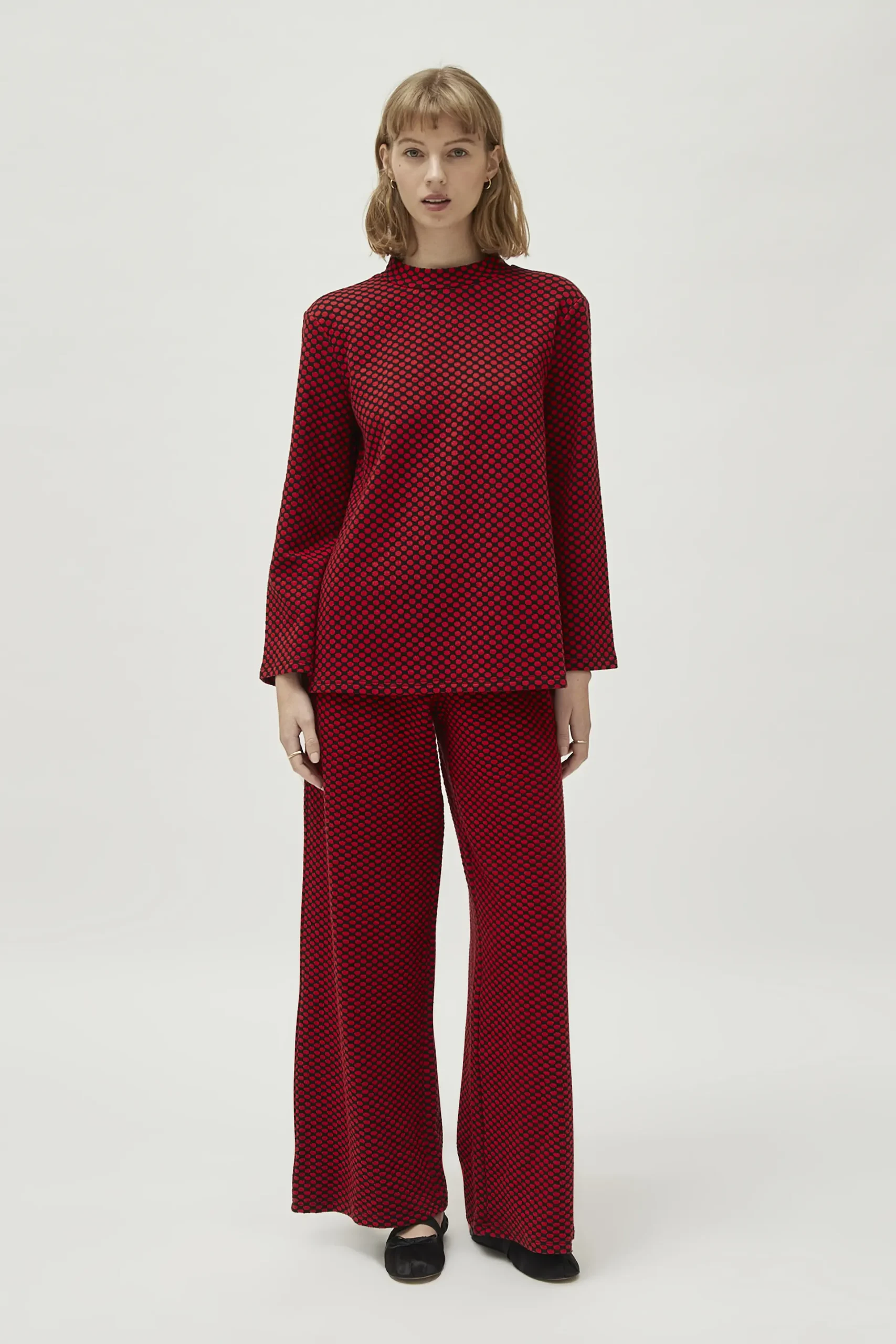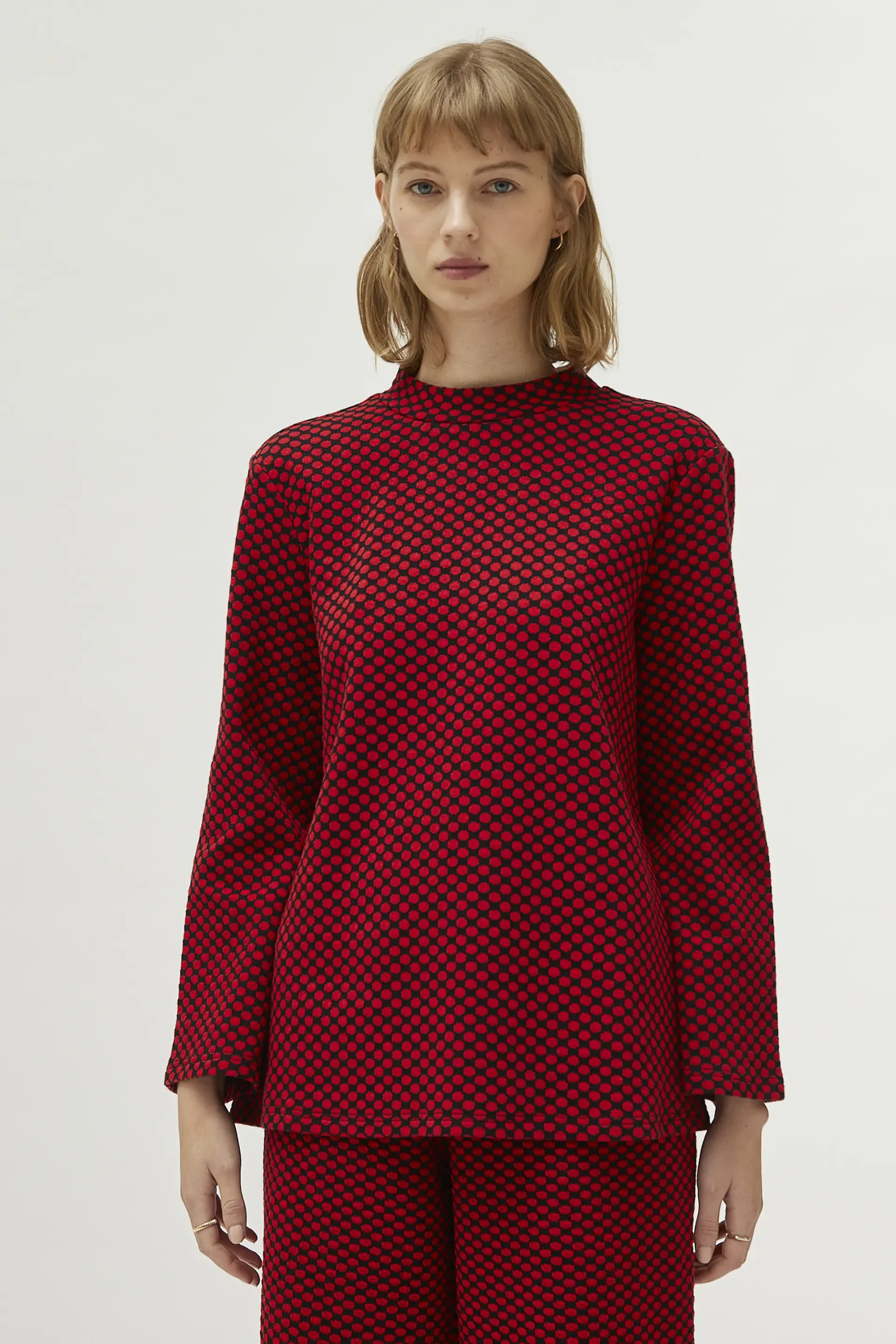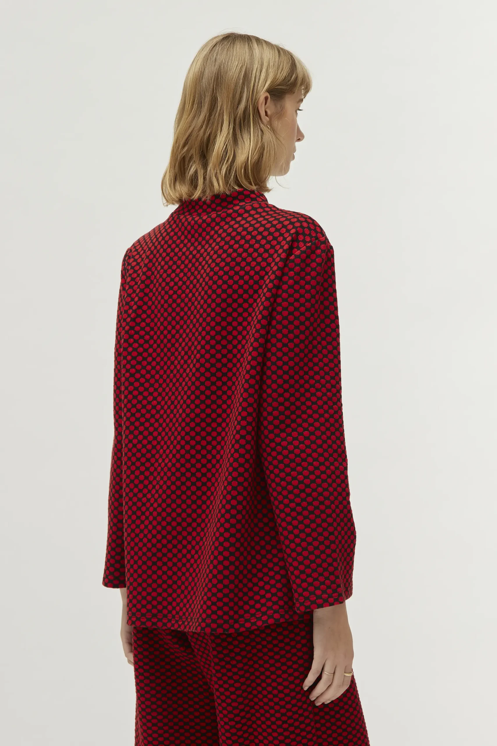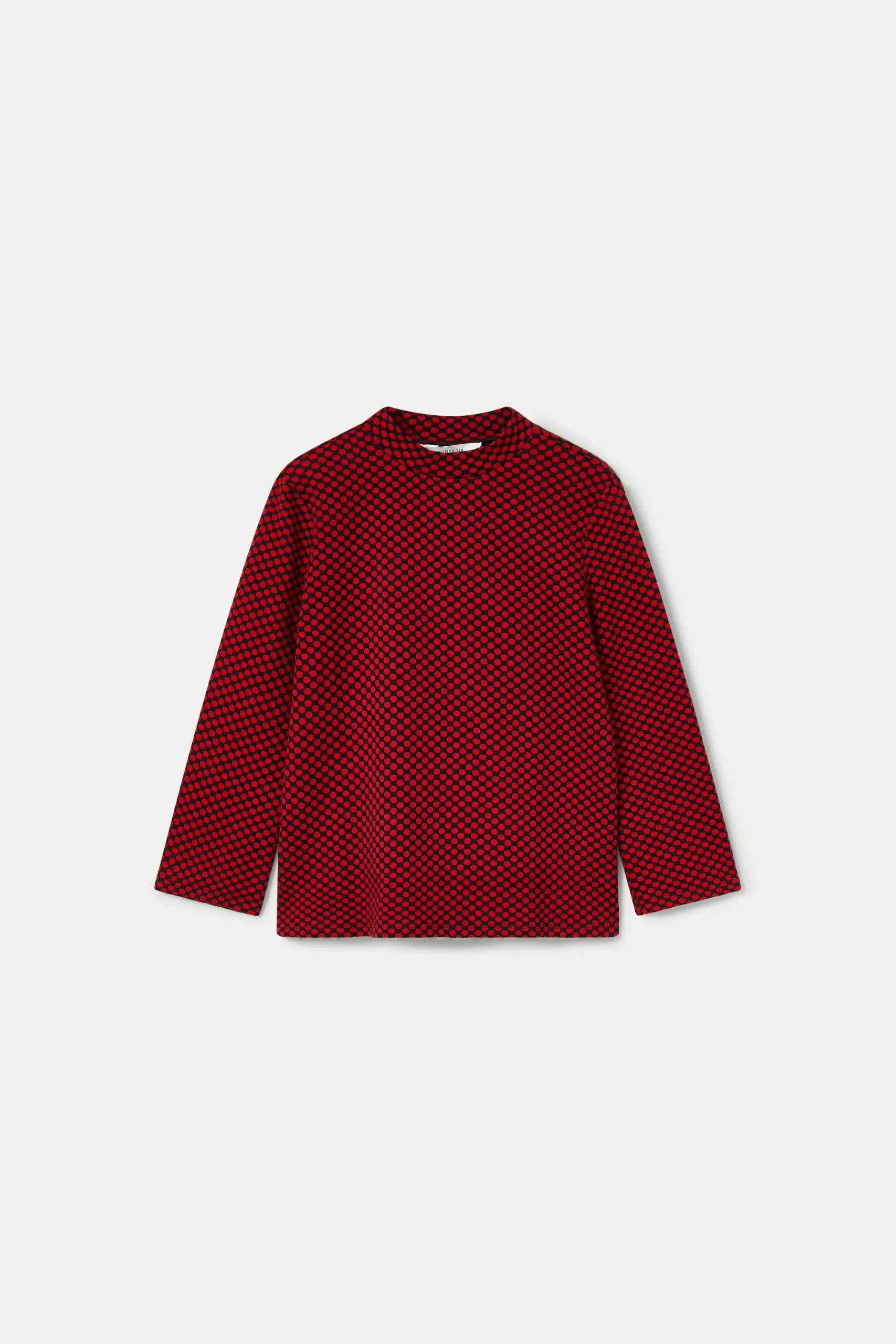 Top de punto jacquard con fondo negro y estampado de lunares rojos. Con cuello redondo y manga larga. La modelo mide 177 cm y lleva la talla S.