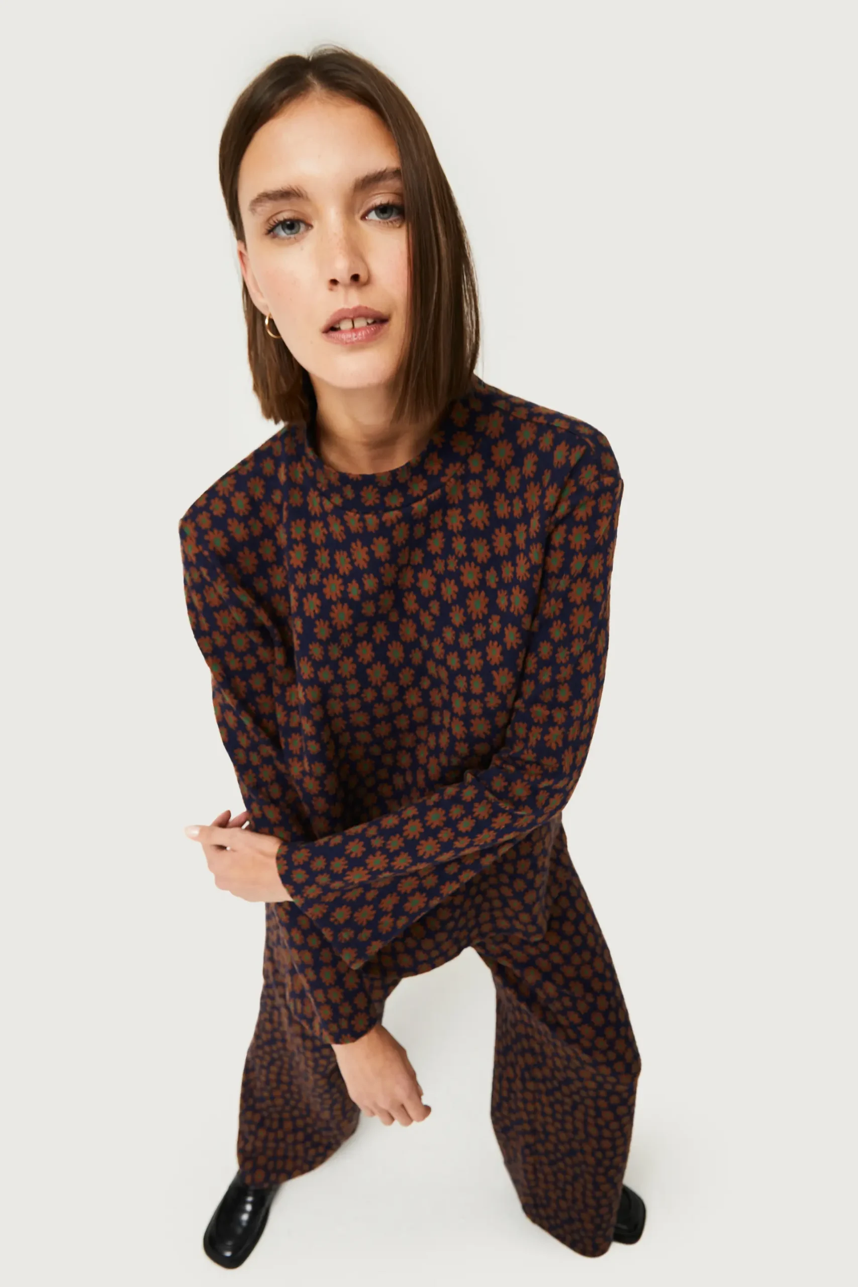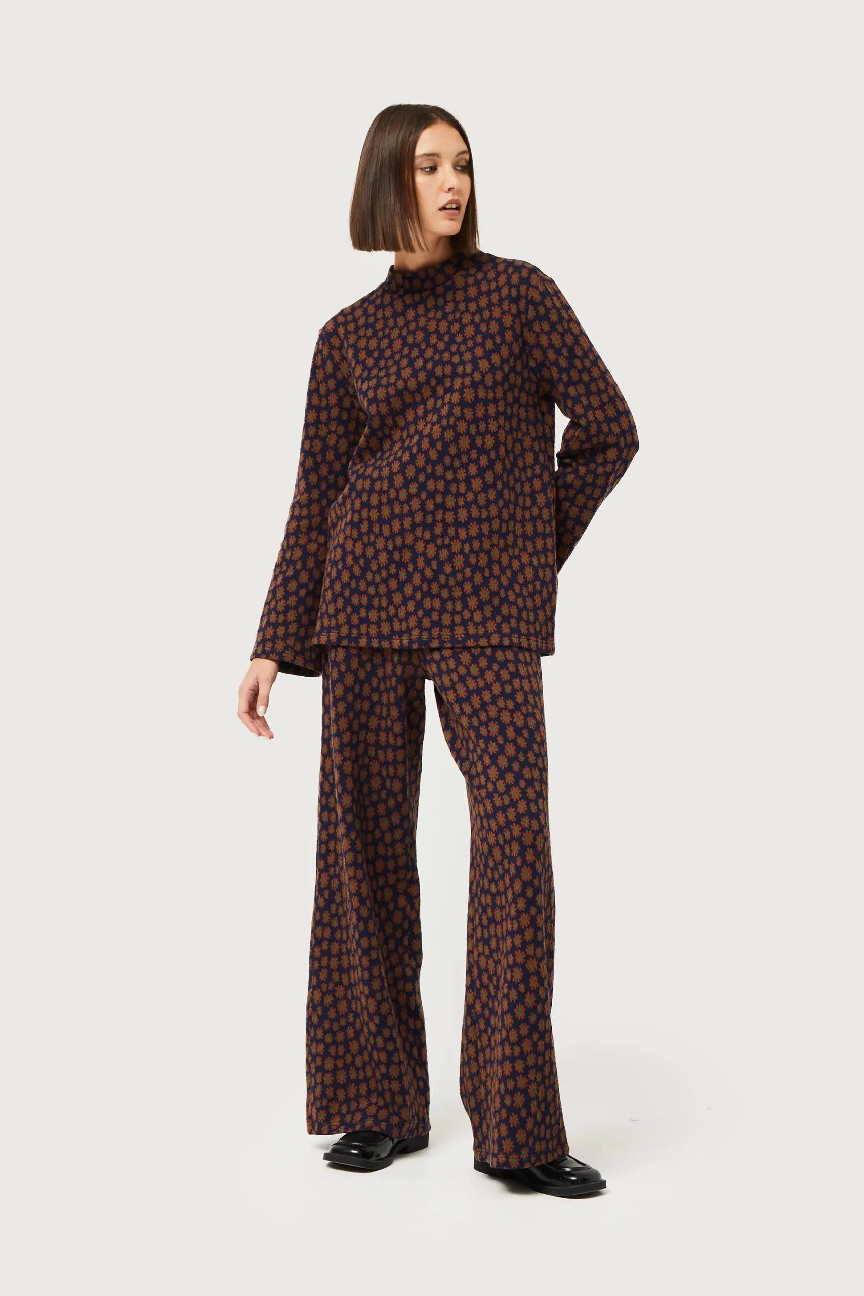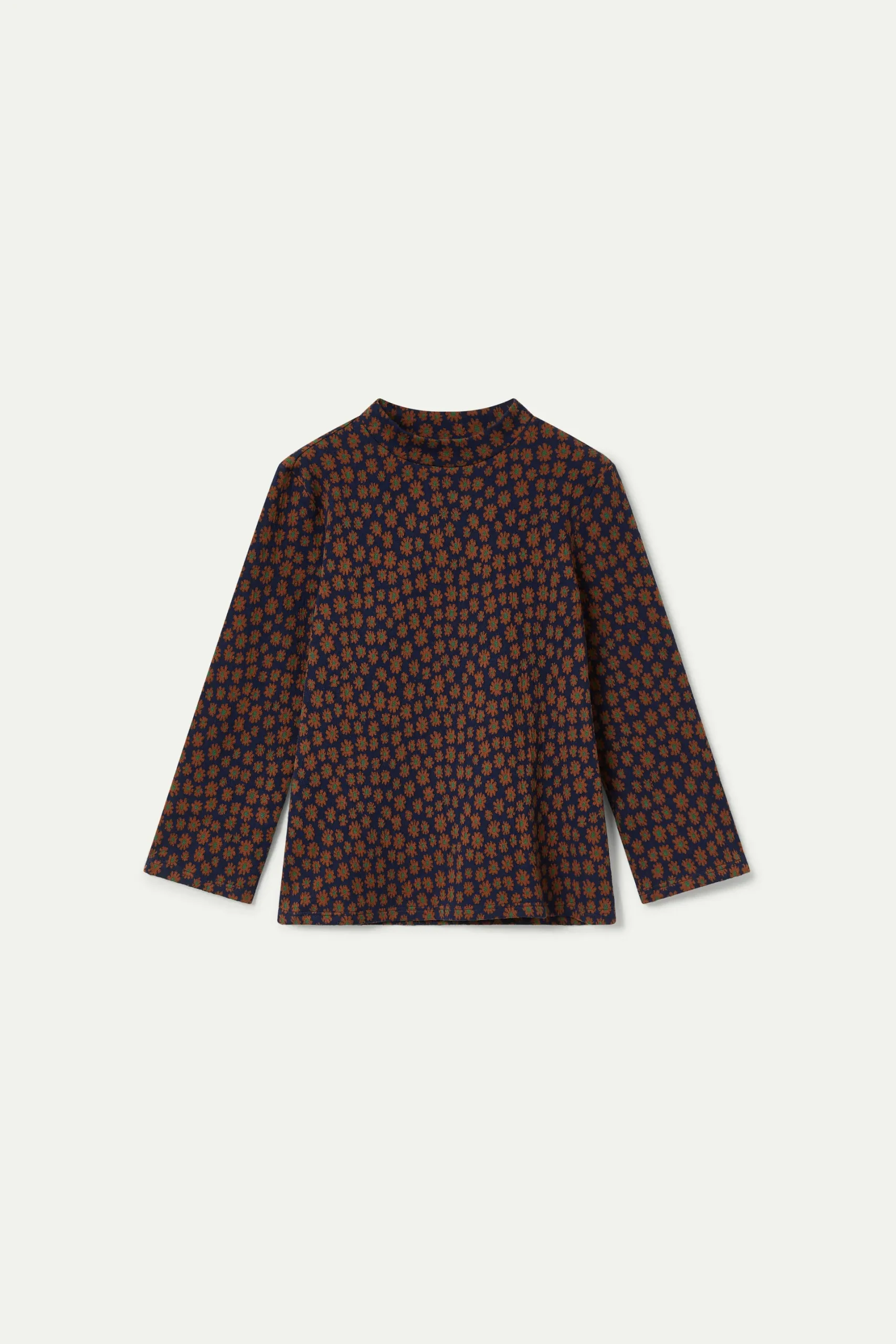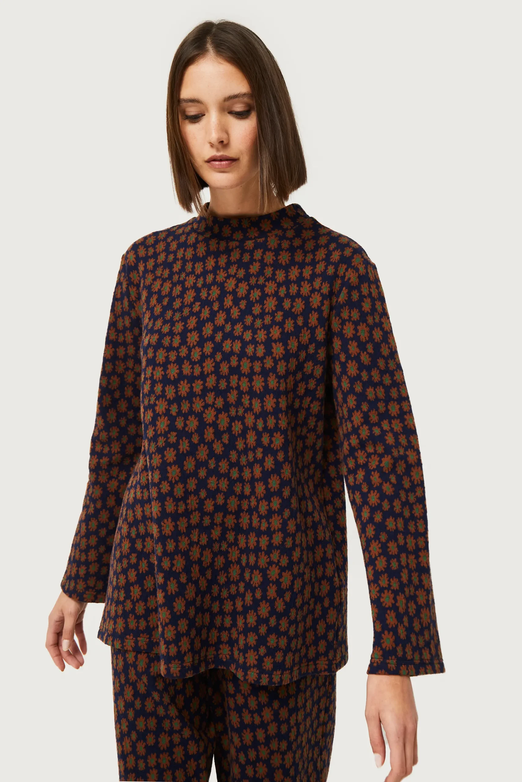 Top de punto jacquard de color azul marino con estampado de flores marrones. Con cuello mock y manga larga. La modelo mide 176 cm y lleva la talla S.