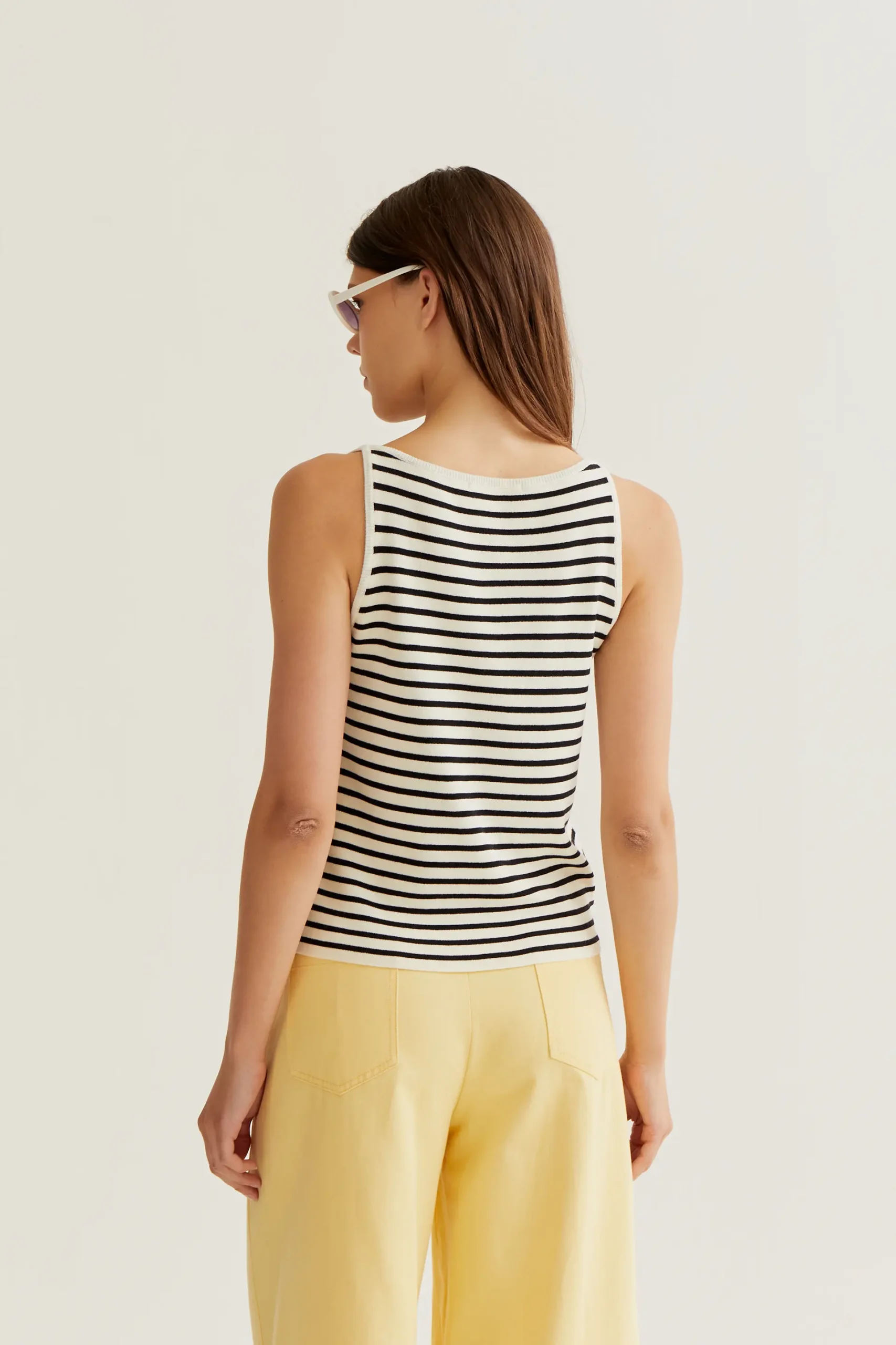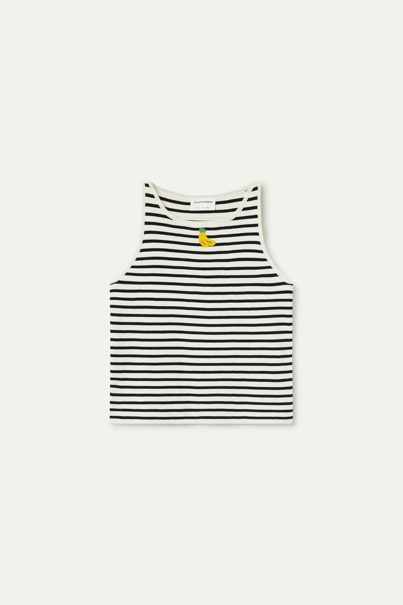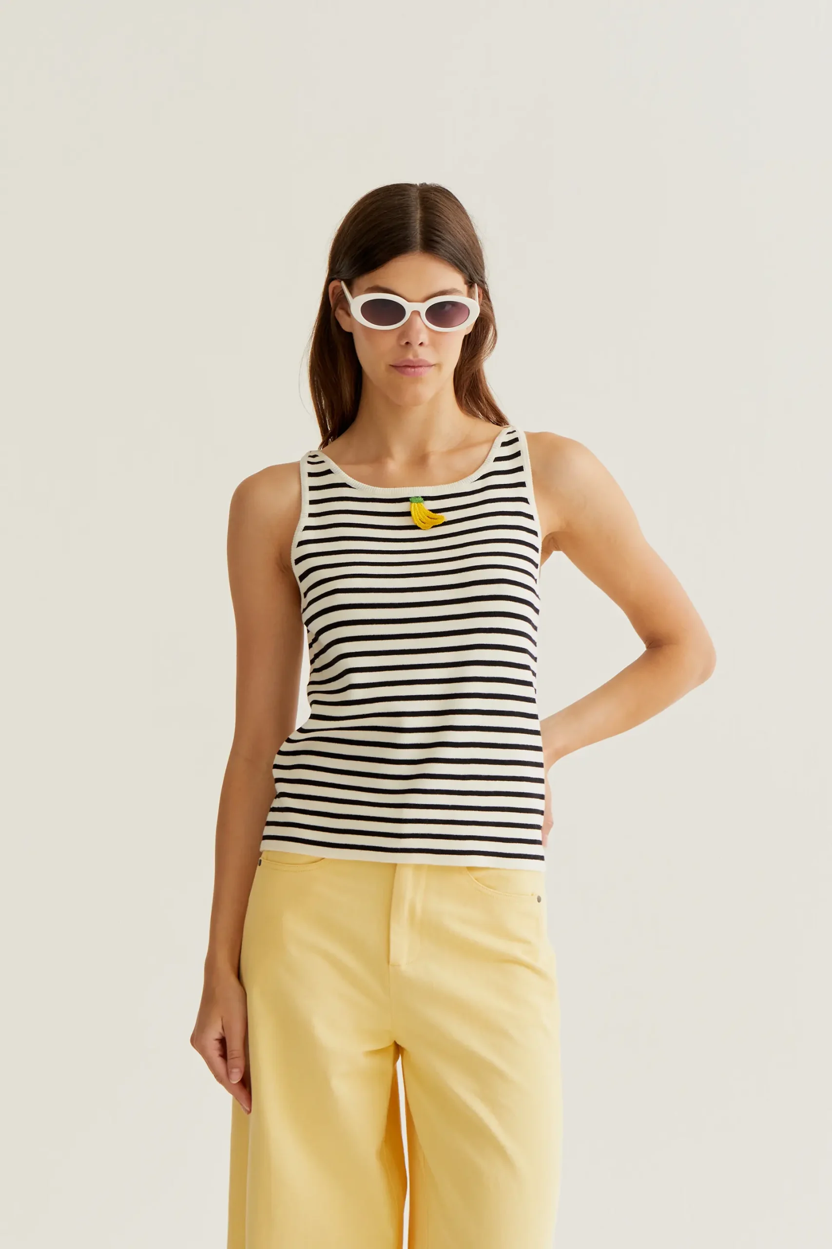 Top con tejido punto de raya estampada de color blanco y negro. Cuello redondo y sin mangas. Detalle de banana bordada. Acabados en rib. La modelo mide 177 cm y lleva la talla S.