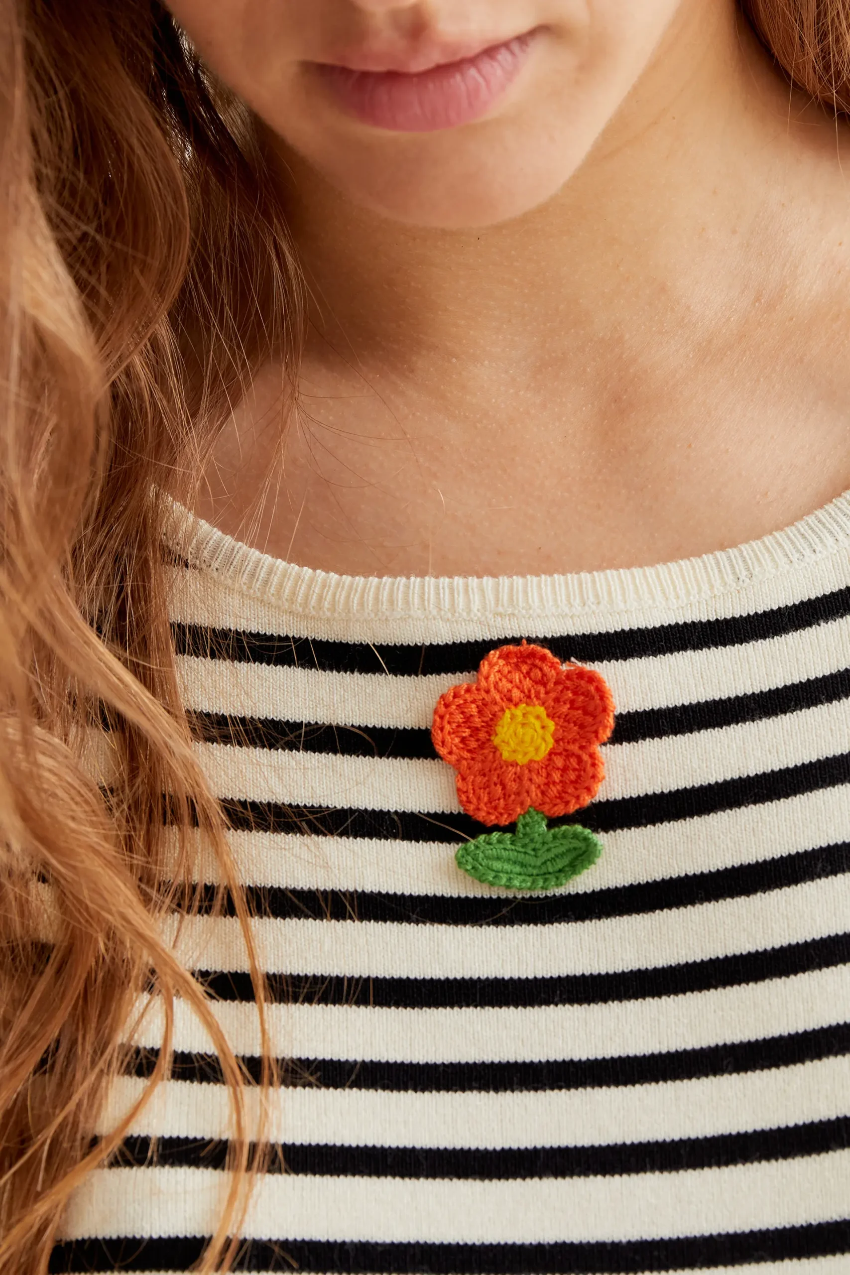 Top de rayas blanco y negro con bordado de flor