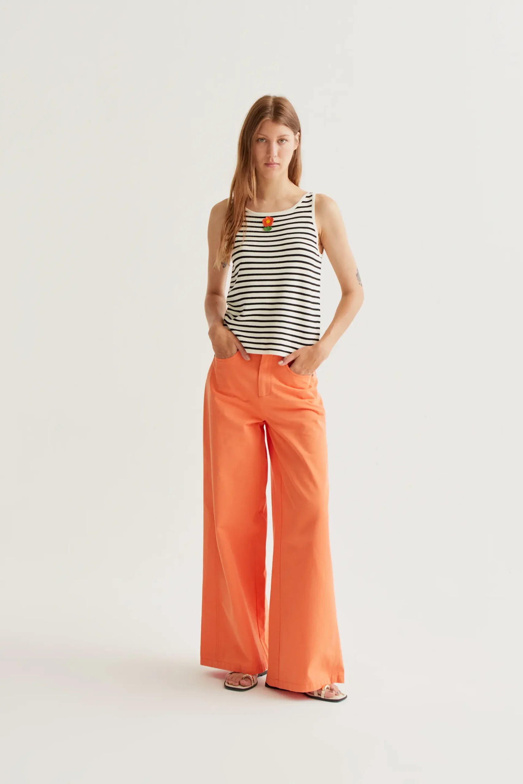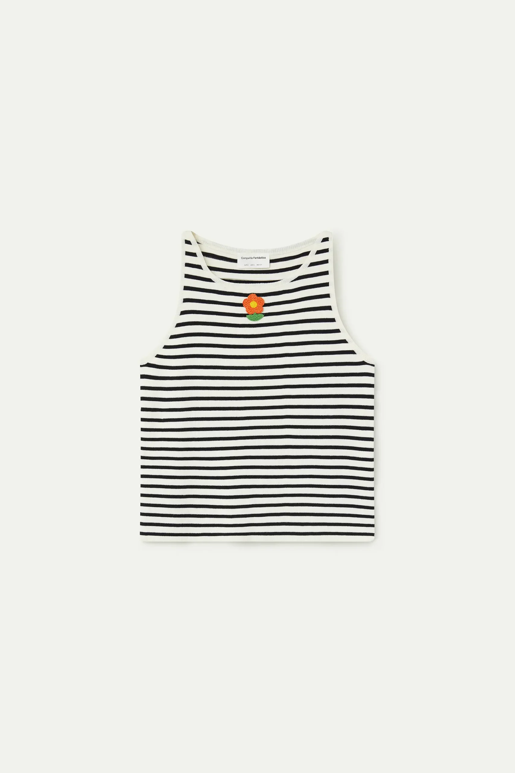 Top con tejido punto de raya estampada de color blanco y negro. Cuello redondo y sin mangas. Detalle de flor bordada. Acabados en rib. La modelo mide 177 cm y lleva la talla S.