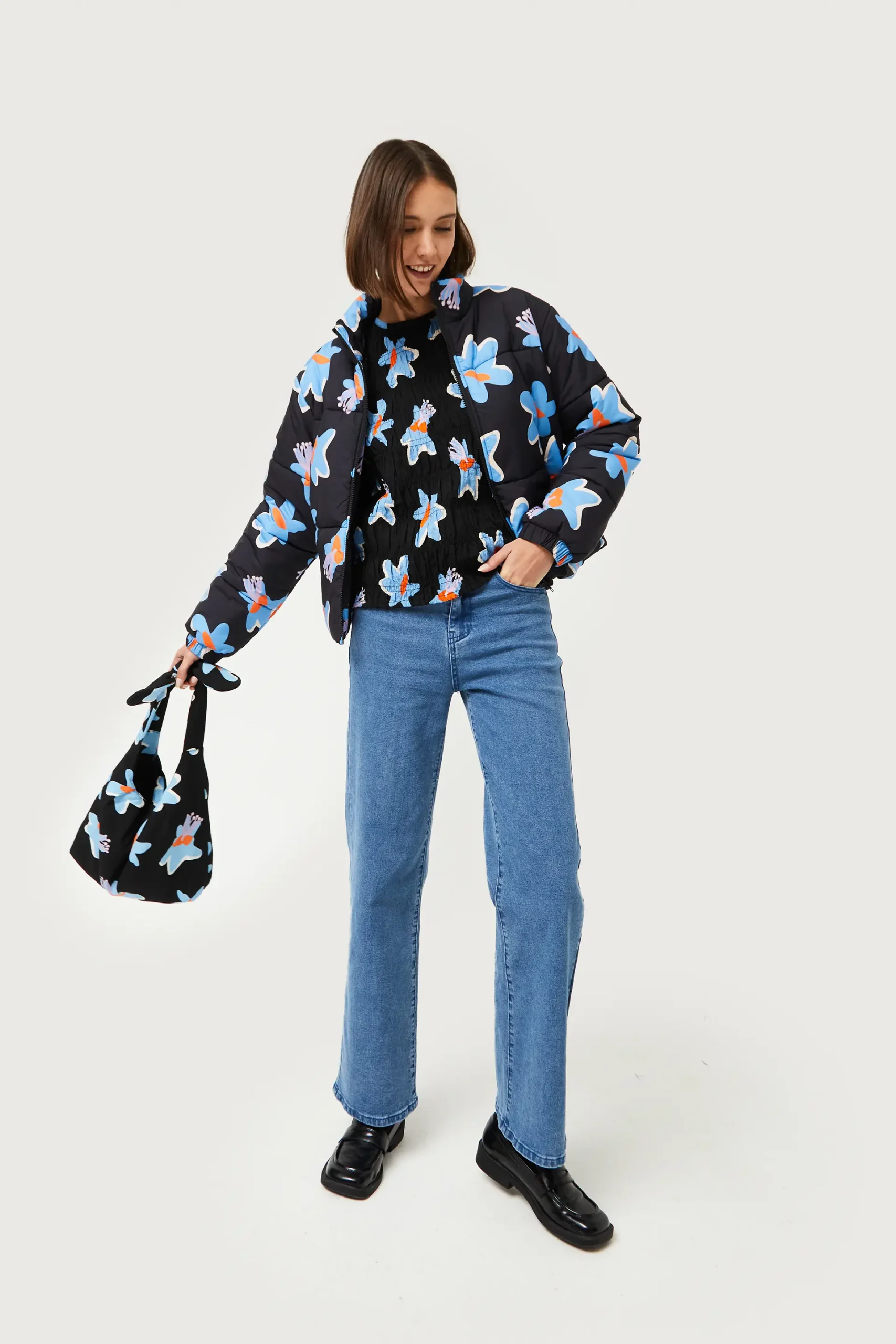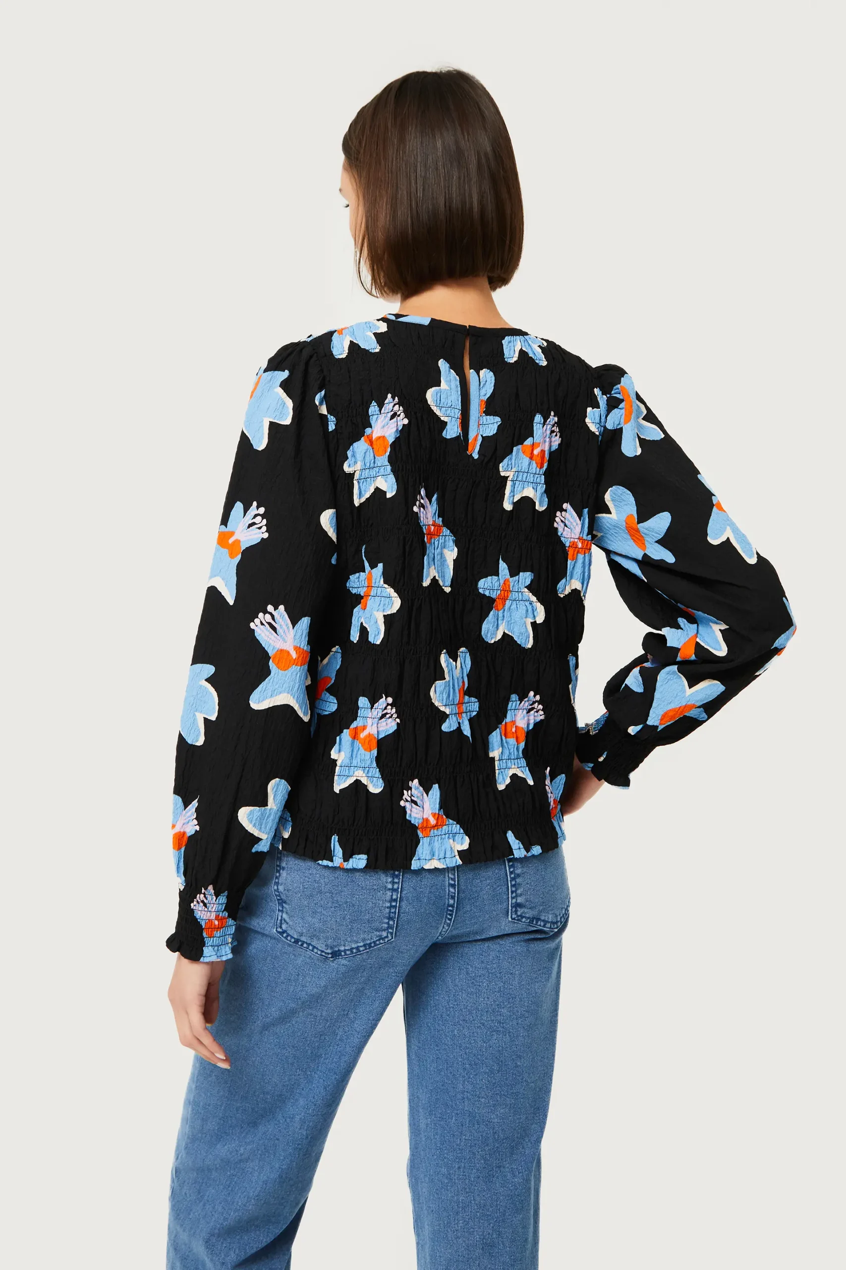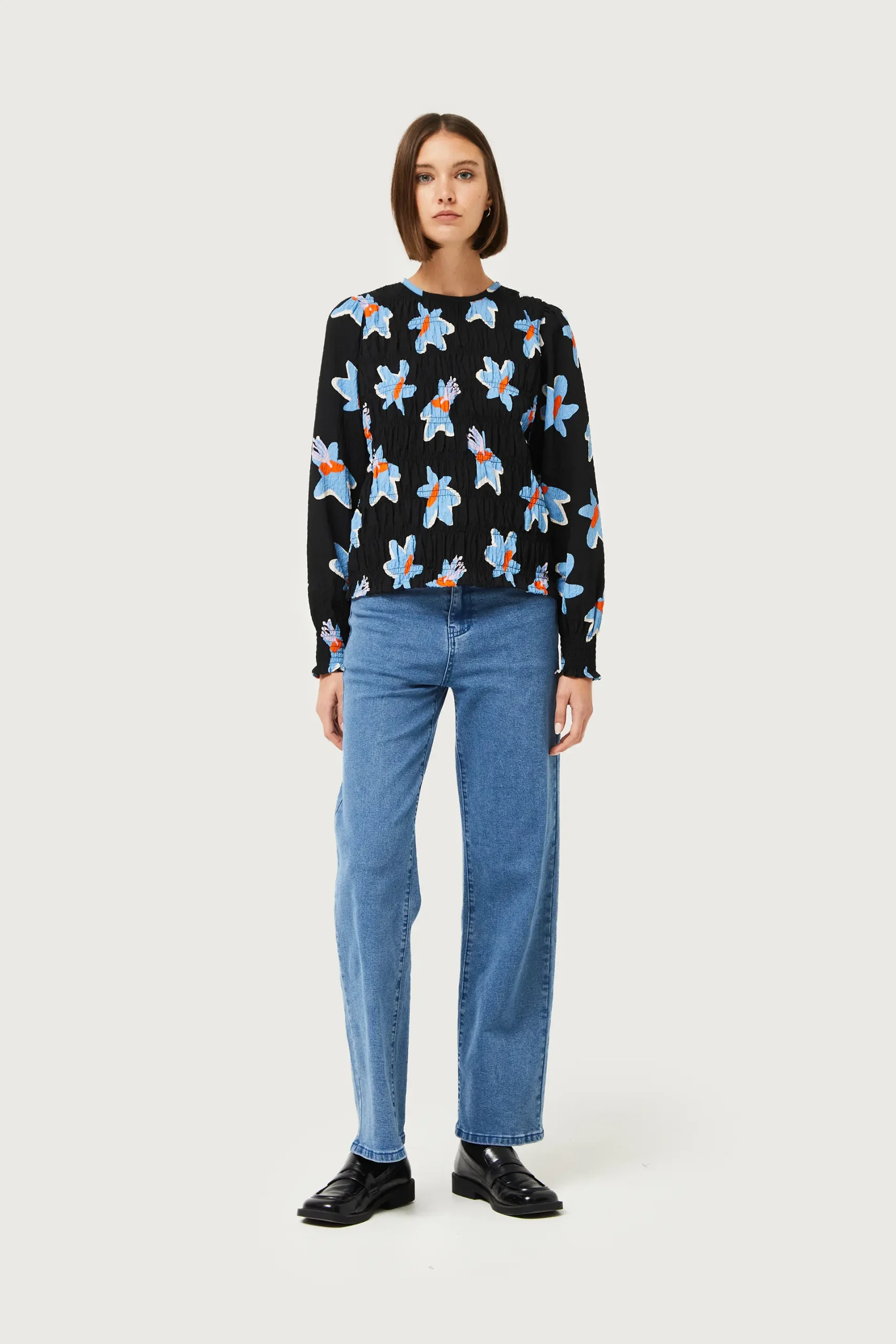 Top en crepé de color negro con estampado de flores azules y amarillas. Con cuello redondo y manga larga acabada en elástico. Cierre con botón en la parte posterior. Modelo de acabado texturizado con cuerpo en nido de abeja. La modelo mide 176 cm y lleva la talla S.