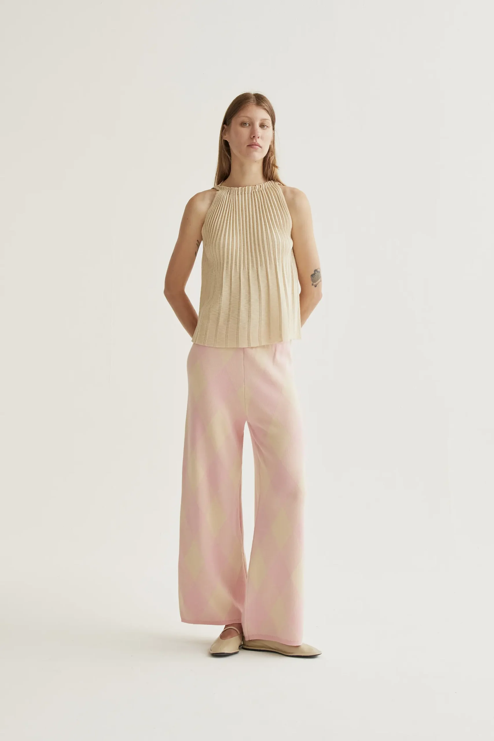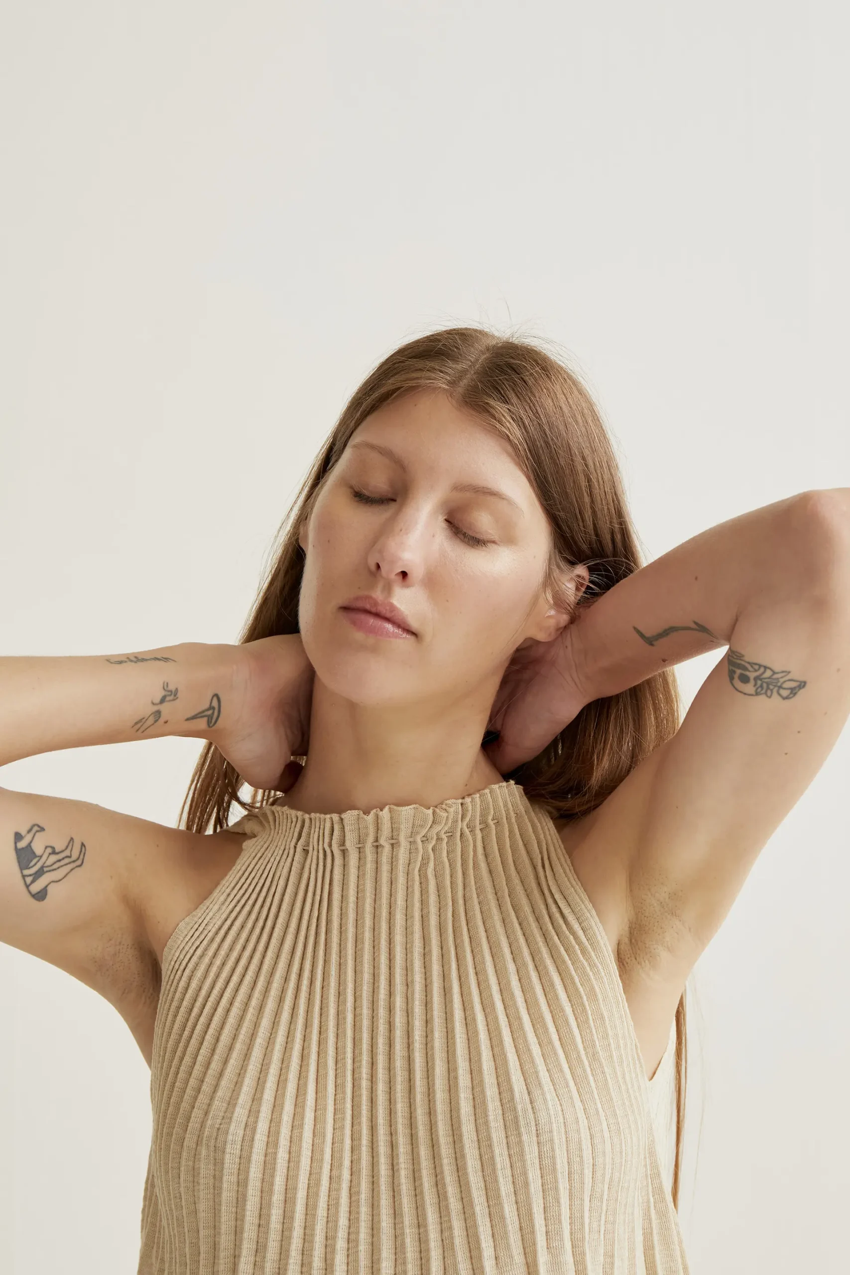 Top con tejido de punto plisado de color beige. Cuello halter y sin mangas. La modelo mide 177 cm y lleva la talla S.