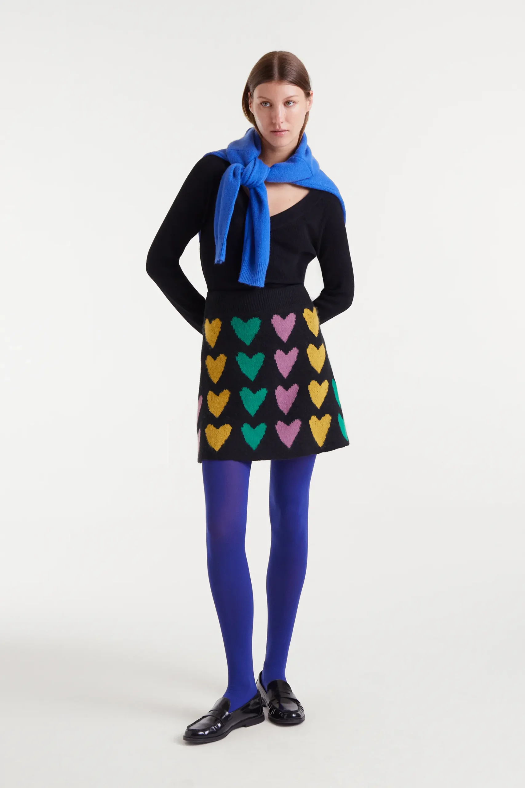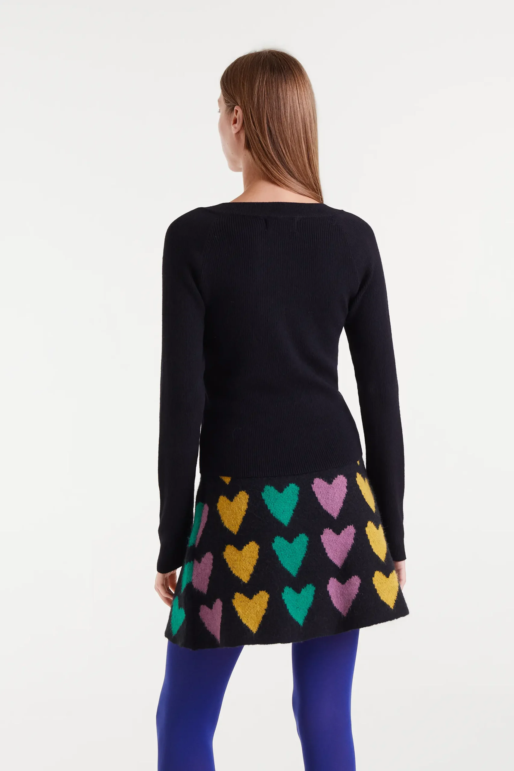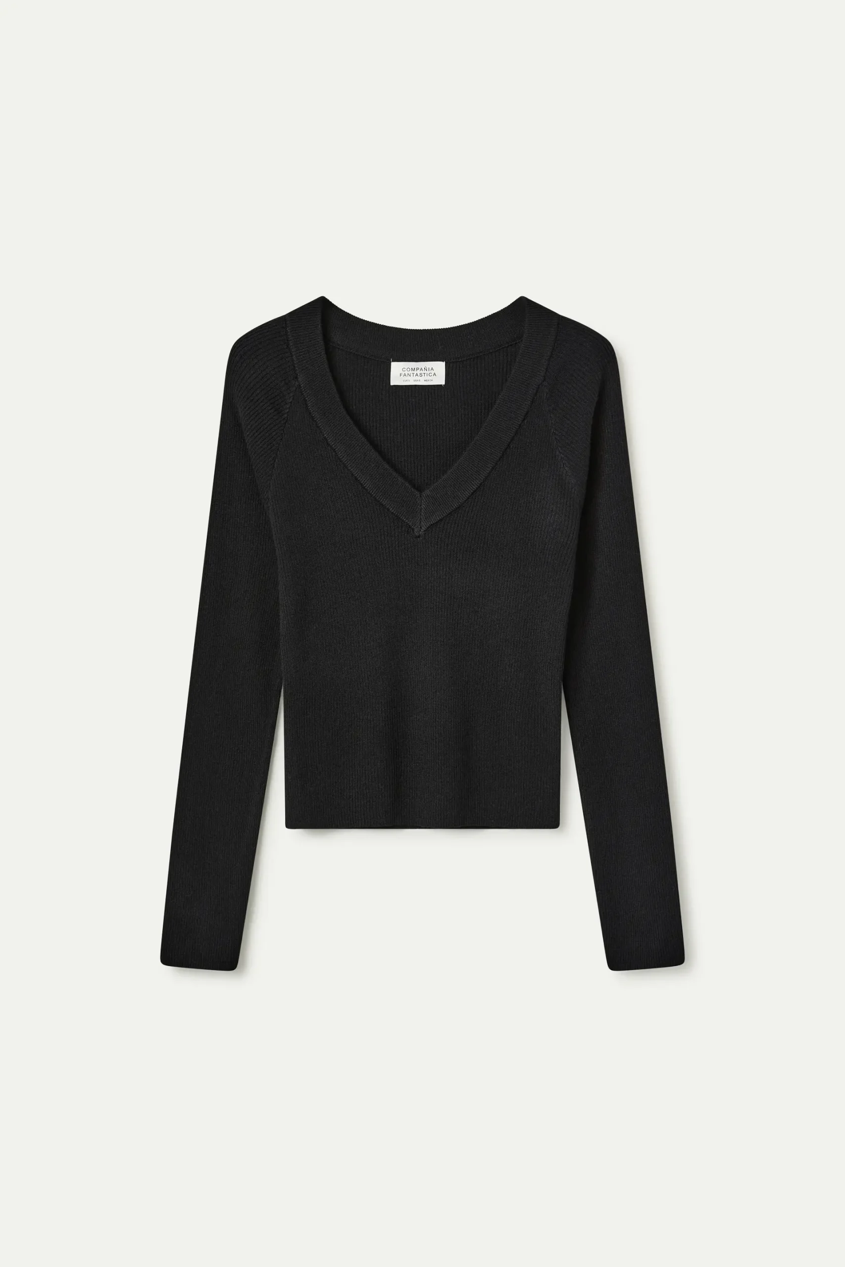 Top de punto canalé de color negro. Cuello con escote pico y manga larga. La modelo mide 177 cm y lleva la talla S.