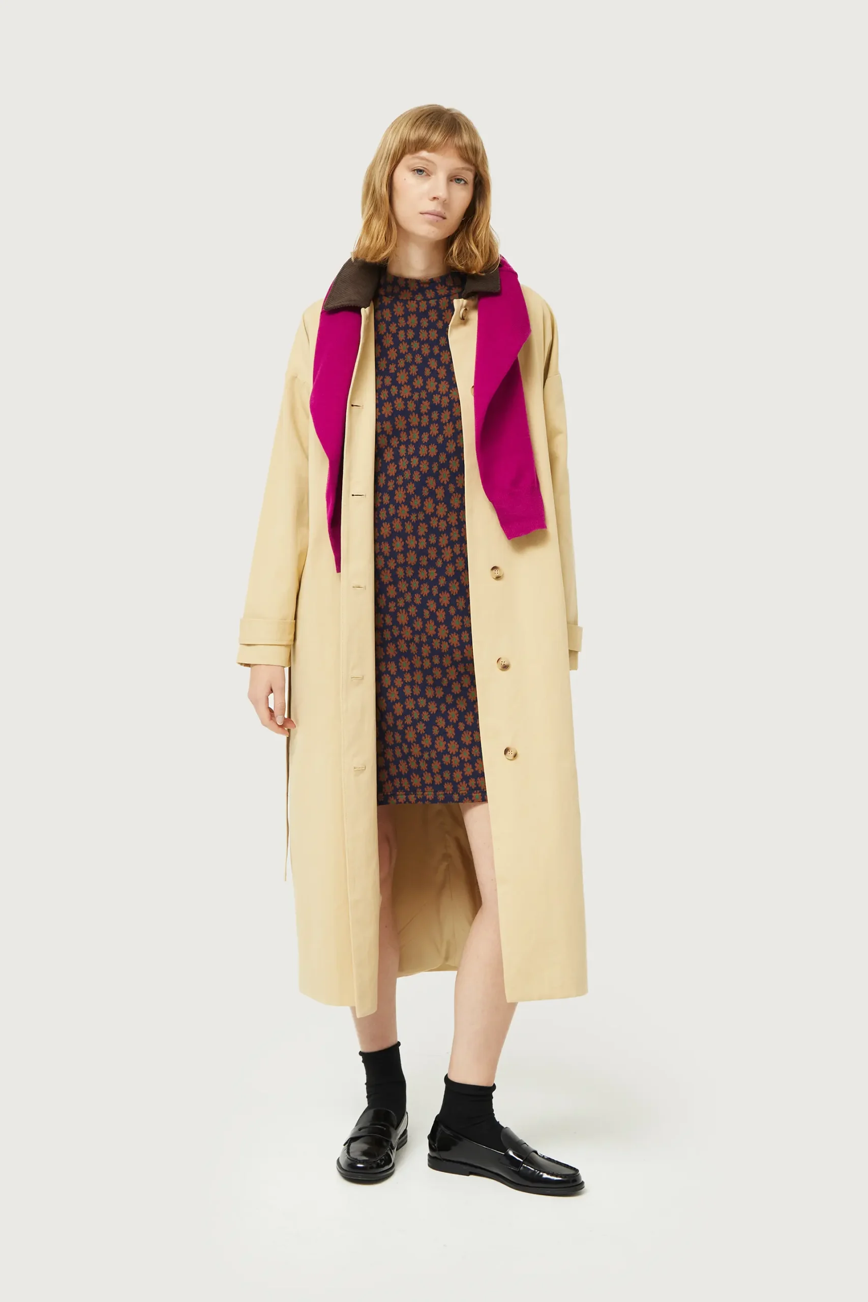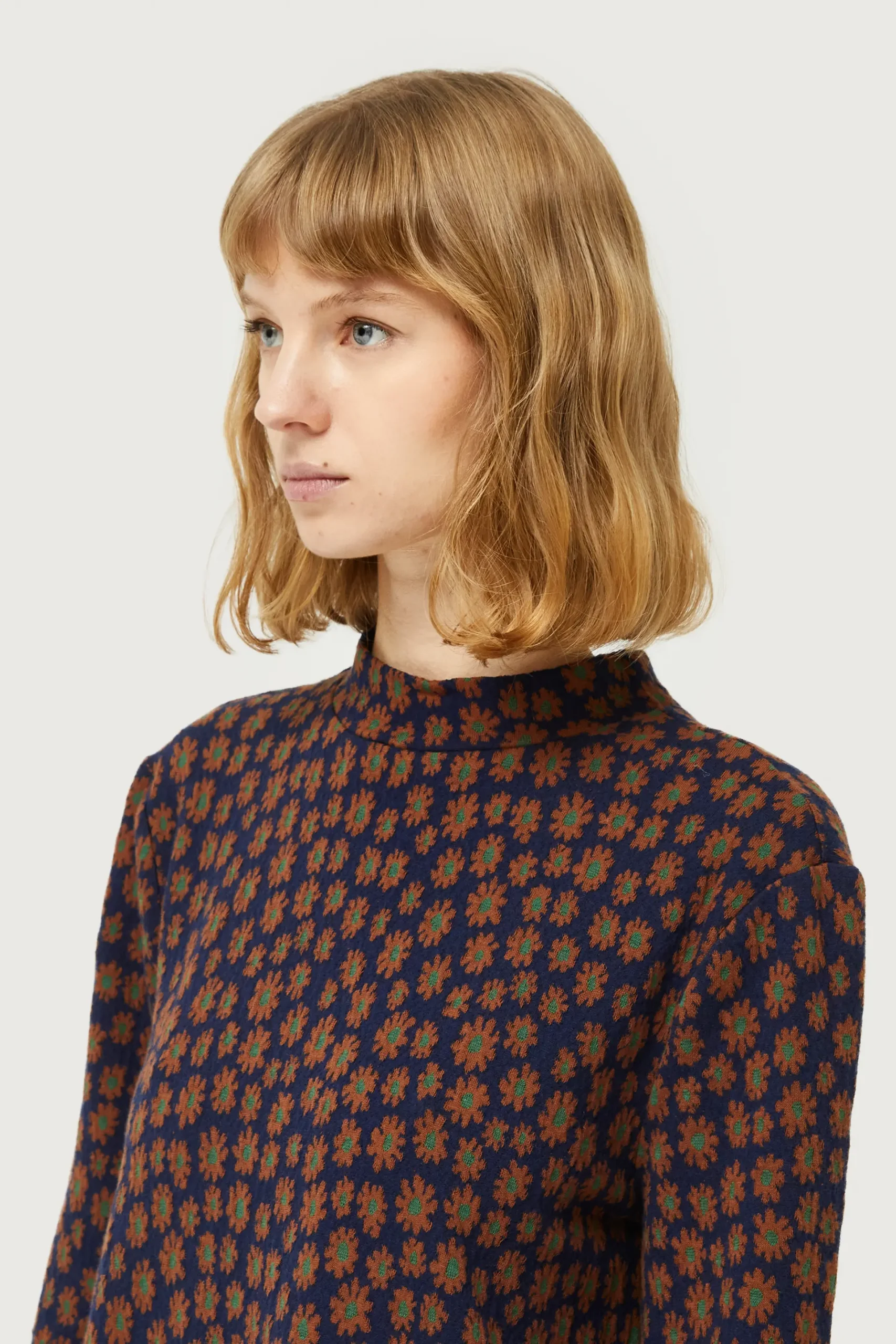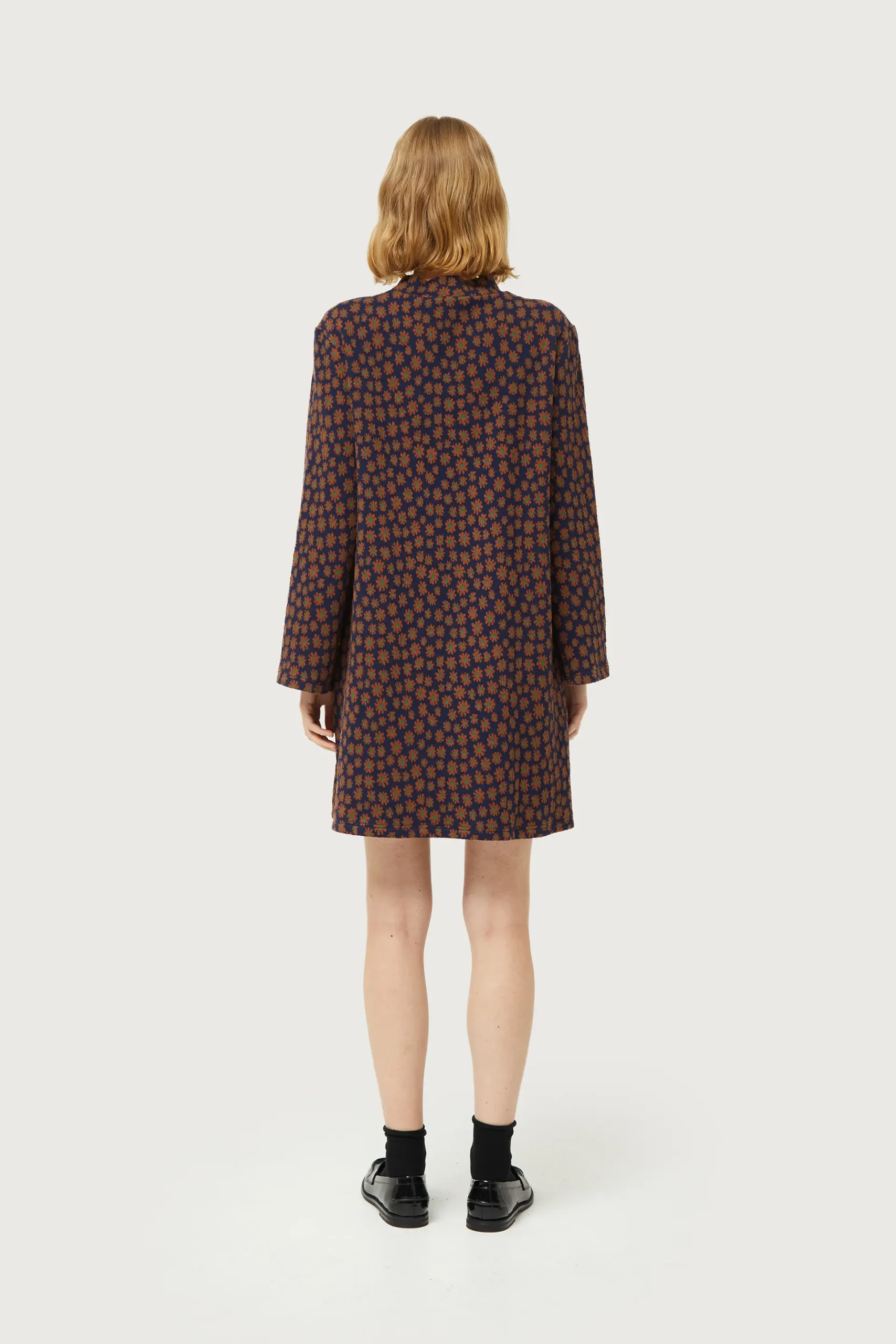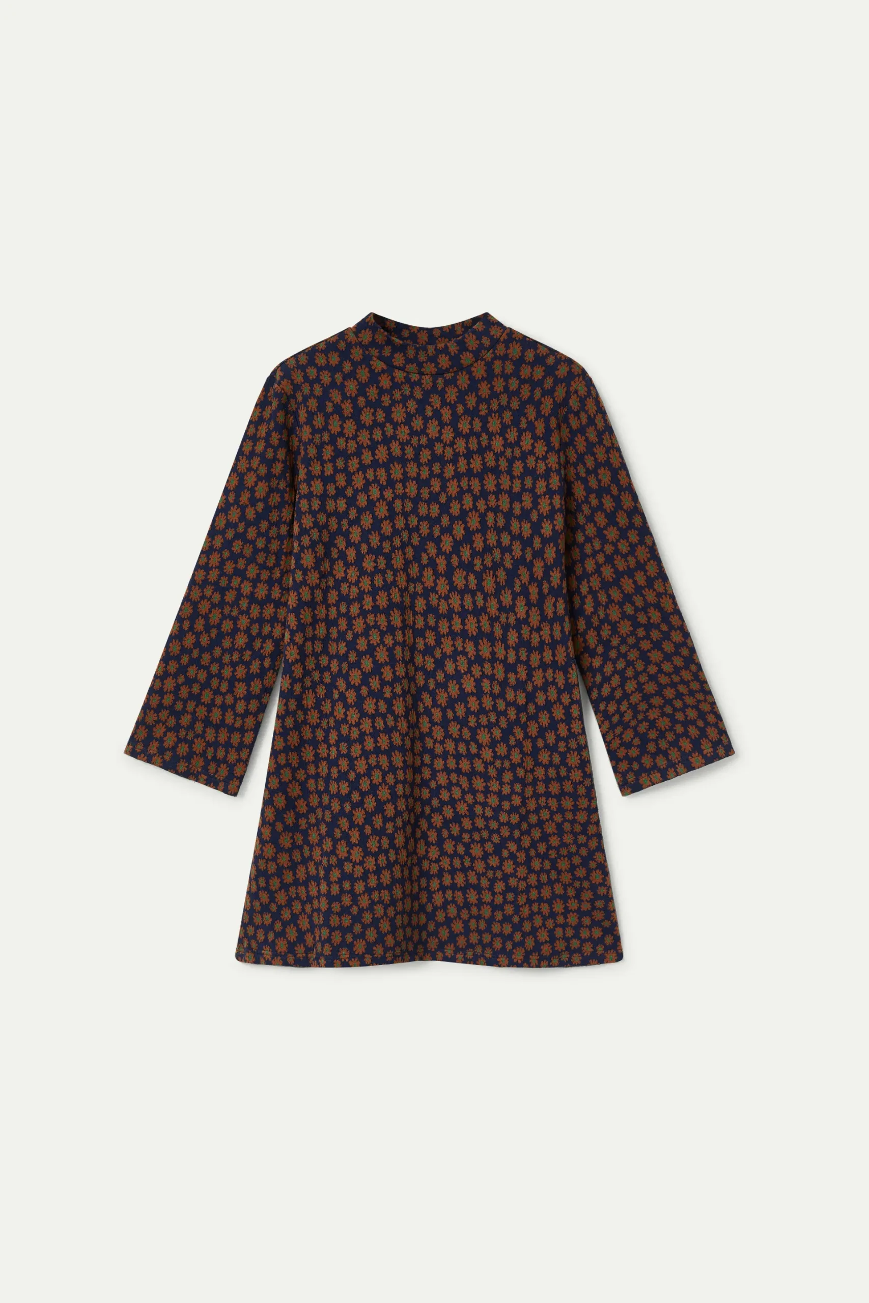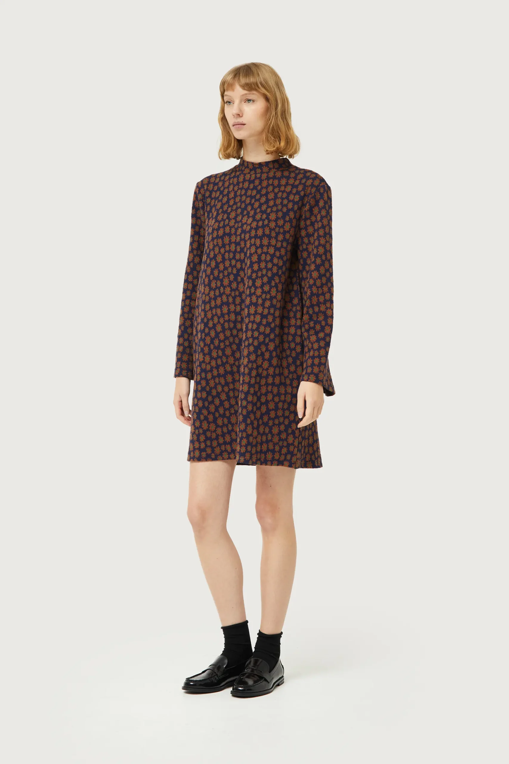 Vestido corto de punto jacquard de color azul marino con estampado de flores marrones. Con cuello mock y manga larga. La modelo mide 177 cm y lleva la talla S.