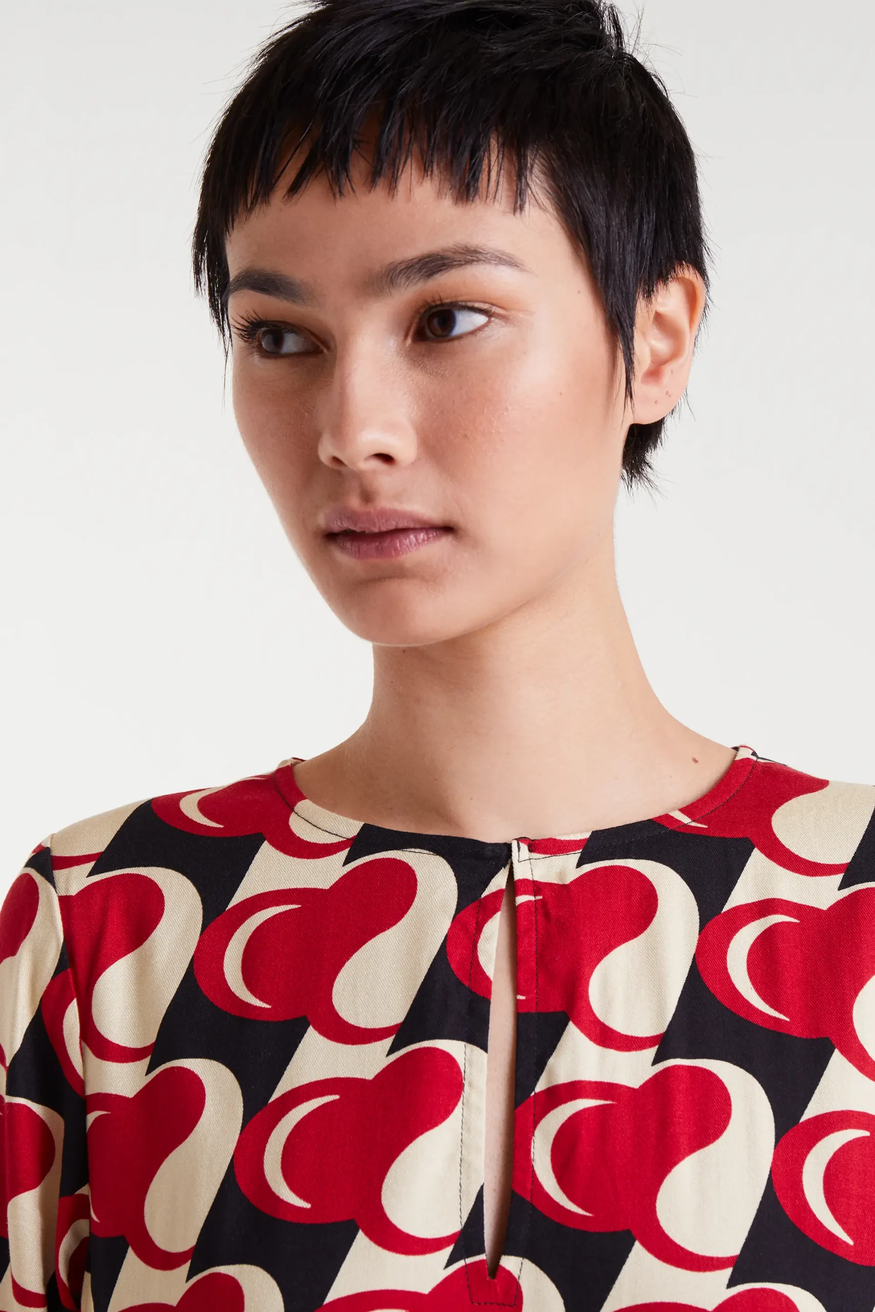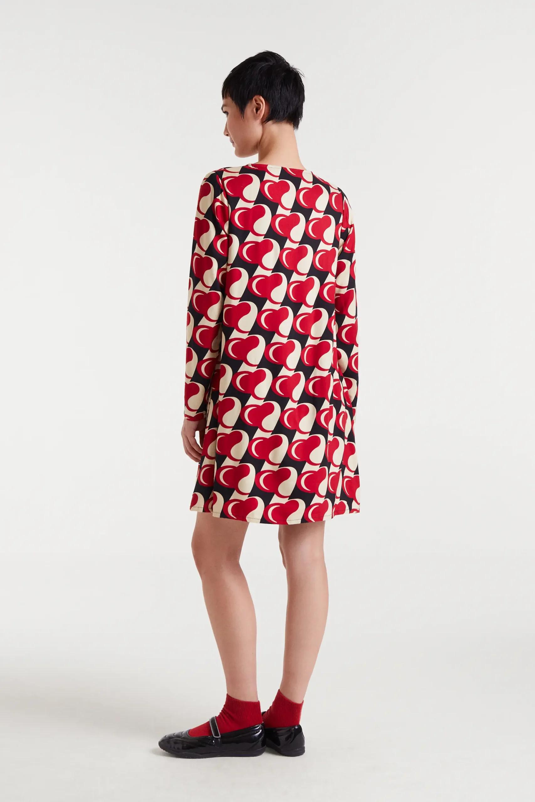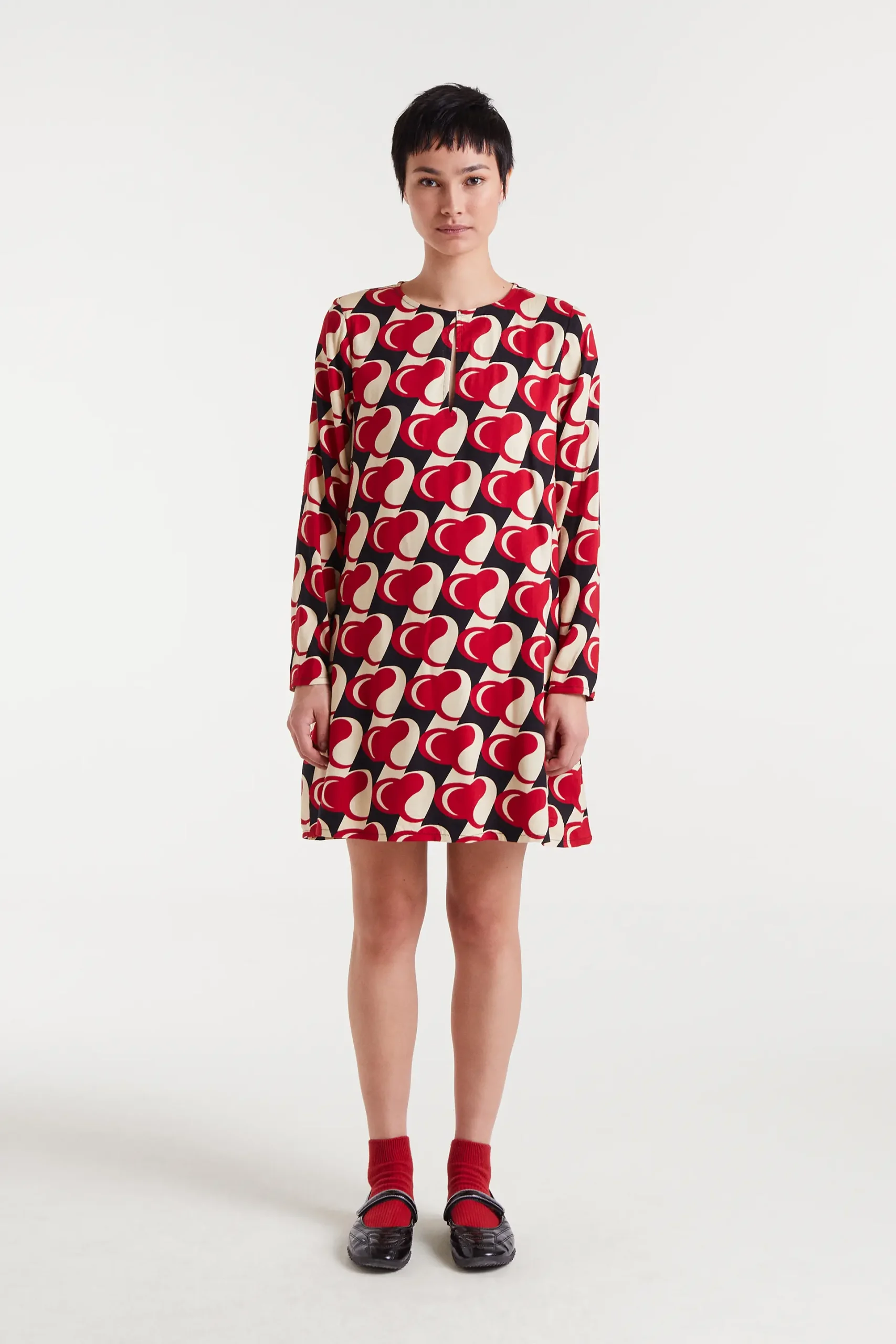 Vestido corto de tejido viscosa twill con estampado Heart Attack. Cuello redondo con escote pico cerrado con botón y manga larga.Bolsillos laterales. La modelo mide 177 cm y lleva la talla S.