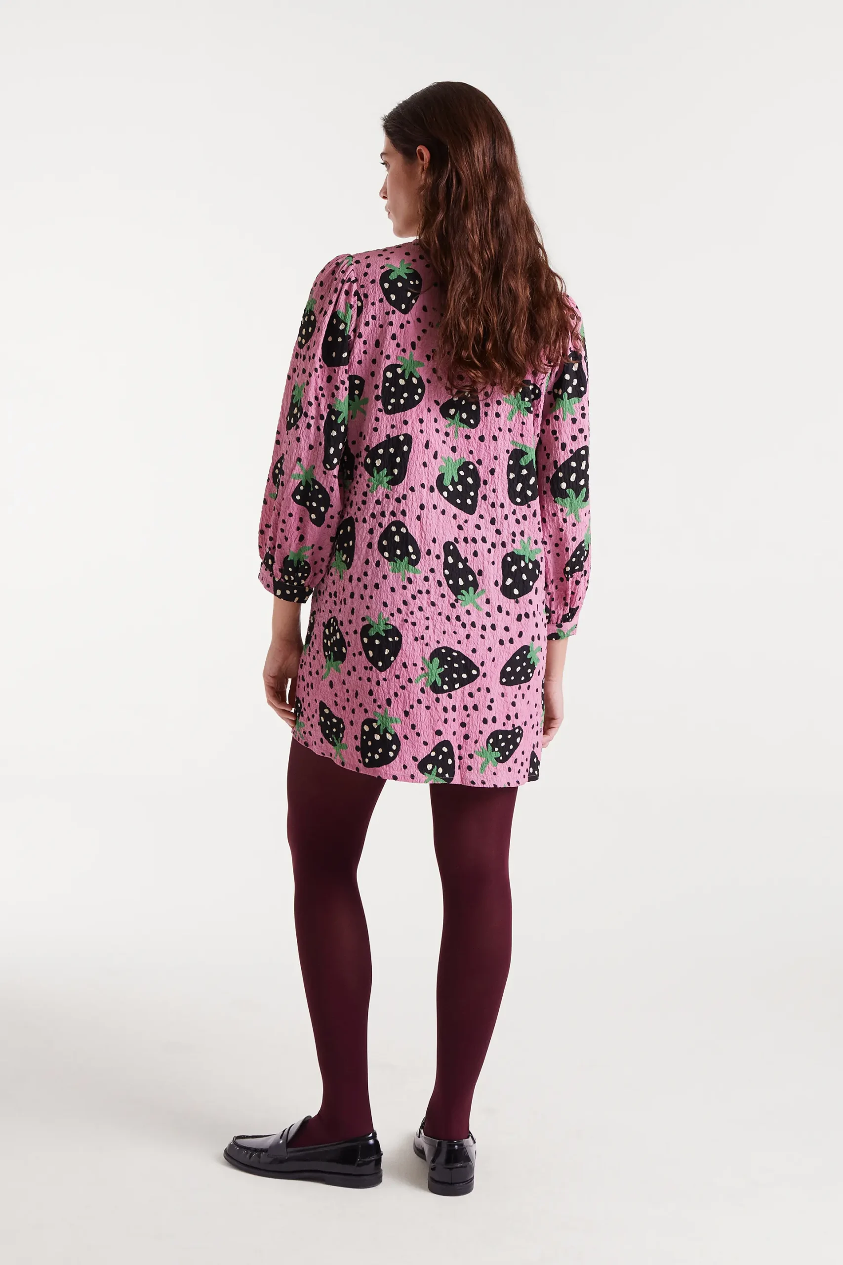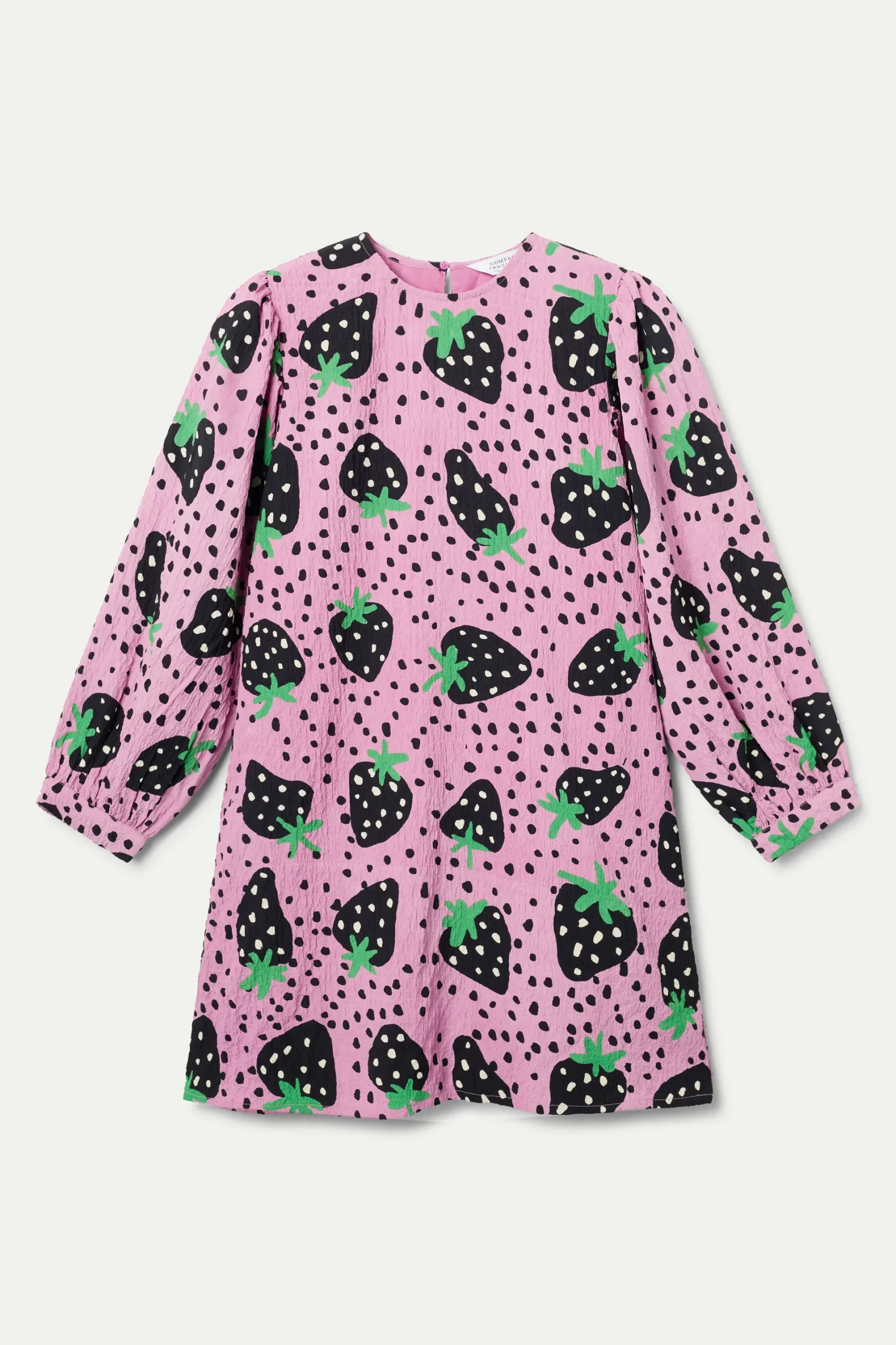 Vestido corto de tejido ligero y arrugado con estampado Morango Big. Cuello redondo y manga larga abullonada. Forro interior. Bolsillos laterales. La modelo mide 177 cm y lleva la talla S.