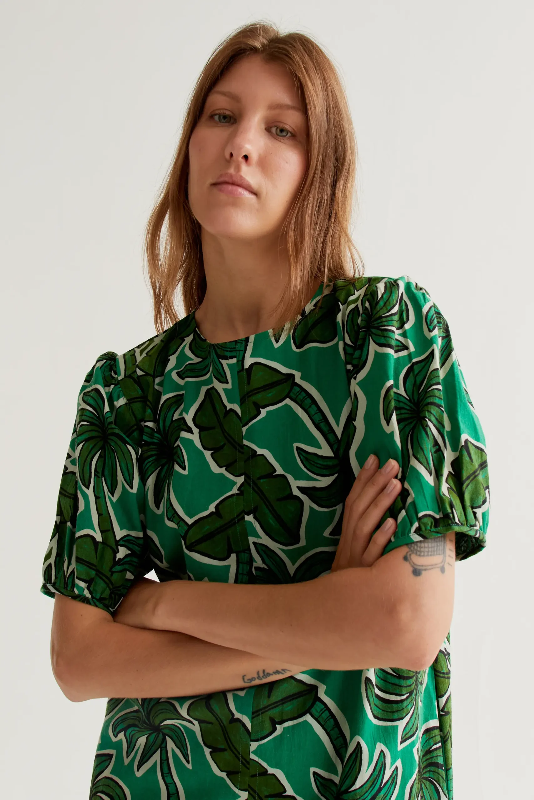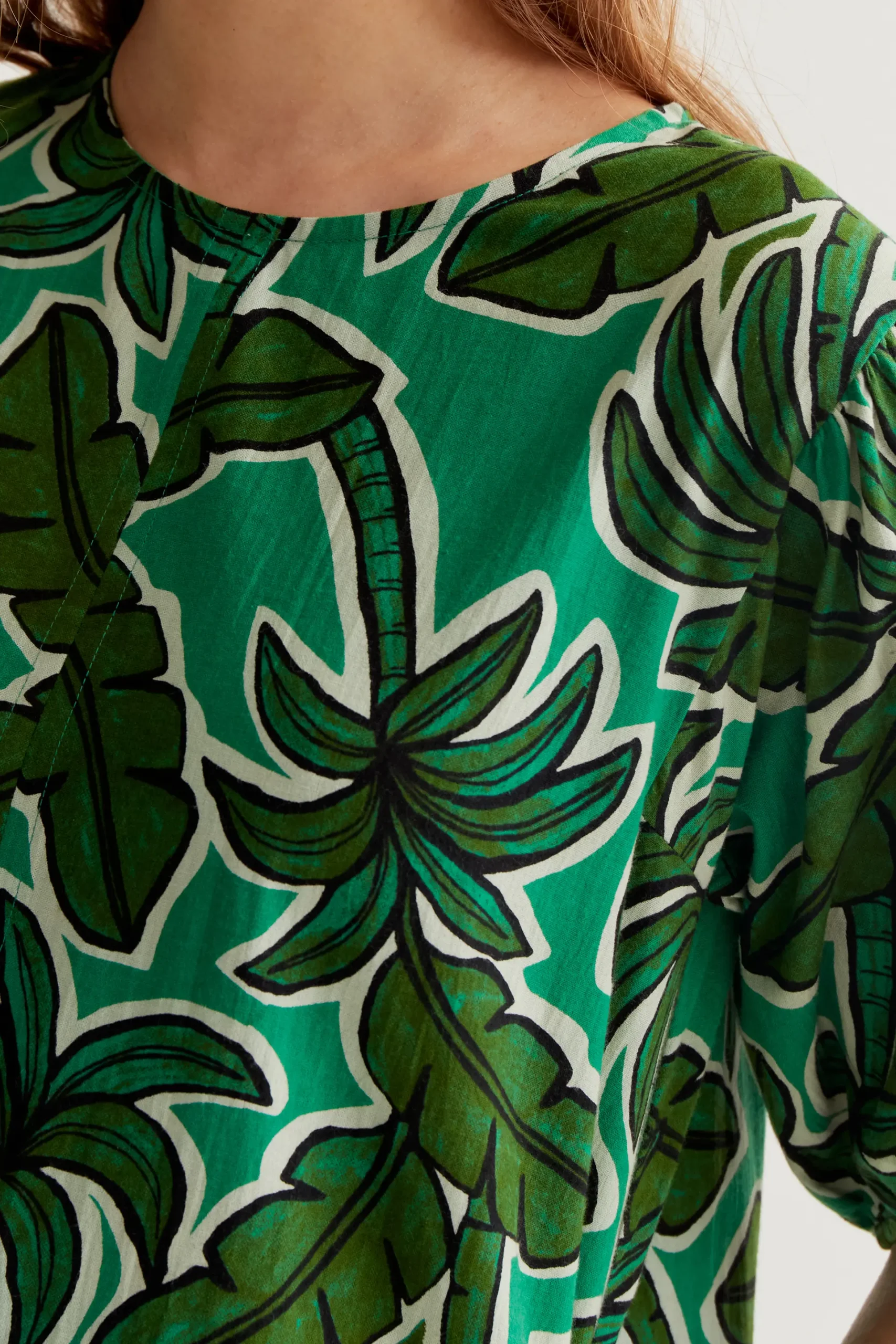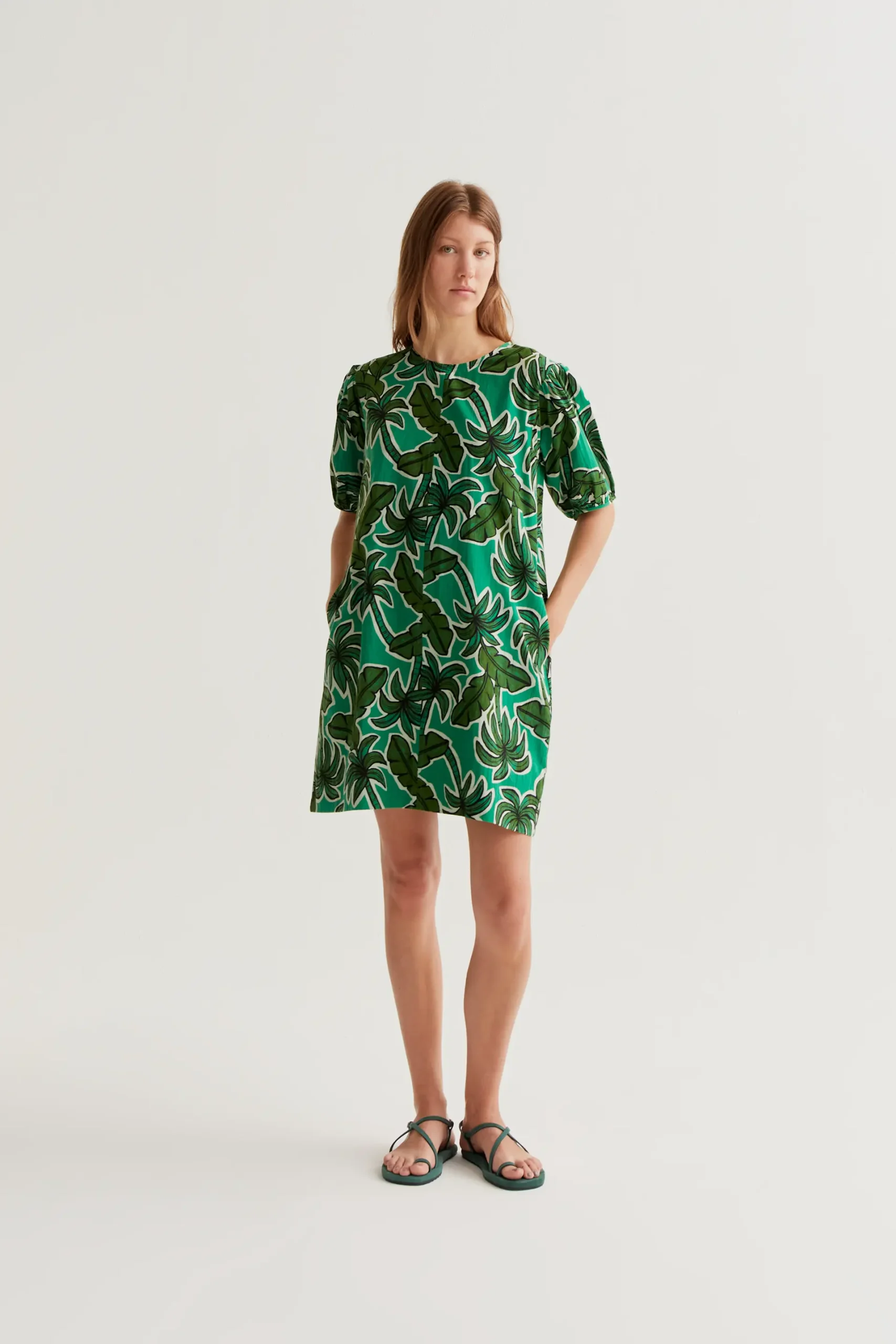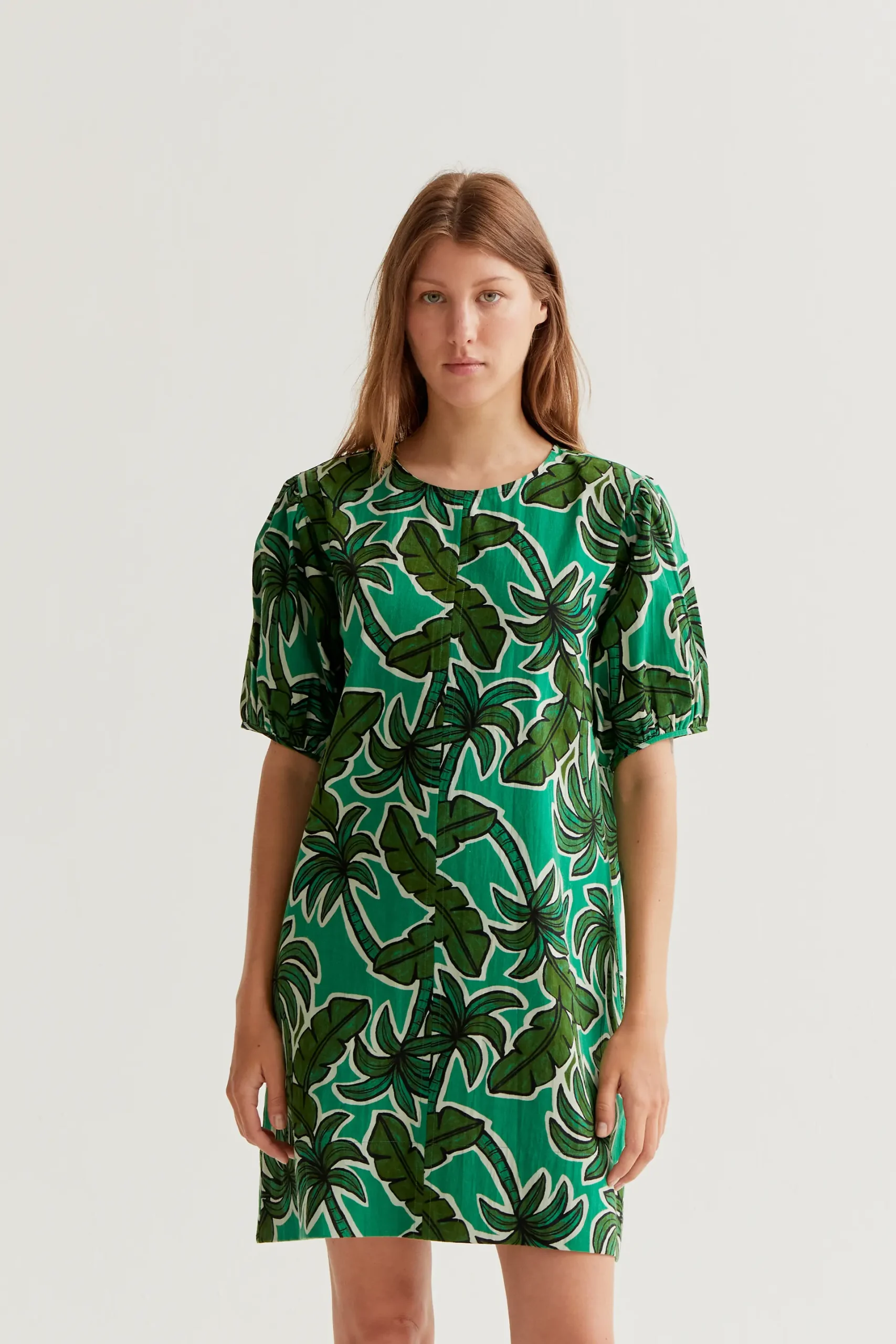 Vestido corto de tejido 100% algodón con estampado palm tree. Cuello redondo y manga corta ligeramente abullonada. La modelo mide 177 cm y lleva la talla S.