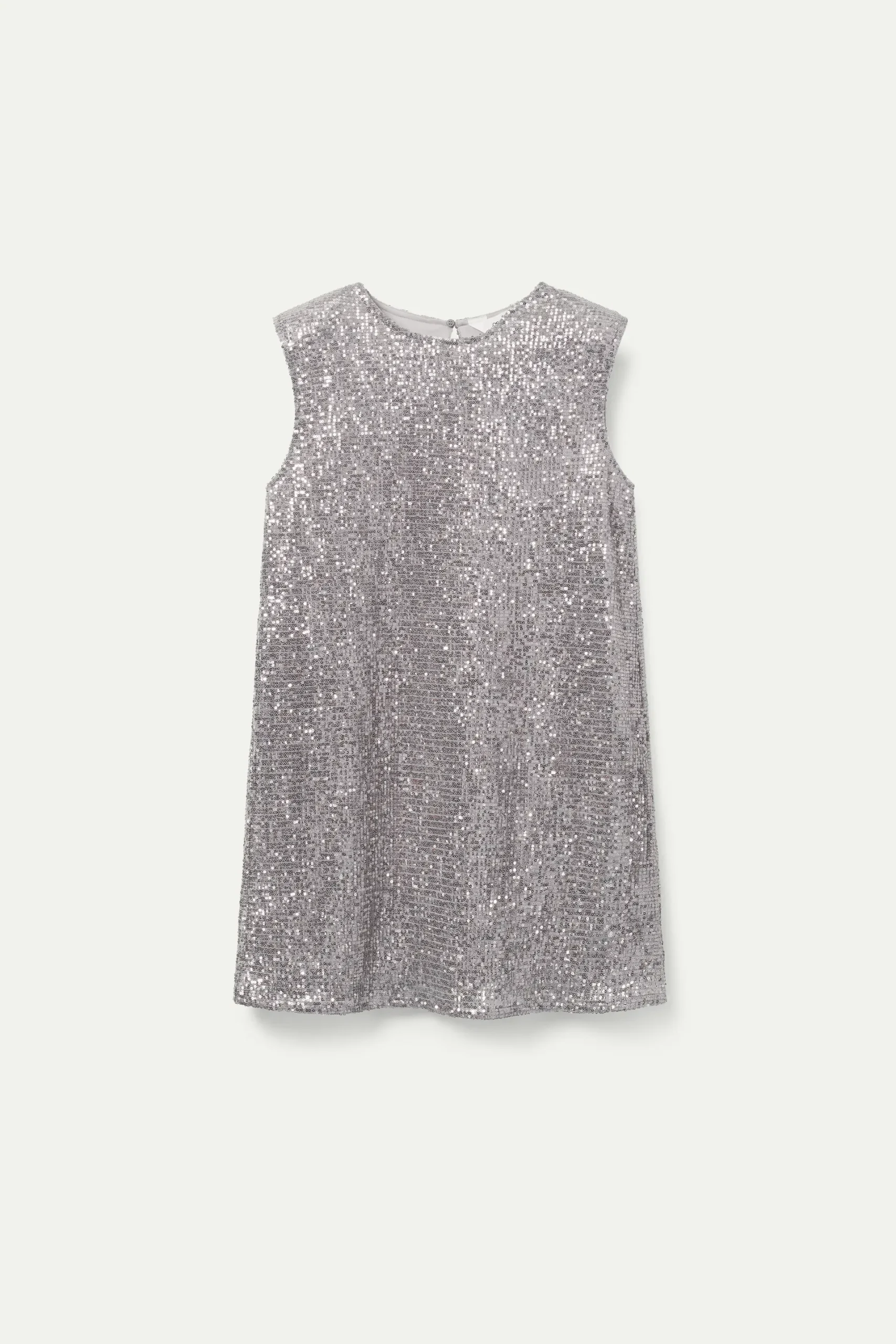 Vestido corto con tejido de lentejuelas de color silver. Cuello redondo y sin mangas. Corte fluido. Forro interior.