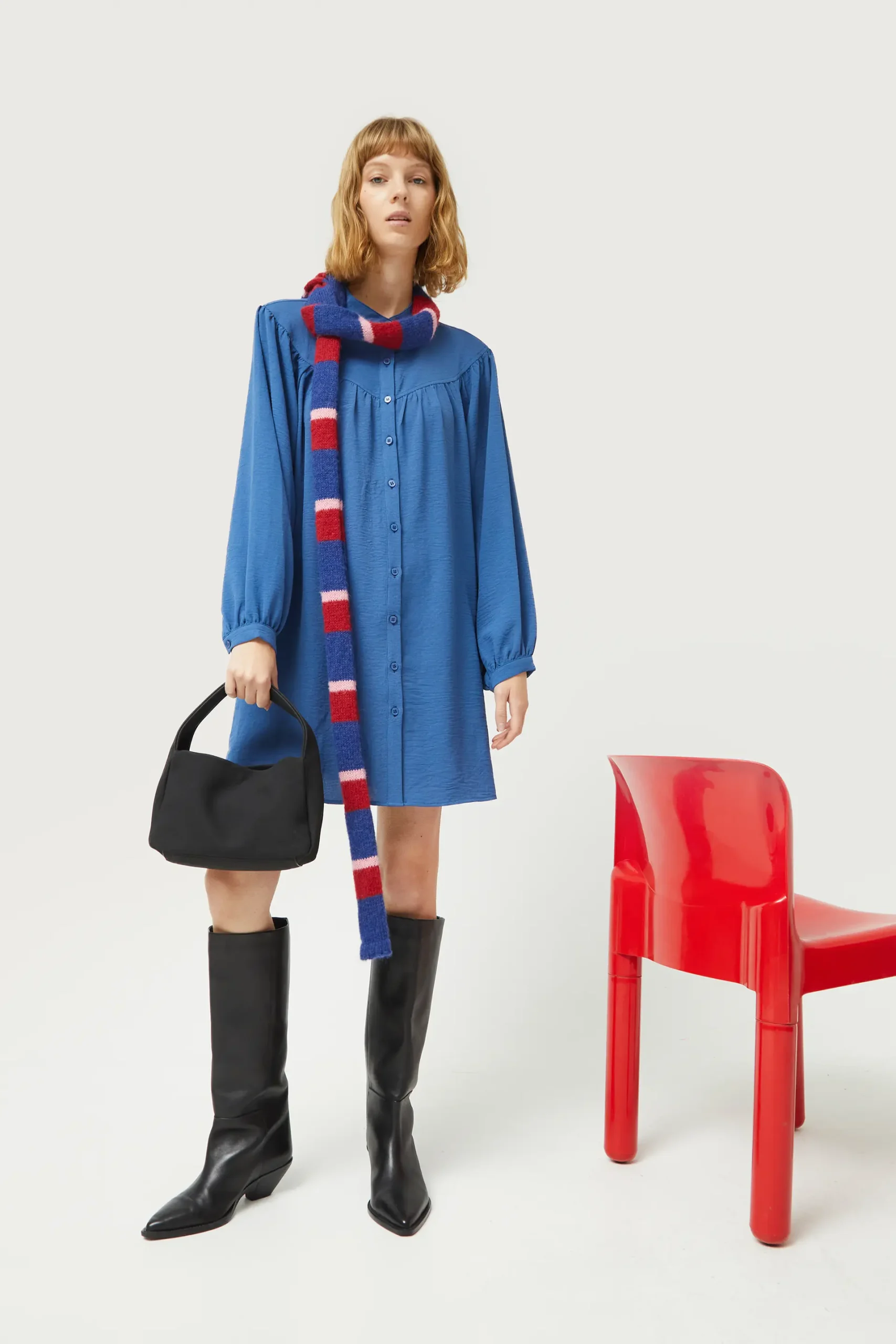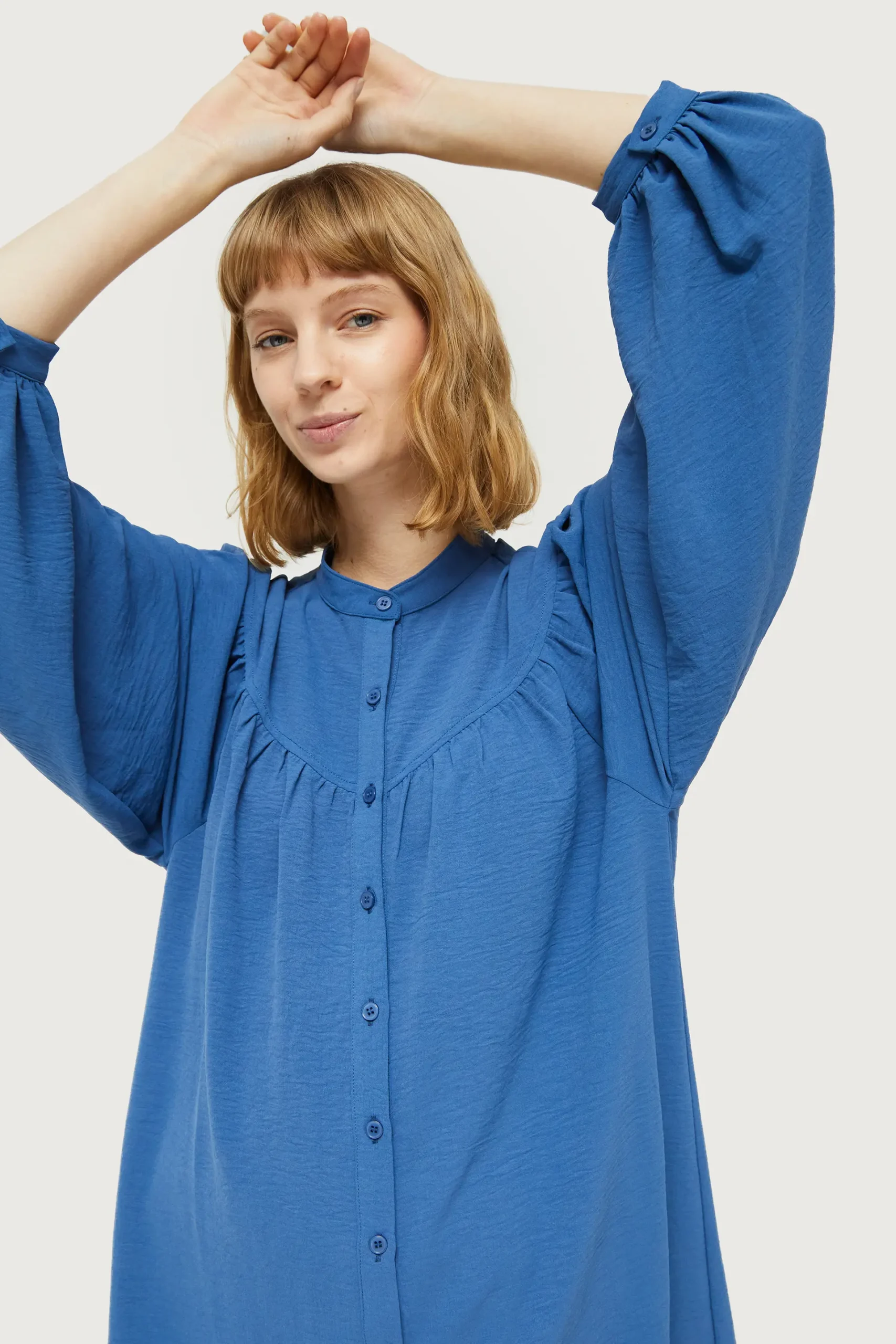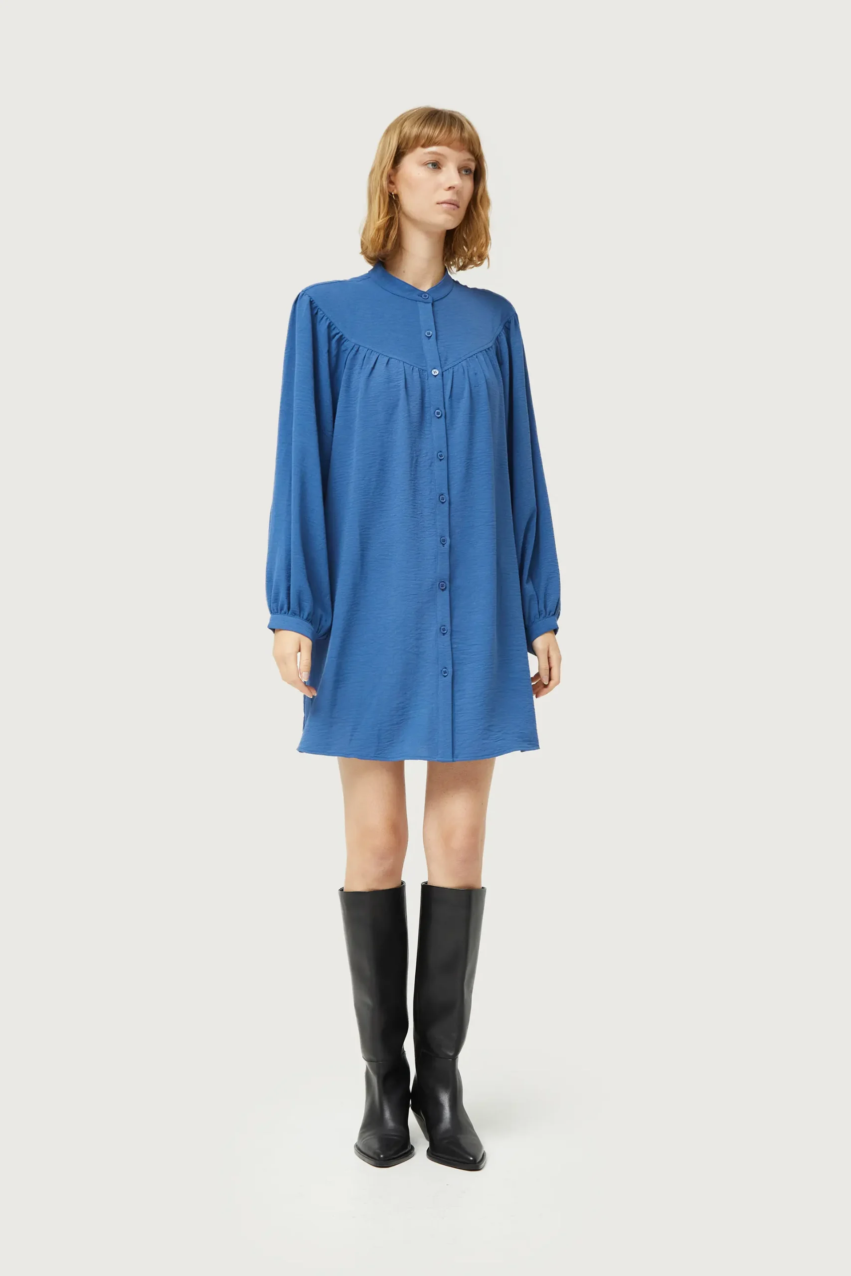 Vestido corto en crepé de color azul. Con cuello mao y manga larga terminada en puño. Cierre frontal con botones. Detalle de corte en el pecho. La modelo mide 177 cm y lleva la talla S.
