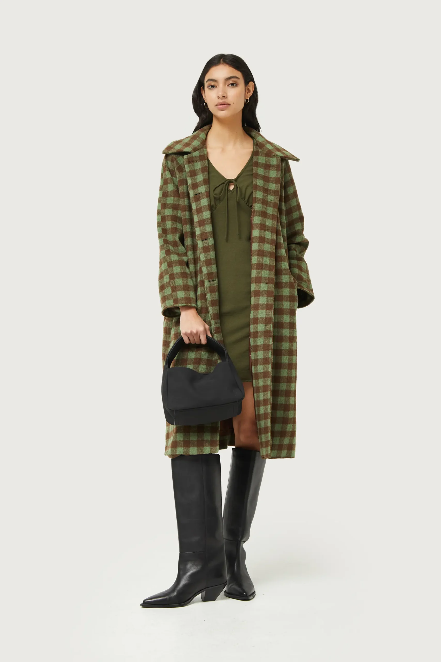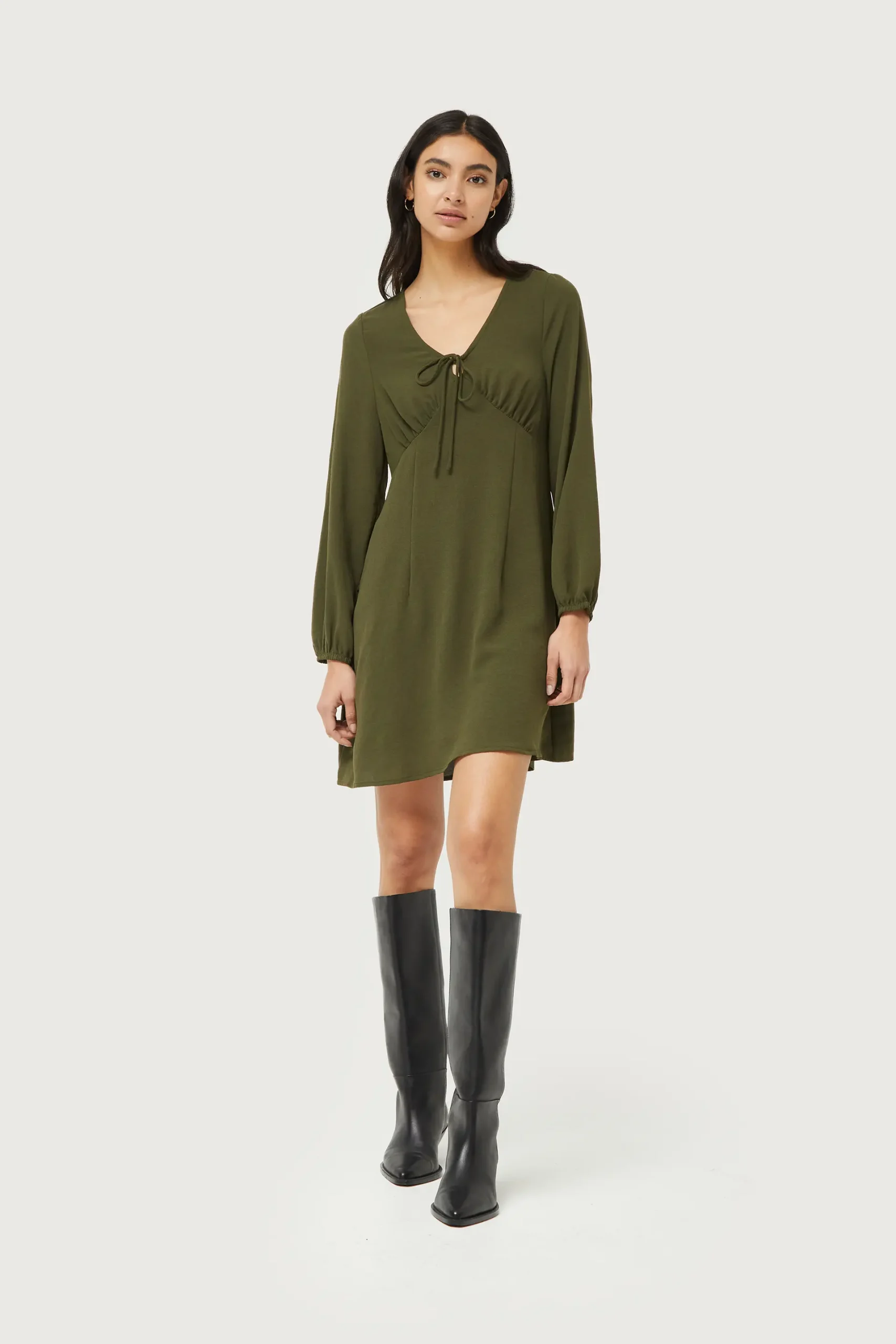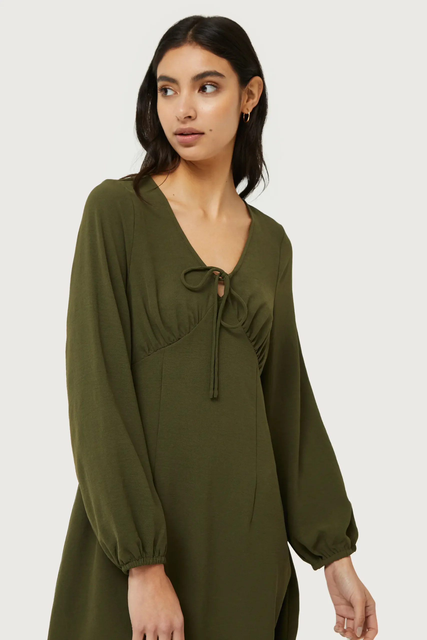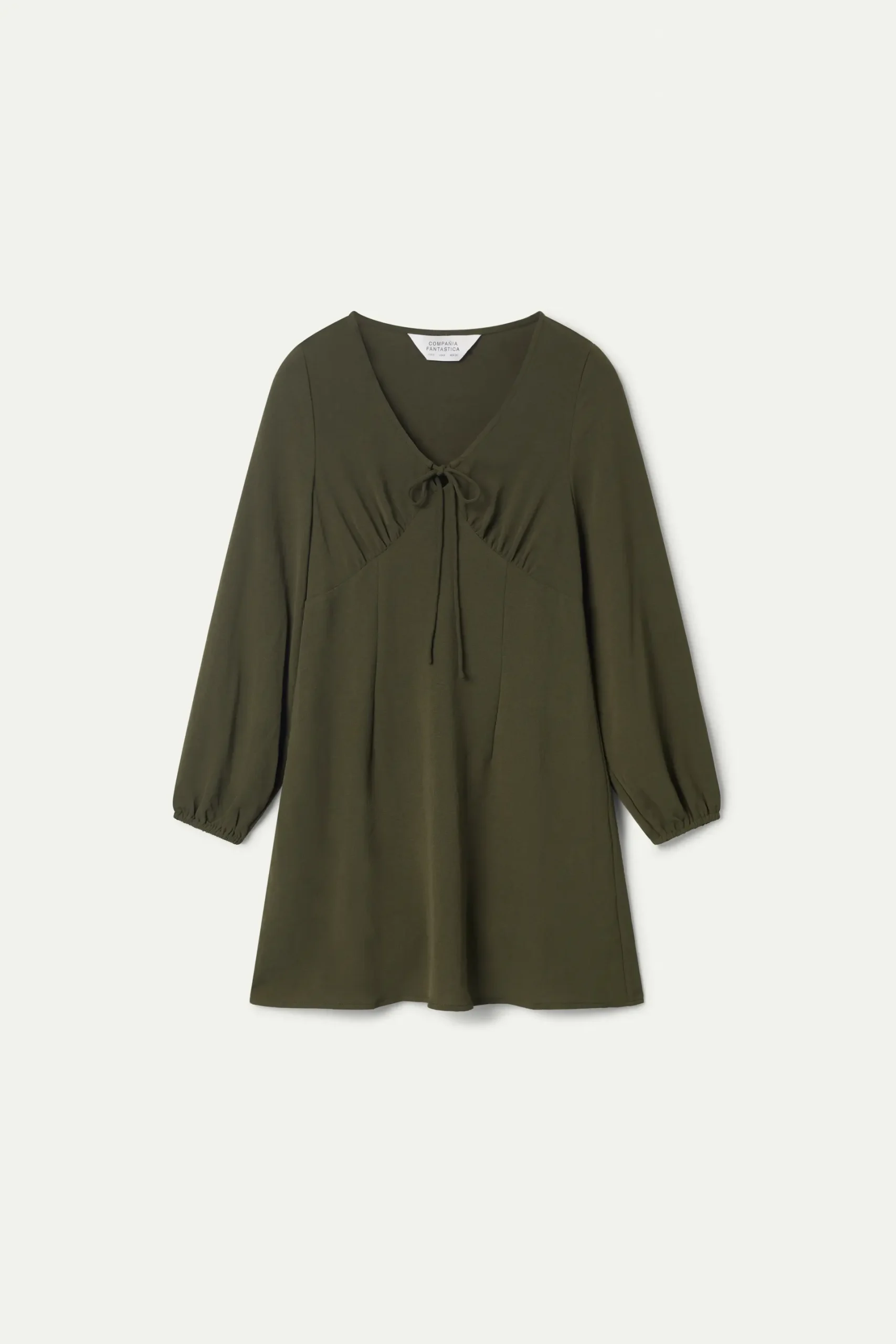 Vestido corto de crepé de color verde caqui. Con cuello pico y manga larga. Modelo con corte debajo del pecho. Detalle de cordones en la parte frontal. La modelo mide 176 cm y lleva la talla S.