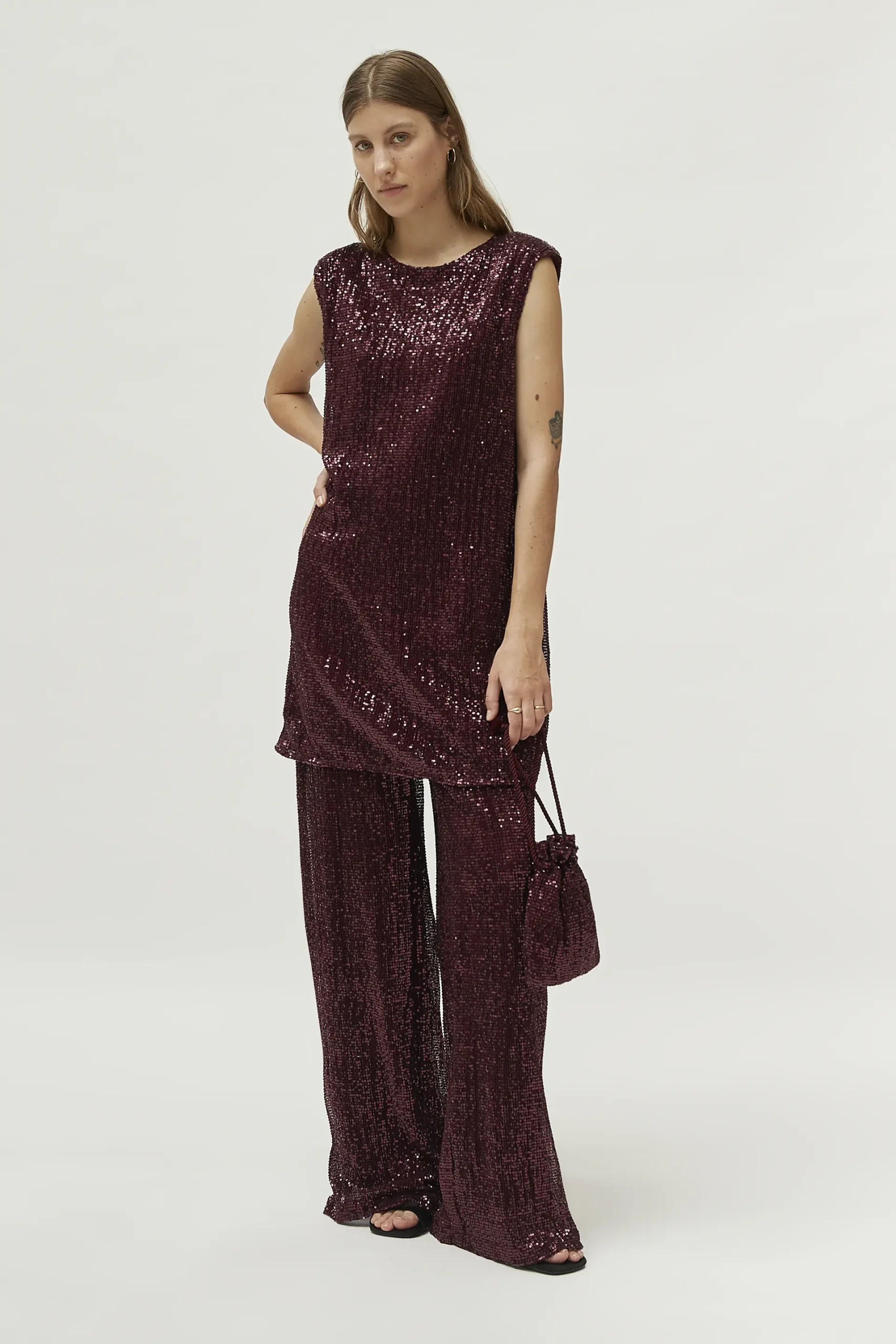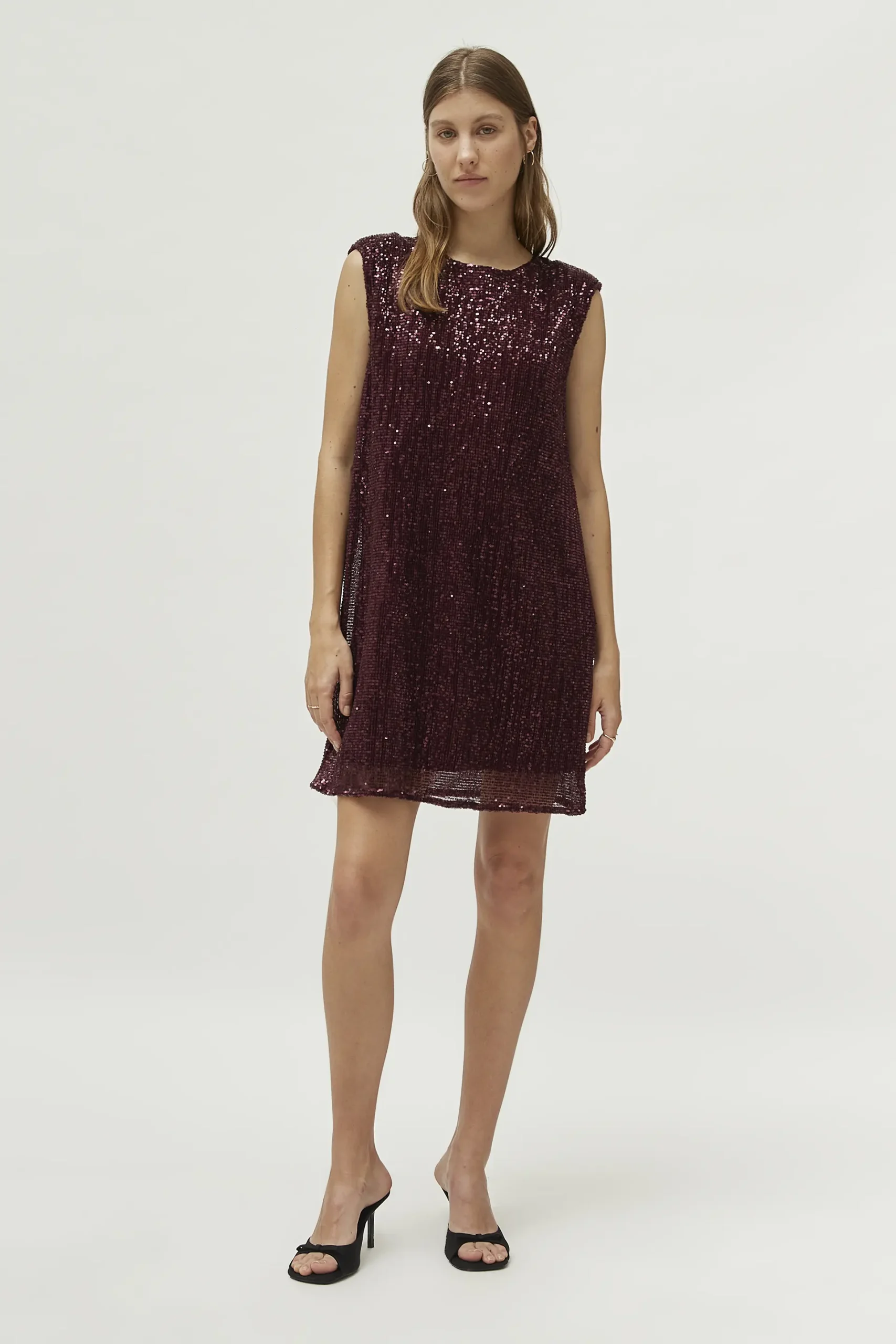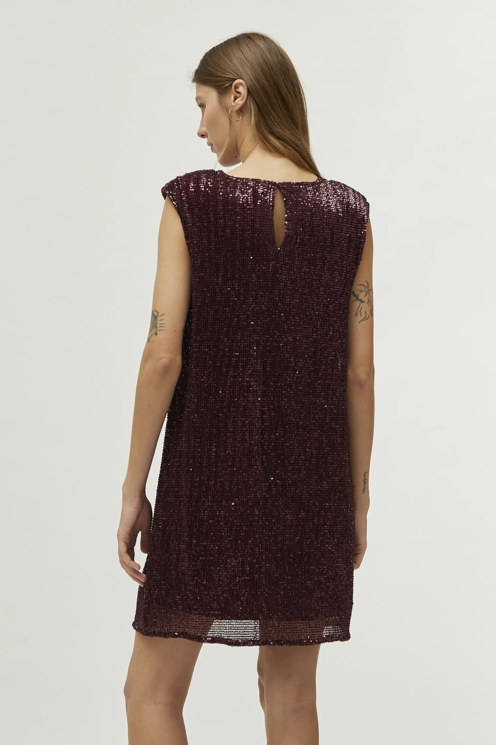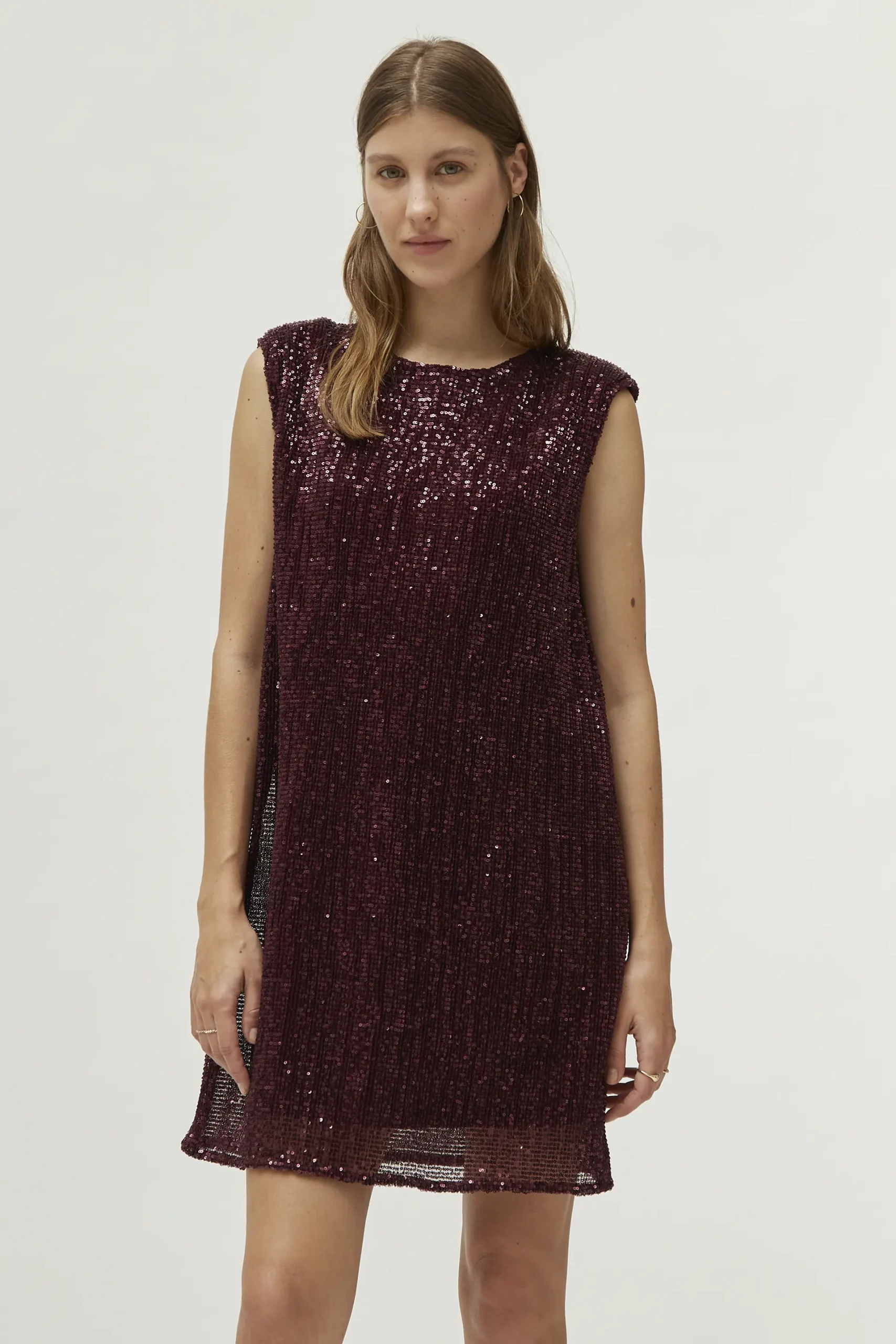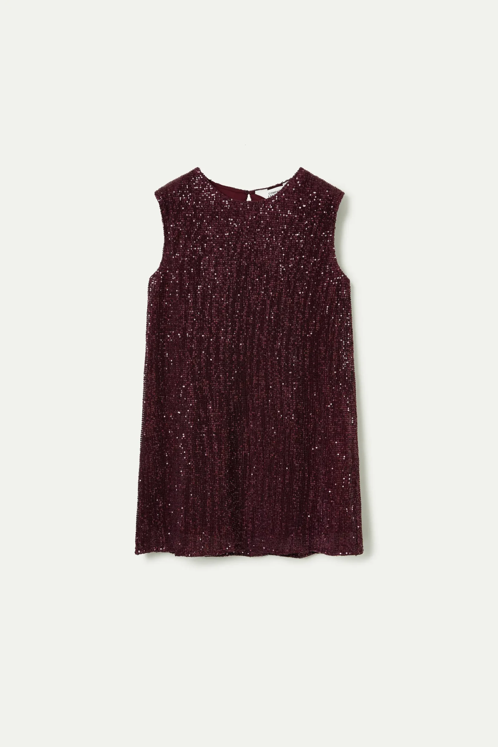 Vestido corto de lentejuelas de color burdeos. Con cuello redondo y sin mangas. Cierre con botón en la parte posterior. Forro interior. La modelo mide 177 cm y lleva la talla S.