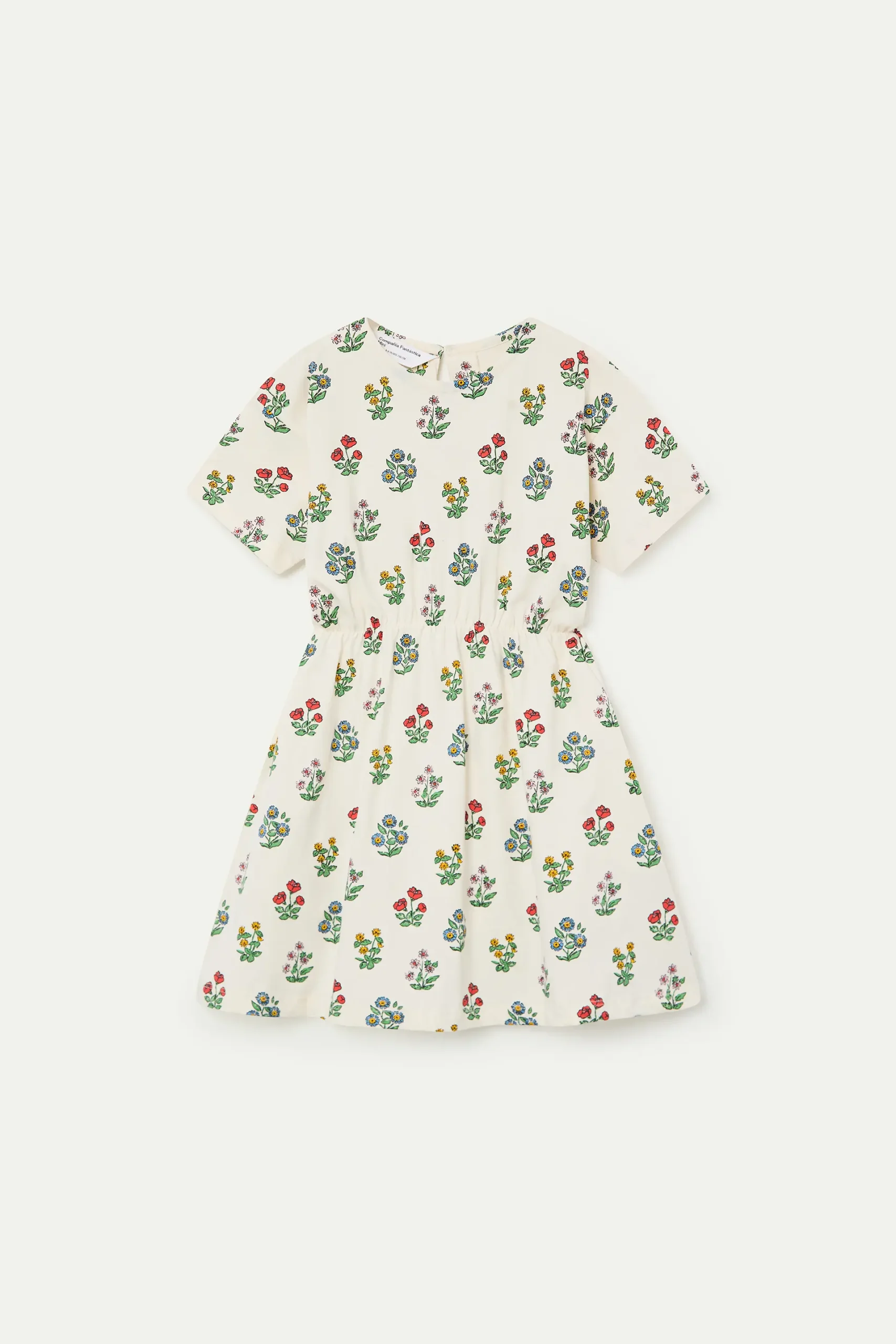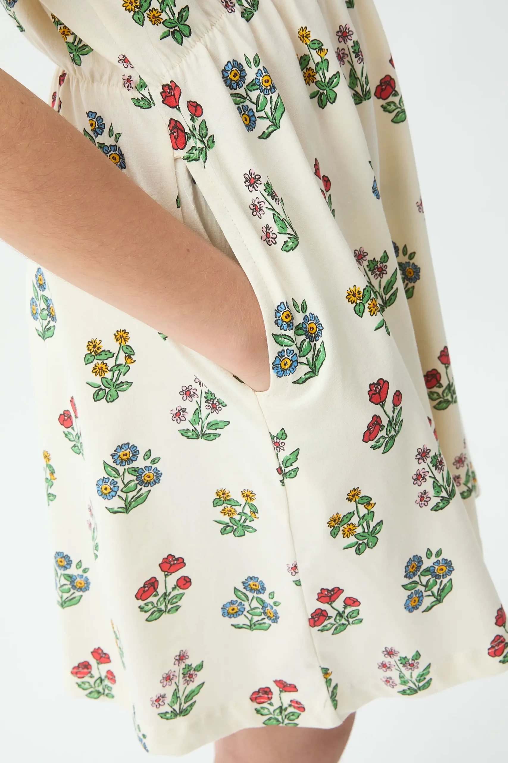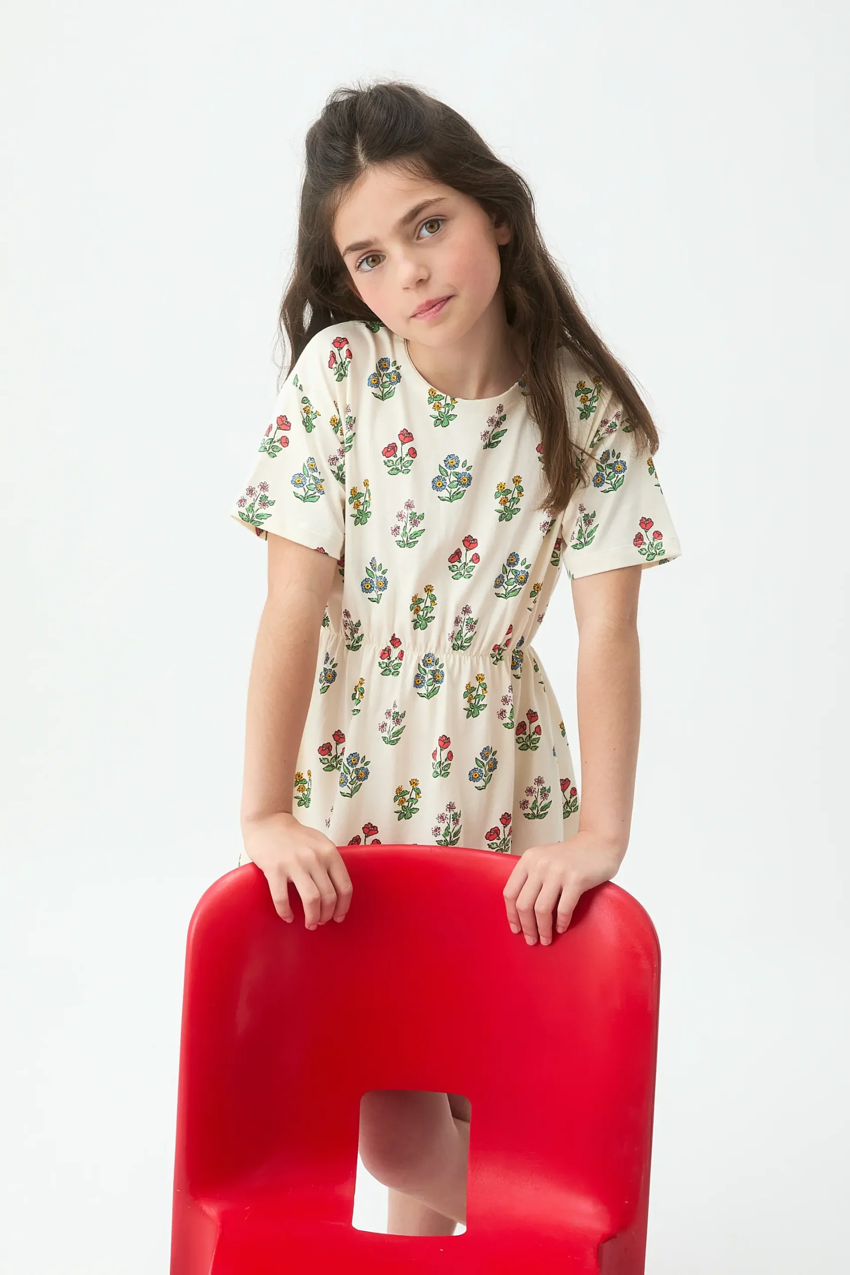 Vestido corto de niña de tejido 100% algodón con estampado gardener. Cuello redondo y manga corta. Cintura elástica. Bolsillos laterales. La modelo mide 135 cm y lleva la talla 8-9 años.