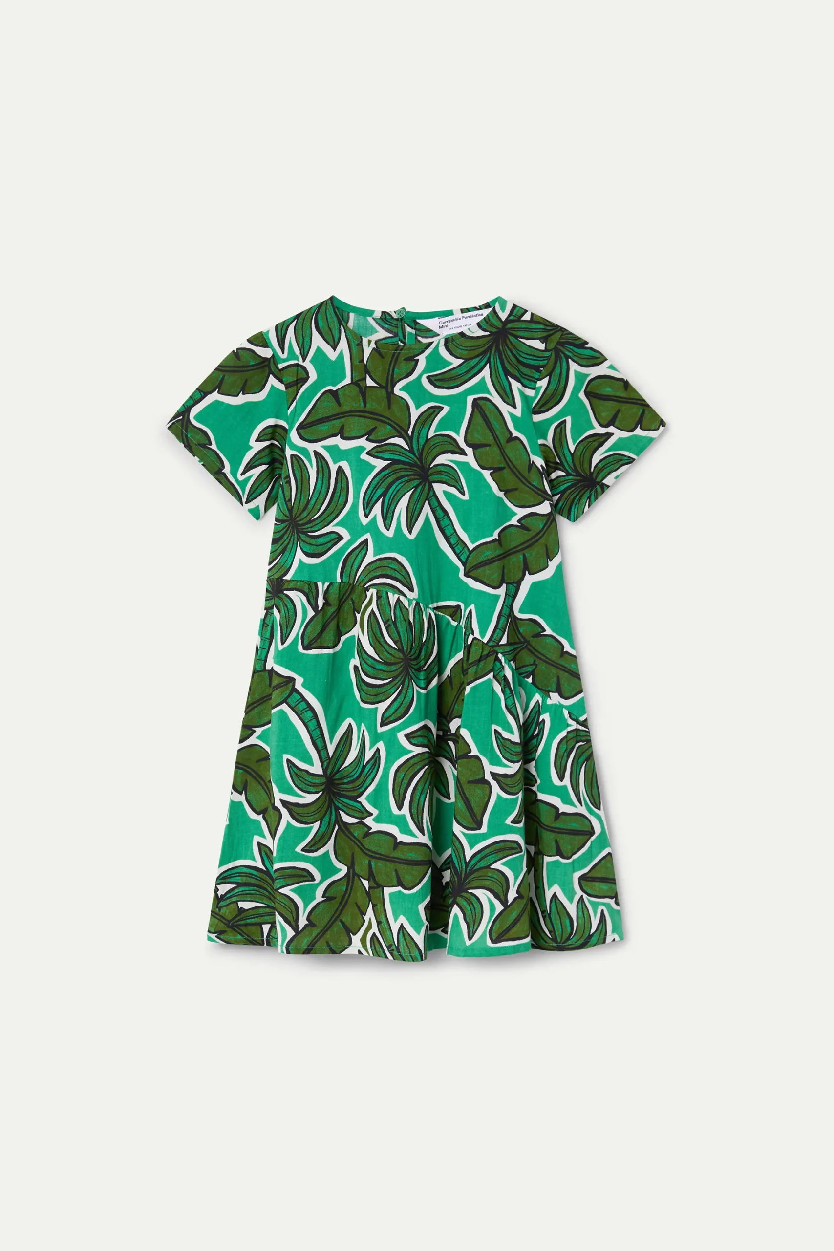 Vestido corto de niña con estampado palm tree. Cuello redondo y manga corta. Detalle de asimétrico. La modelo mide 135 cm y lleva la talla 8-9 años.