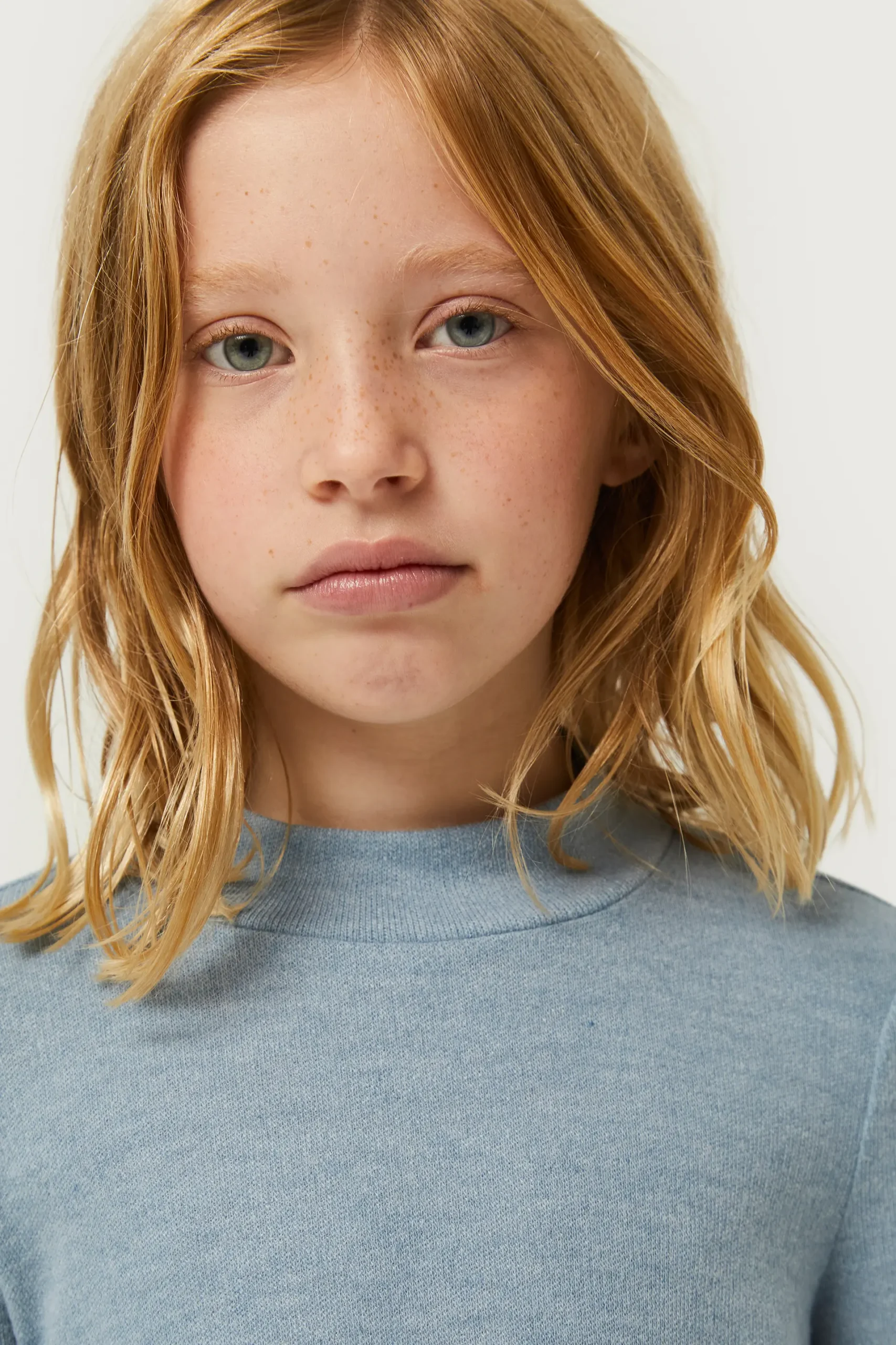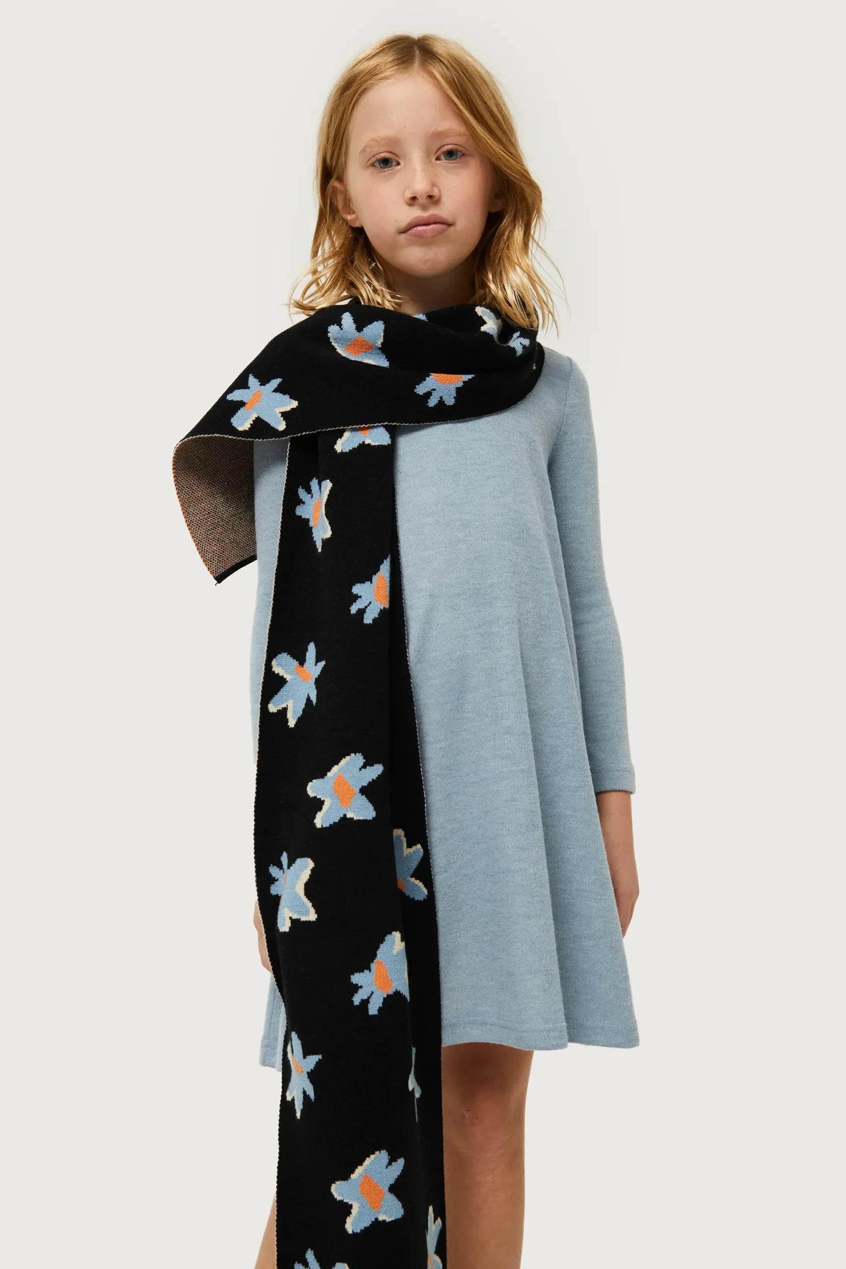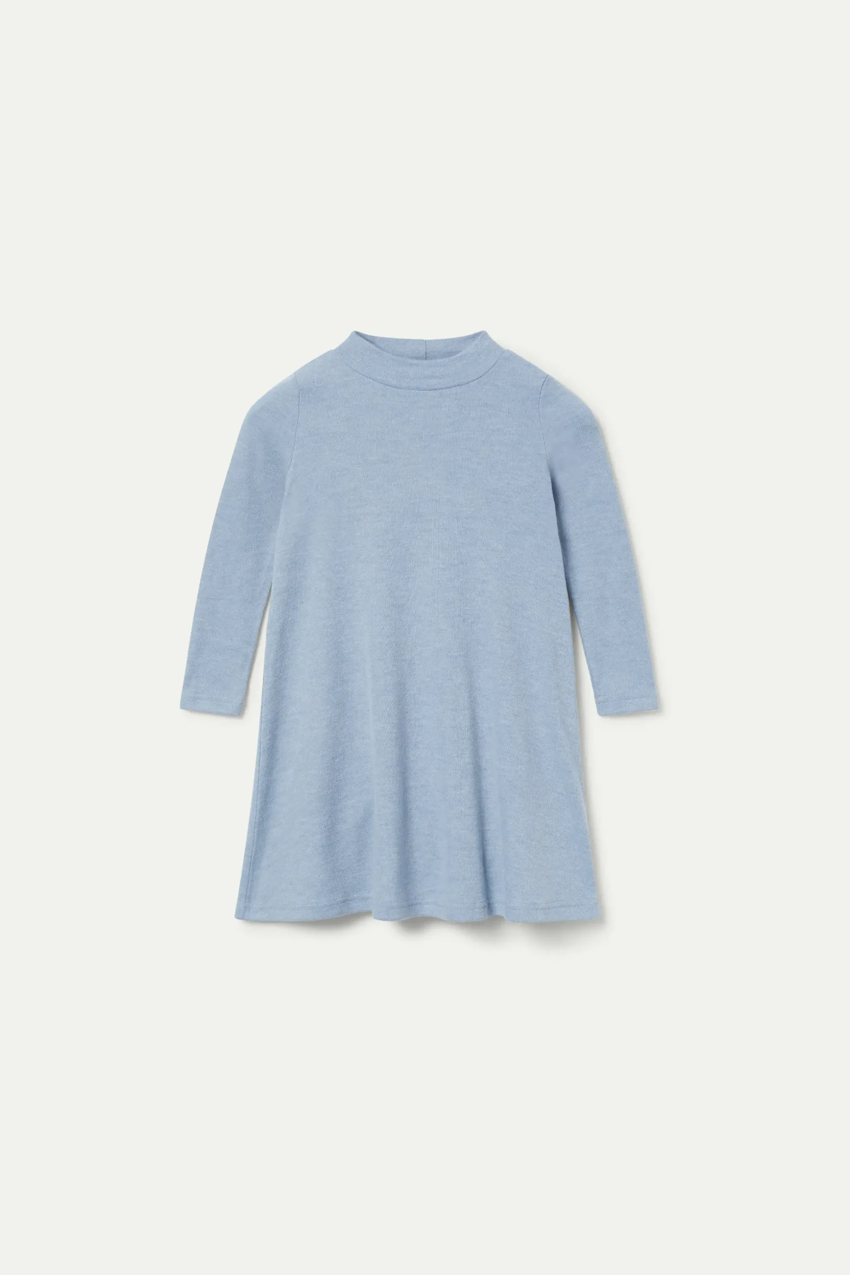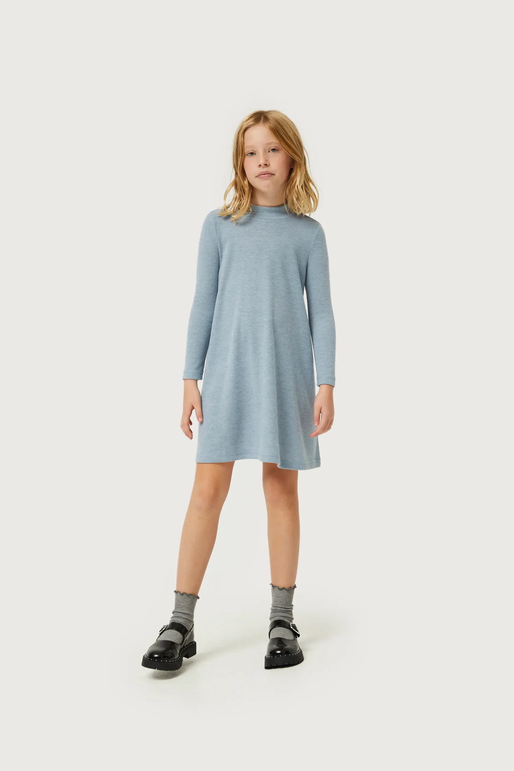 Vestido corto de niña en punto de color azul. Con cuello perkins y manga larga. La modelo mide 137 cm y lleva la talla 8.
