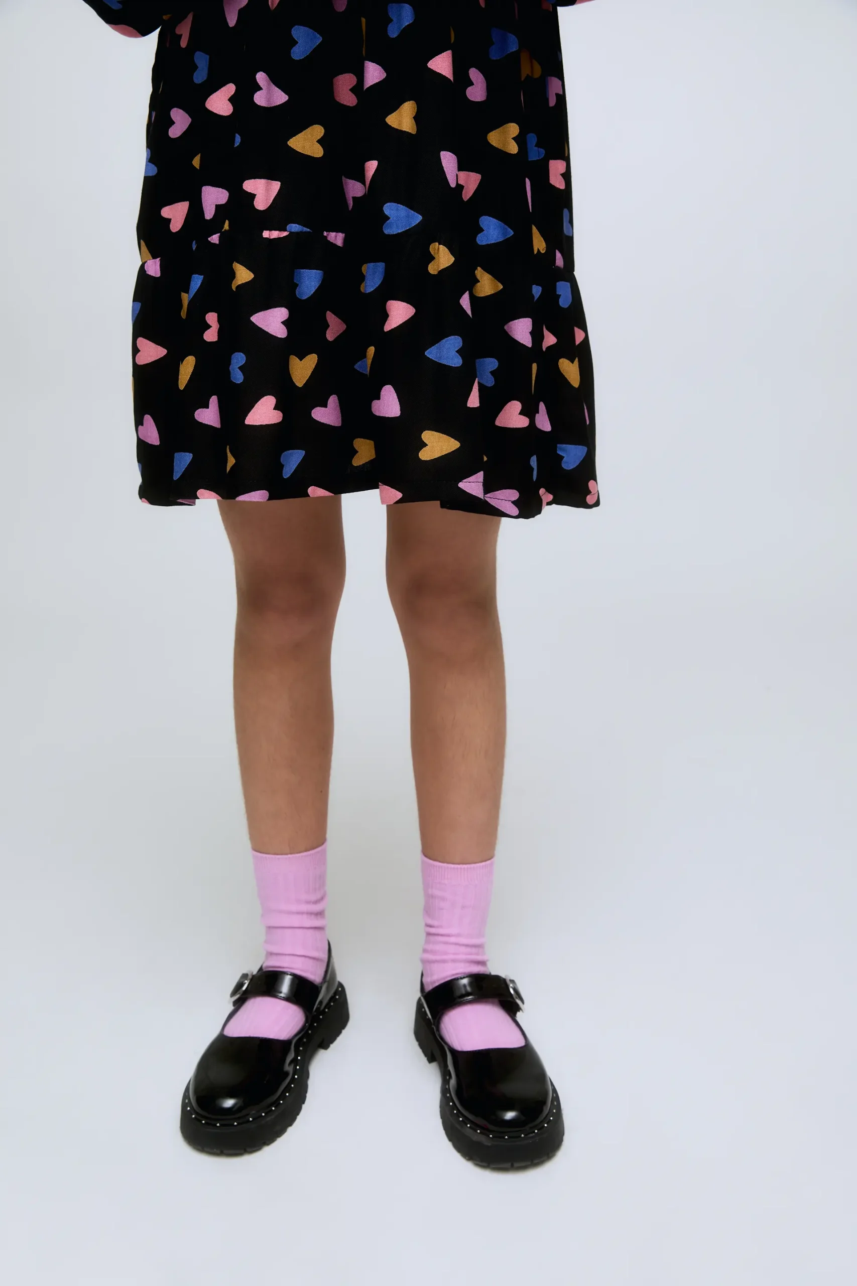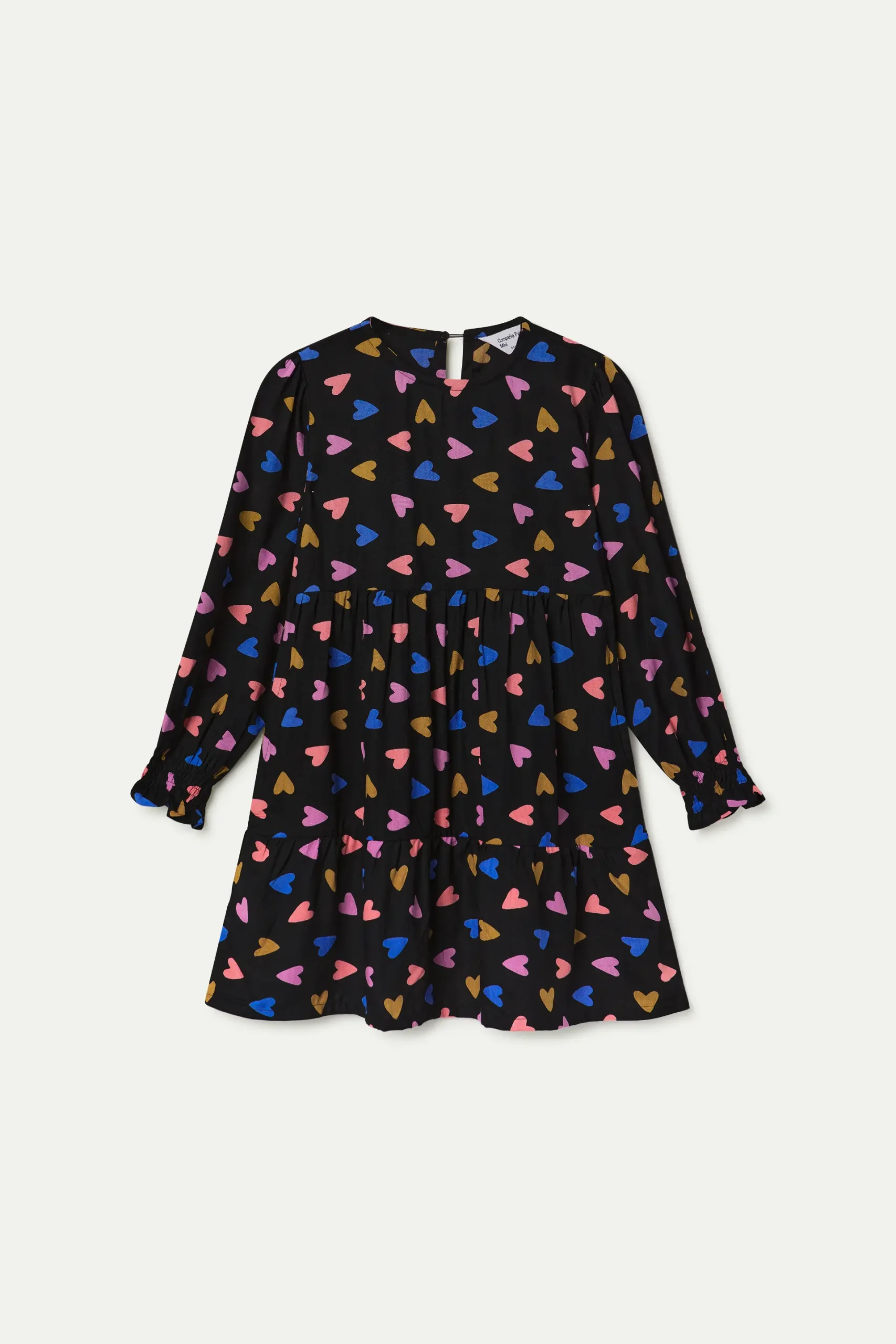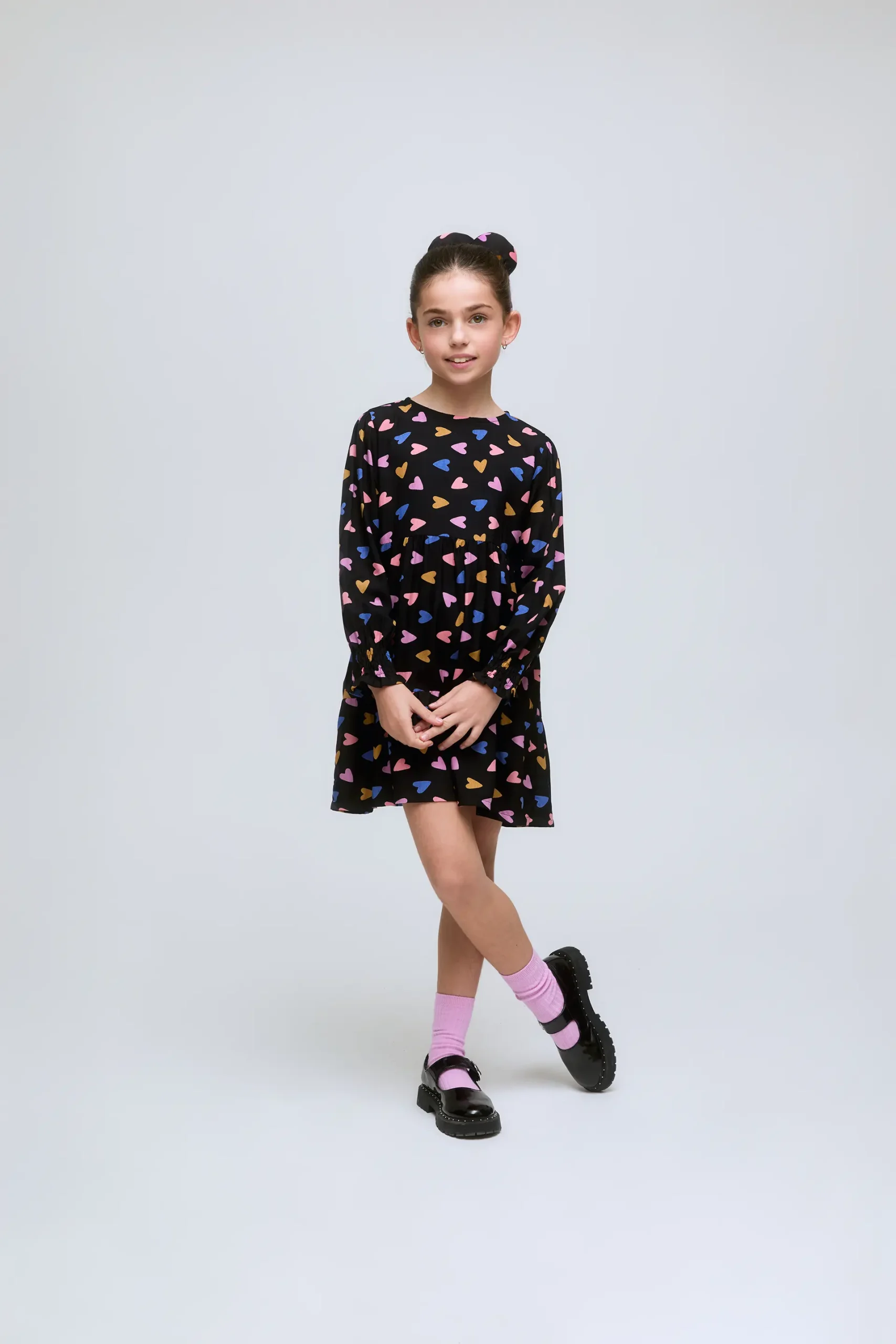 Vestido corto de niña de manga larga con estampado de corazones multicolor Porpourri. Con frunces en los puños, cierre de botón en la parte de atrás y cintura fruncida.